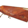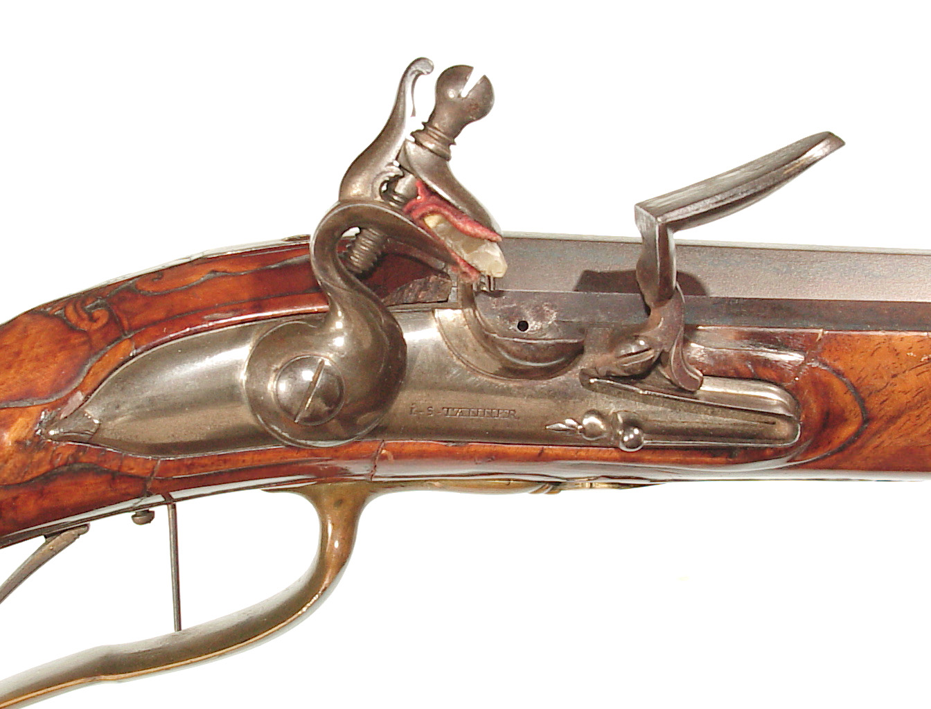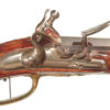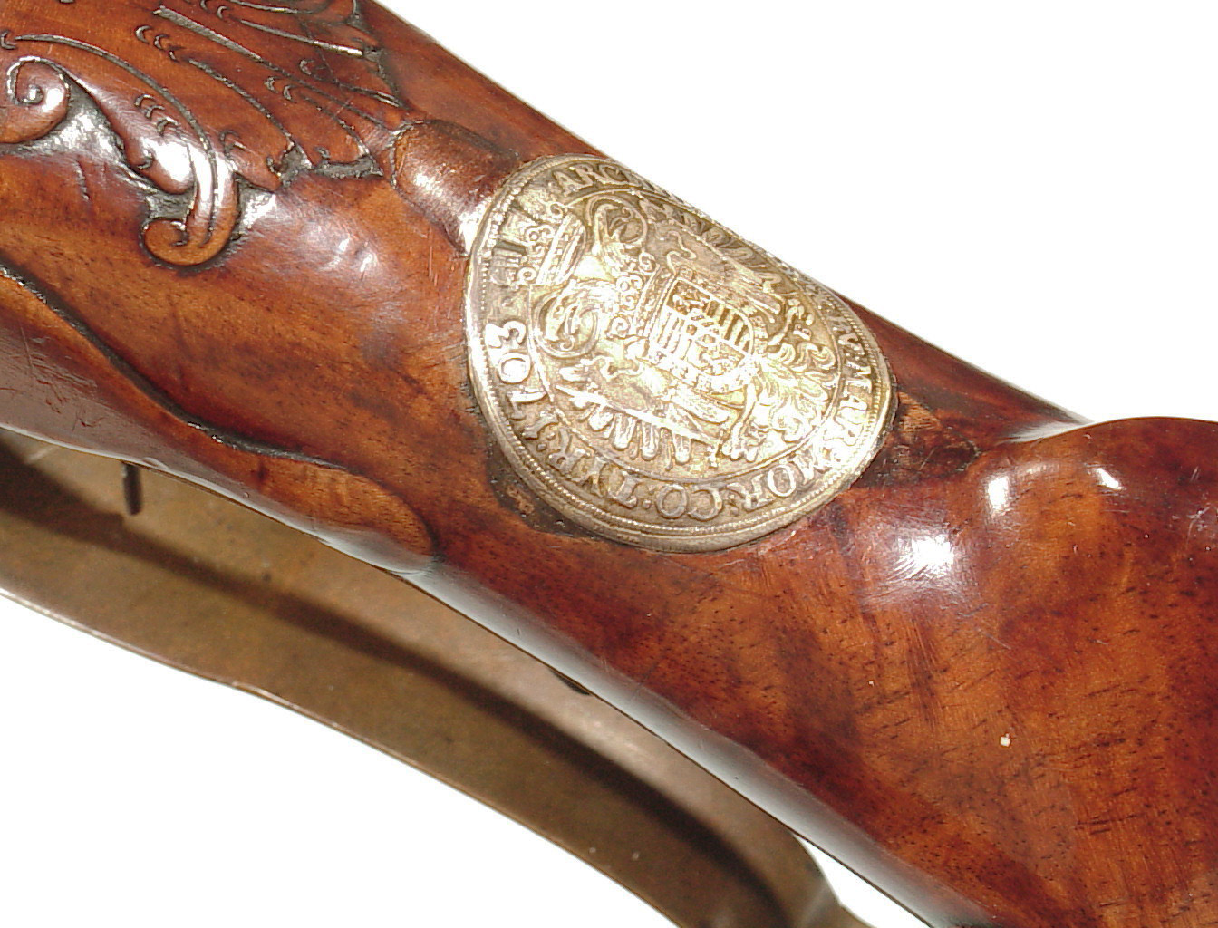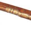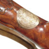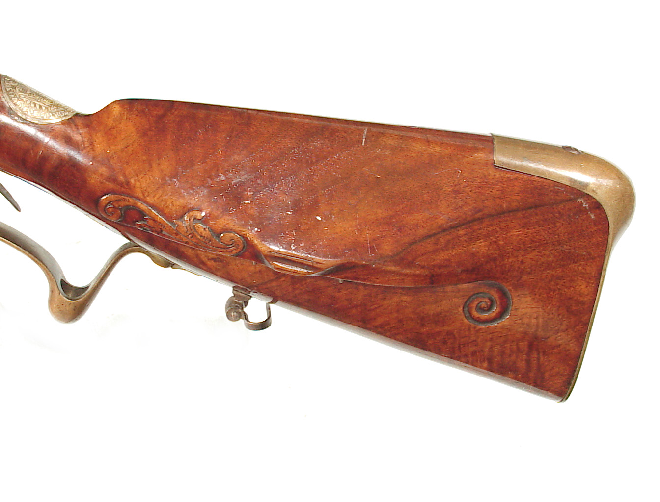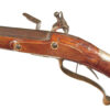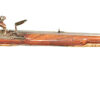 .68 caliber, 28″ heavy swamped octagon barrel. Convex lock marked “I-S- TANNER”. Full length relief carved stock with horn forend cap and sliding wooden cap-box. Brass mounts and an unusual double set trigger. There is a 1703 dated “HOLY ROMAN EMPIRE” Thaler silver coin inlaid into the wrist. A beautiful example with what appears to have been an early restoration now retaining nearly all of the barrel finish. Bright lock and mellow unpolished brass mounts. Lovely wood and carving. Tanner worked in Hanover from 1761-1807.