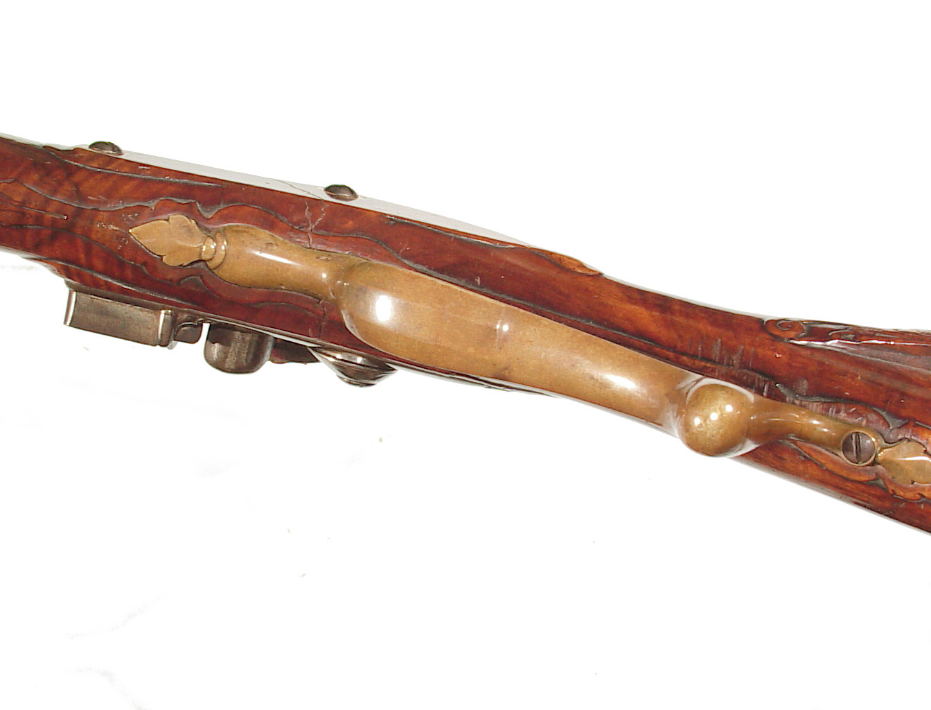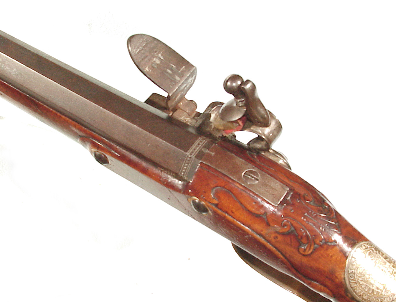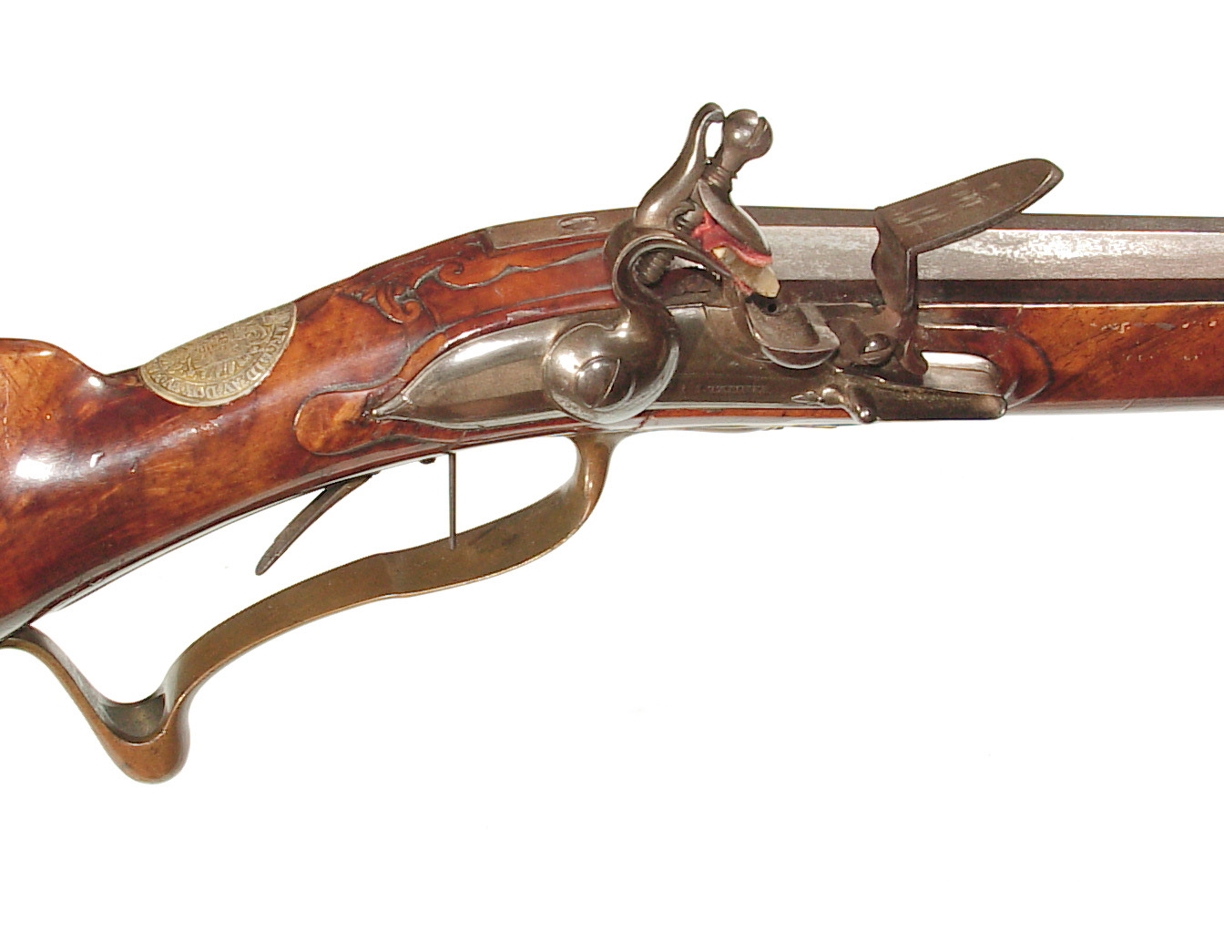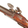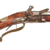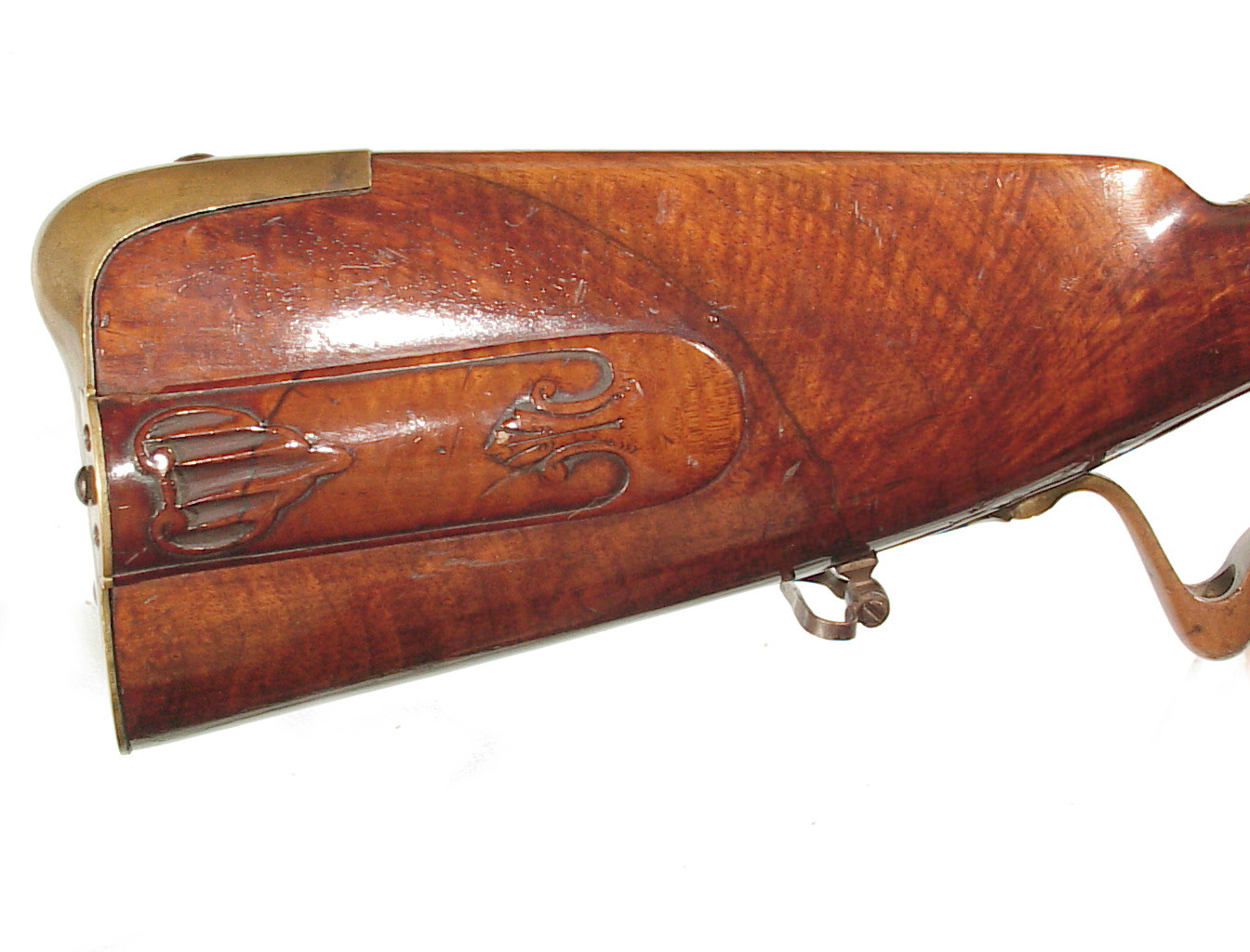 .68 caliber, 28″ heavy swamped octagon barrel. Convex lock marked “I-S- TANNER”. Full length relief carved stock with horn forend cap and sliding wooden cap-box. Brass mounts and an unusual double set trigger. There is a 1703 dated “HOLY ROMAN EMPIRE” Thaler silver coin inlaid into the wrist. A beautiful example with what appears to have been an early restoration now retaining nearly all of the barrel finish. Bright lock and mellow unpolished brass mounts. Lovely wood and carving. Tanner worked in Hanover from 1761-1807.