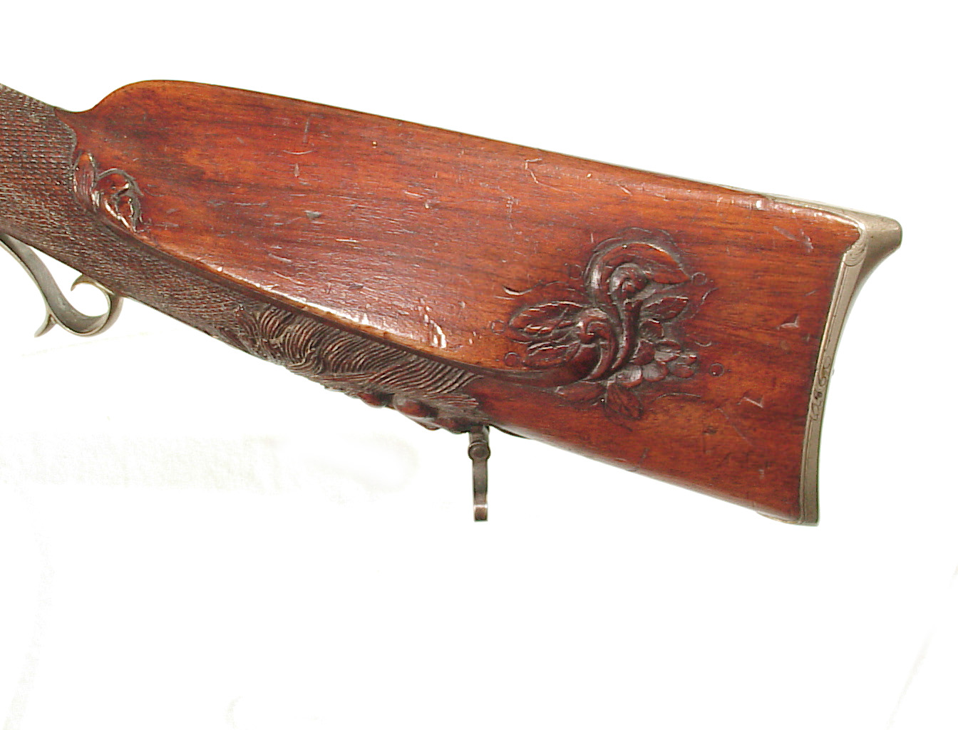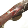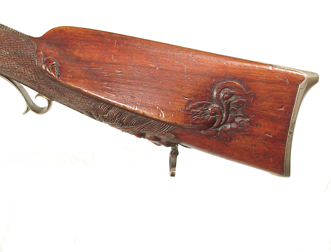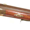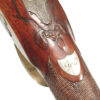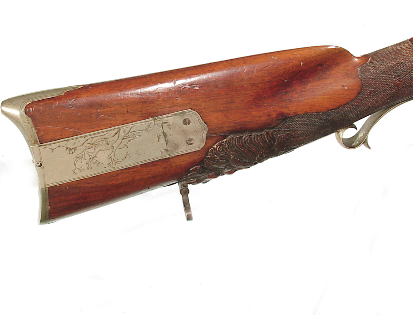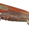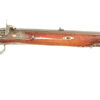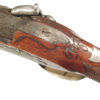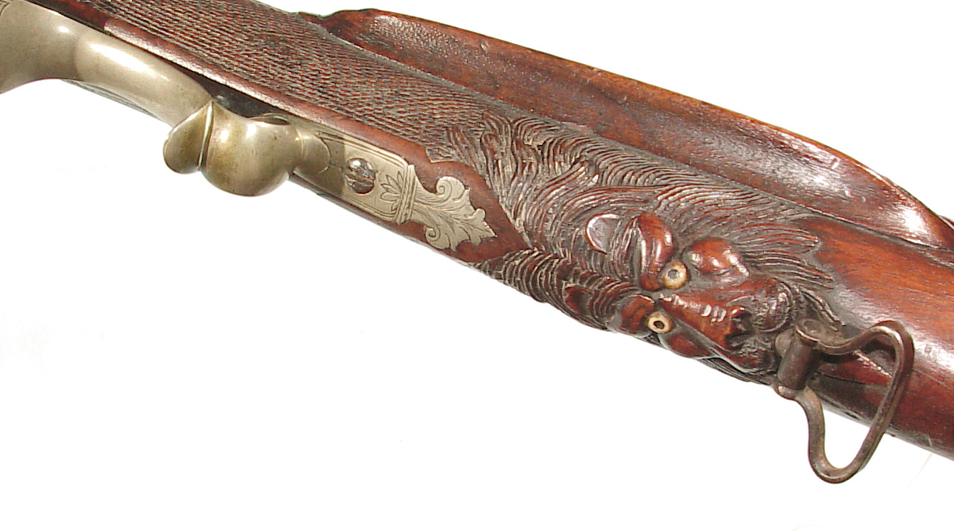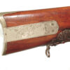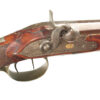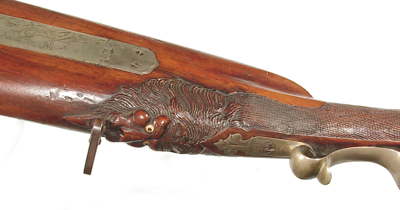 German Jager rifle by P.G. Brockman in Rostock. Very large .75 caliber with heavy rifling swamped barrel. Gun is fitted with German silver mounts. Gun has double set triggers and stock is well carved with floral motifs and animal head. Barrel is 25 3/4″ and overall length in 41″. This is a fine Jager rifle.