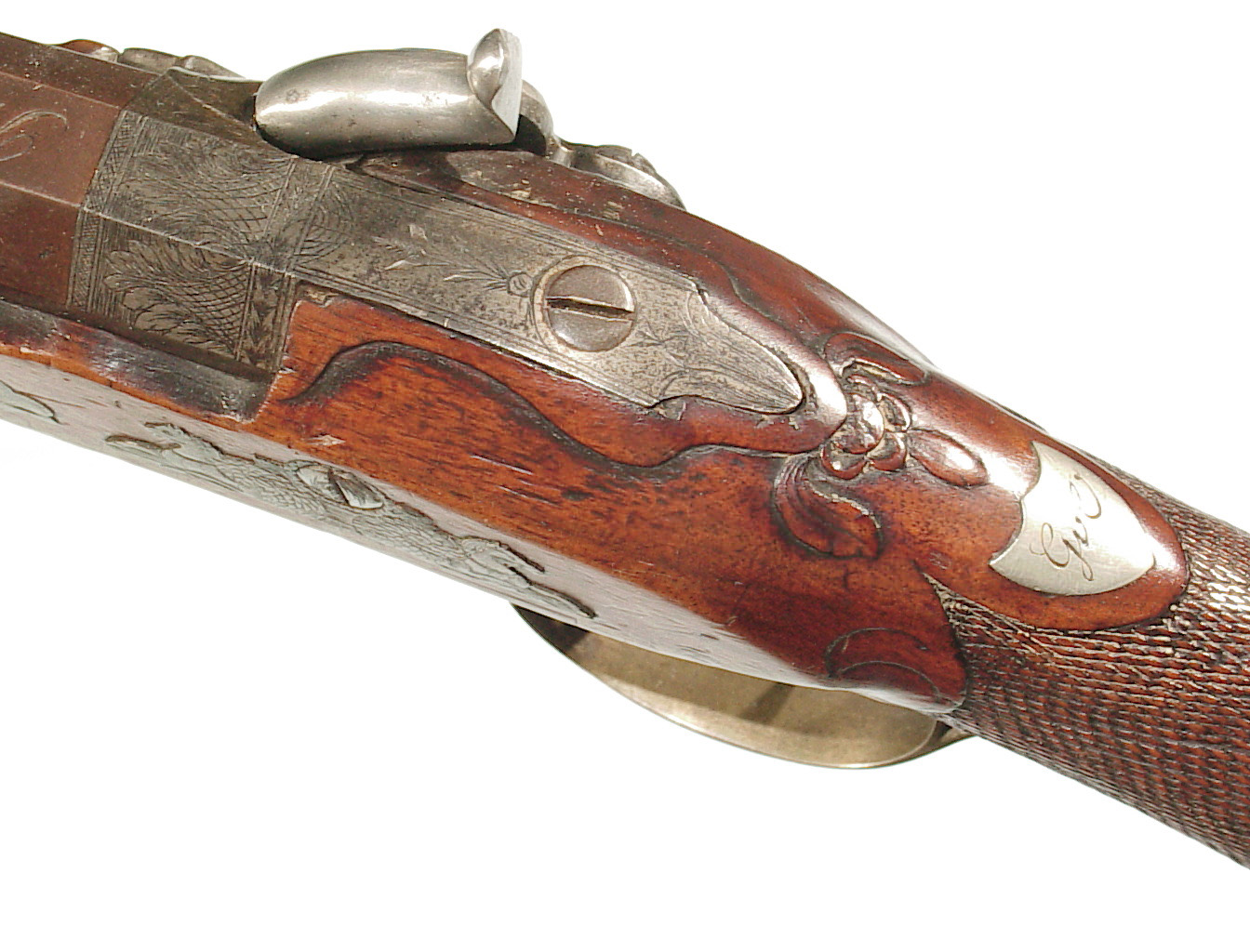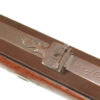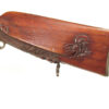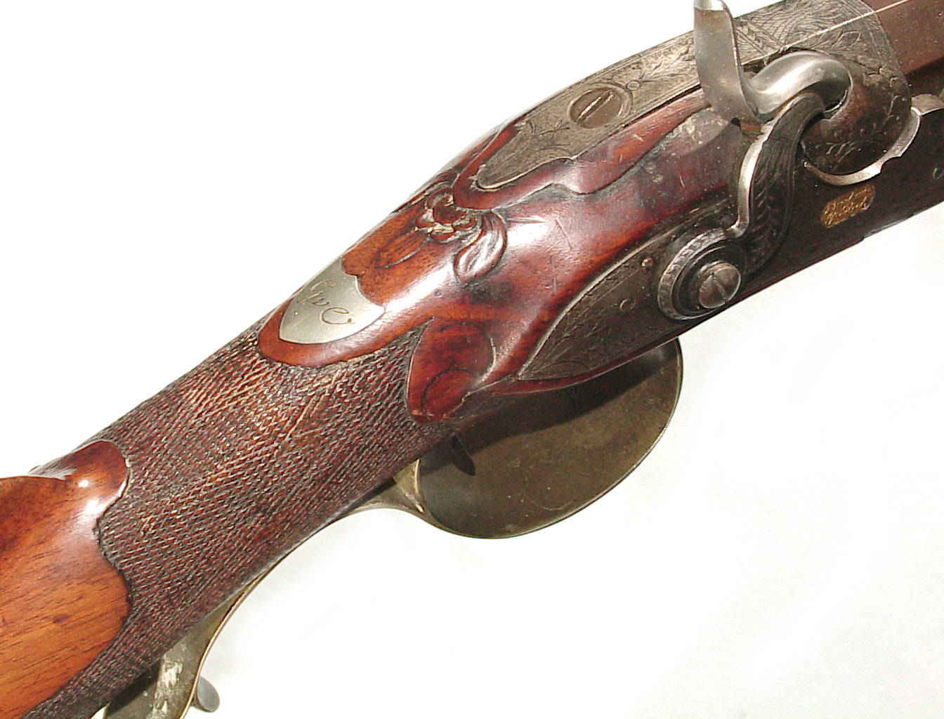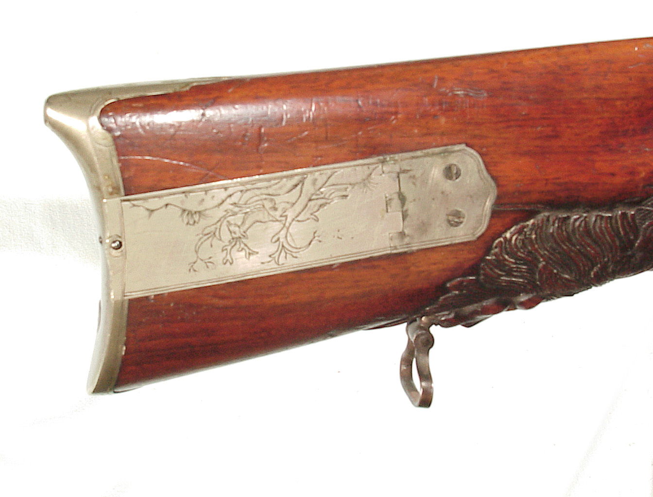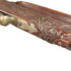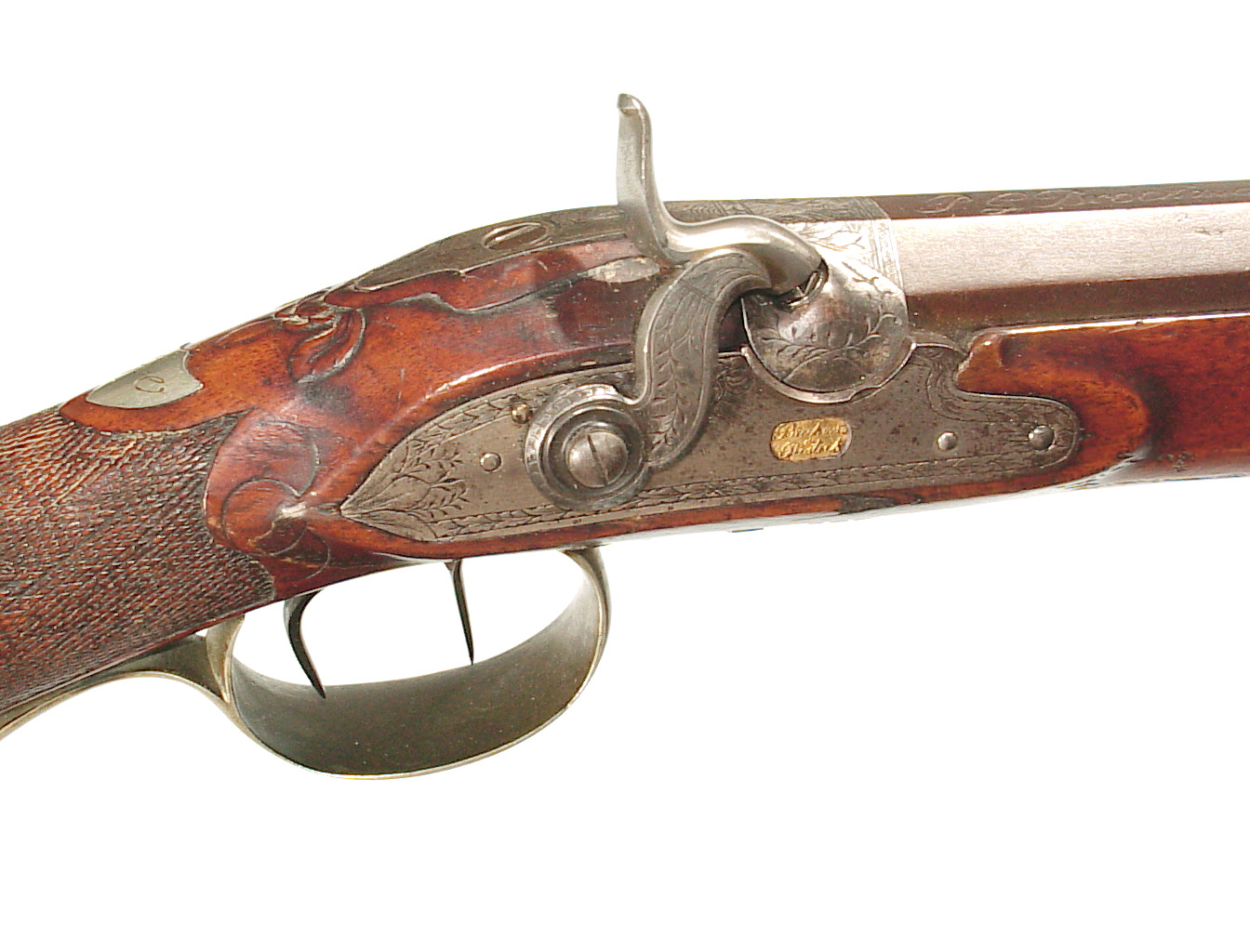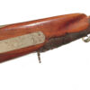 German Jager rifle by P.G. Brockman in Rostock. Very large .75 caliber with heavy rifling swamped barrel. Gun is fitted with German silver mounts. Gun has double set triggers and stock is well carved with floral motifs and animal head. Barrel is 25 3/4″ and overall length in 41″. This is a fine Jager rifle.