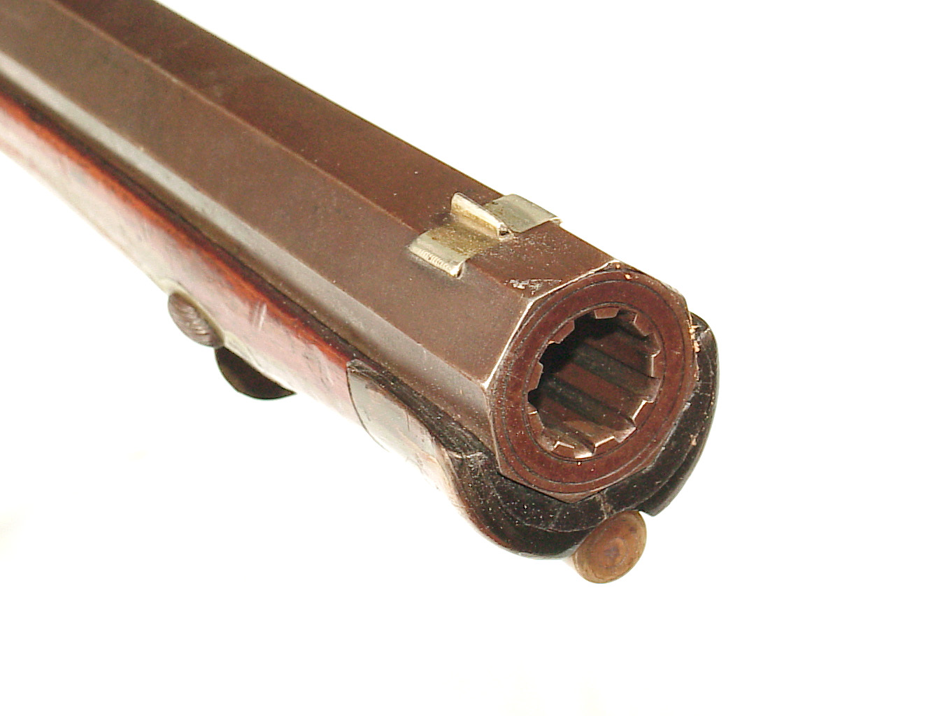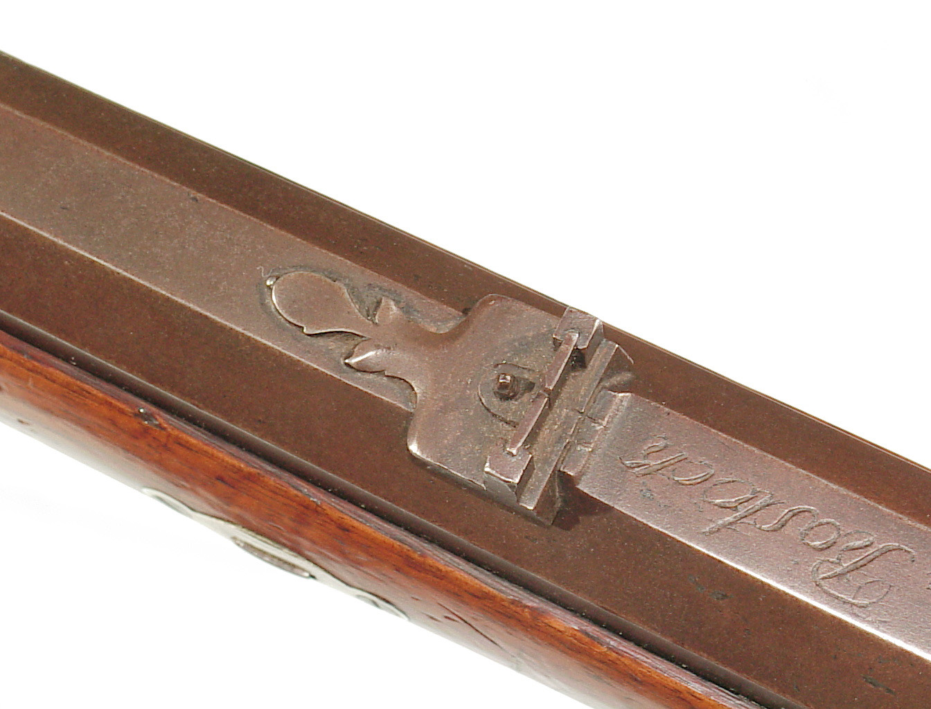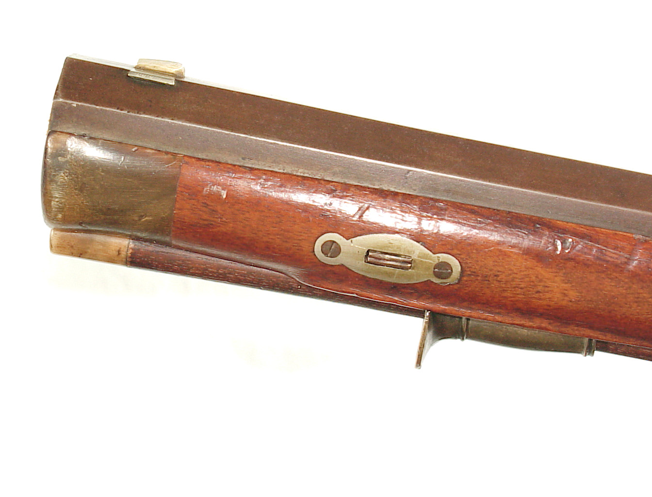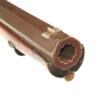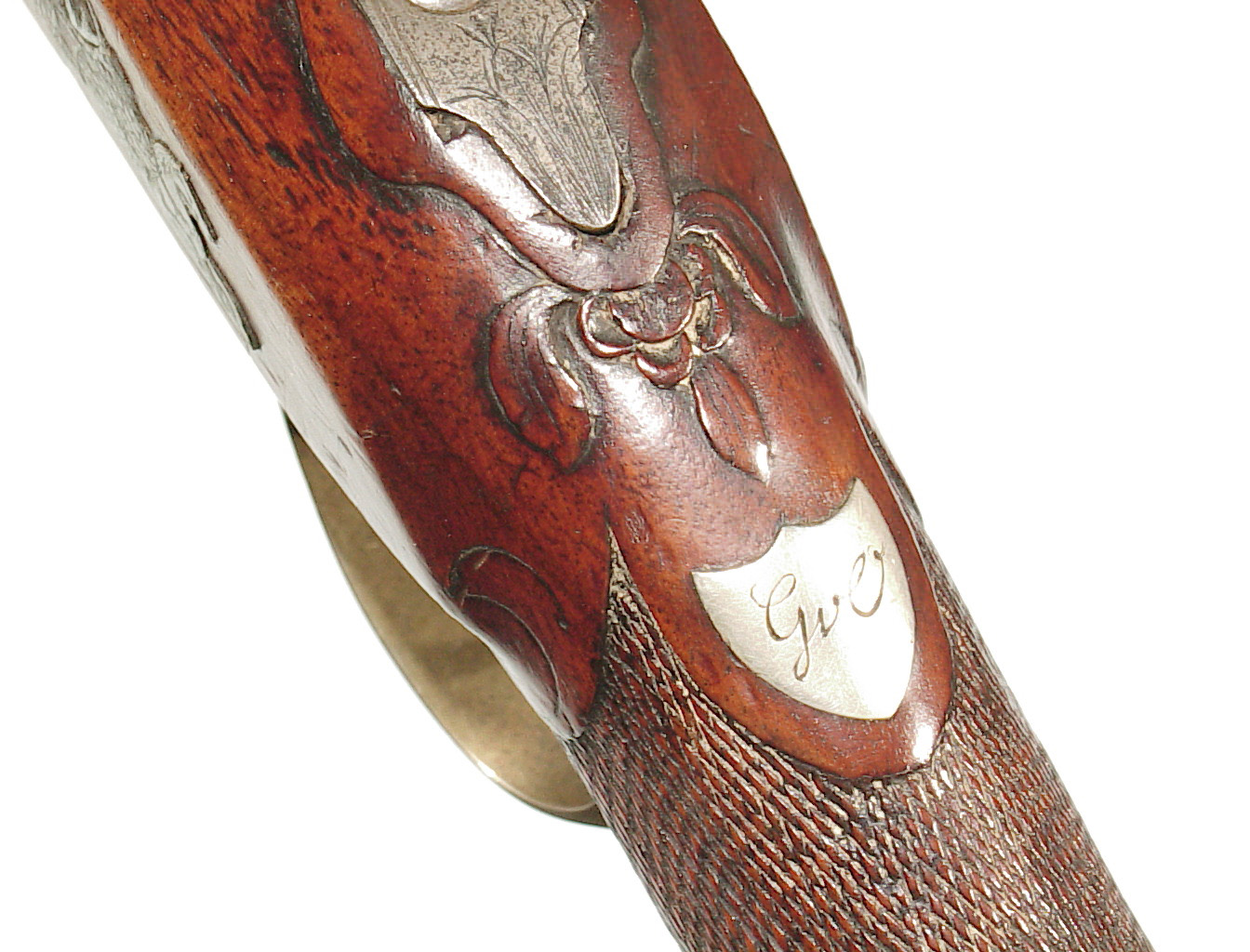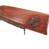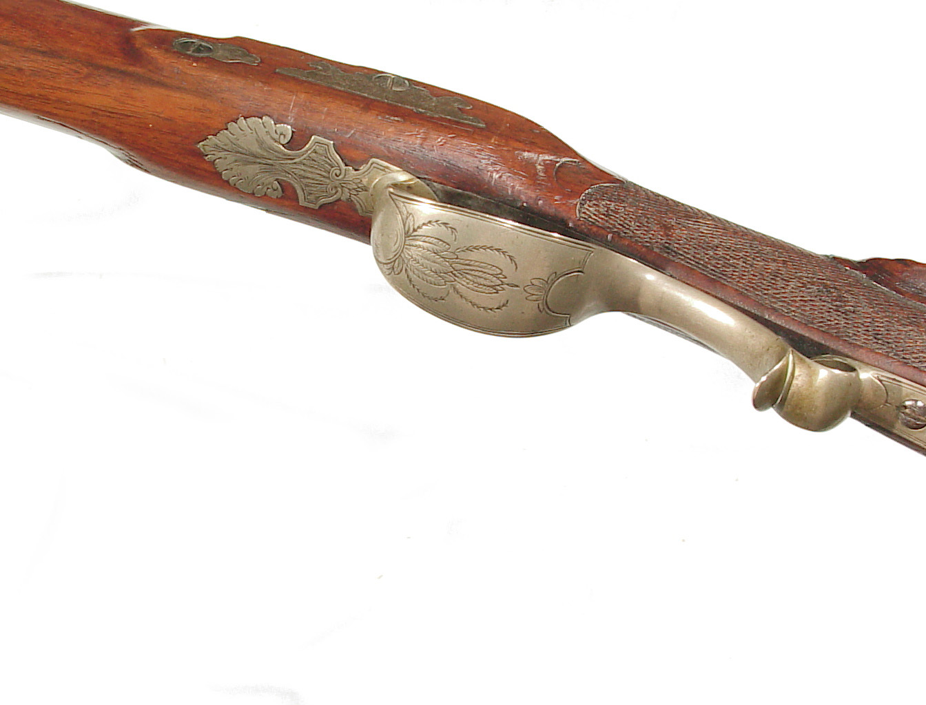 German Jager rifle by P.G. Brockman in Rostock. Very large .75 caliber with heavy rifling swamped barrel. Gun is fitted with German silver mounts. Gun has double set triggers and stock is well carved with floral motifs and animal head. Barrel is 25 3/4″ and overall length in 41″. This is a fine Jager rifle.