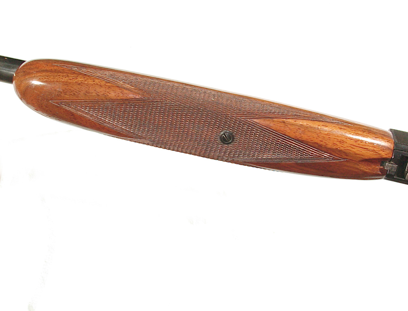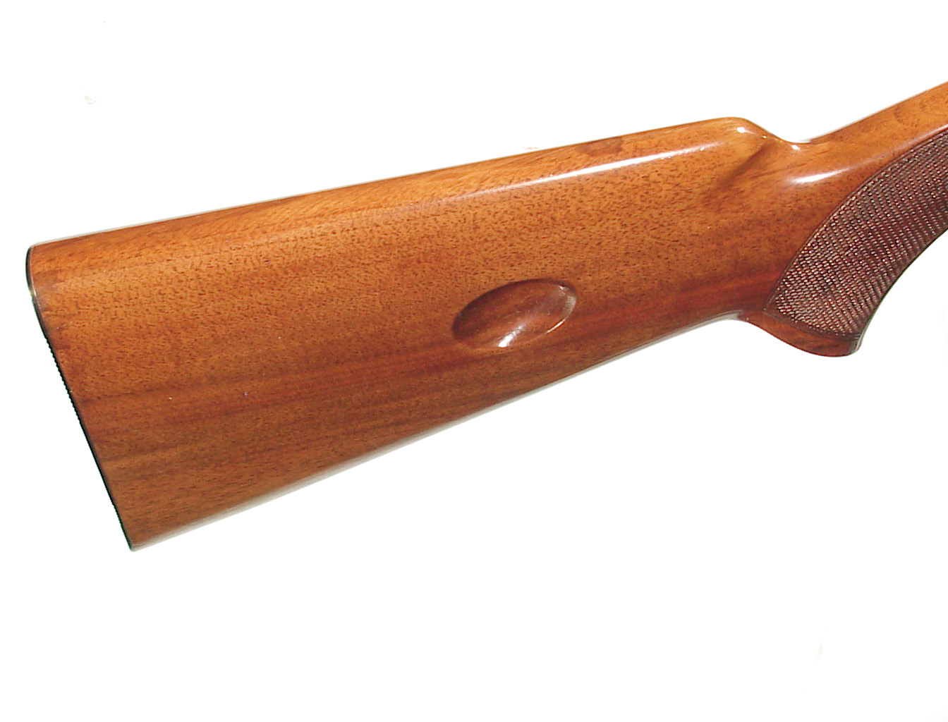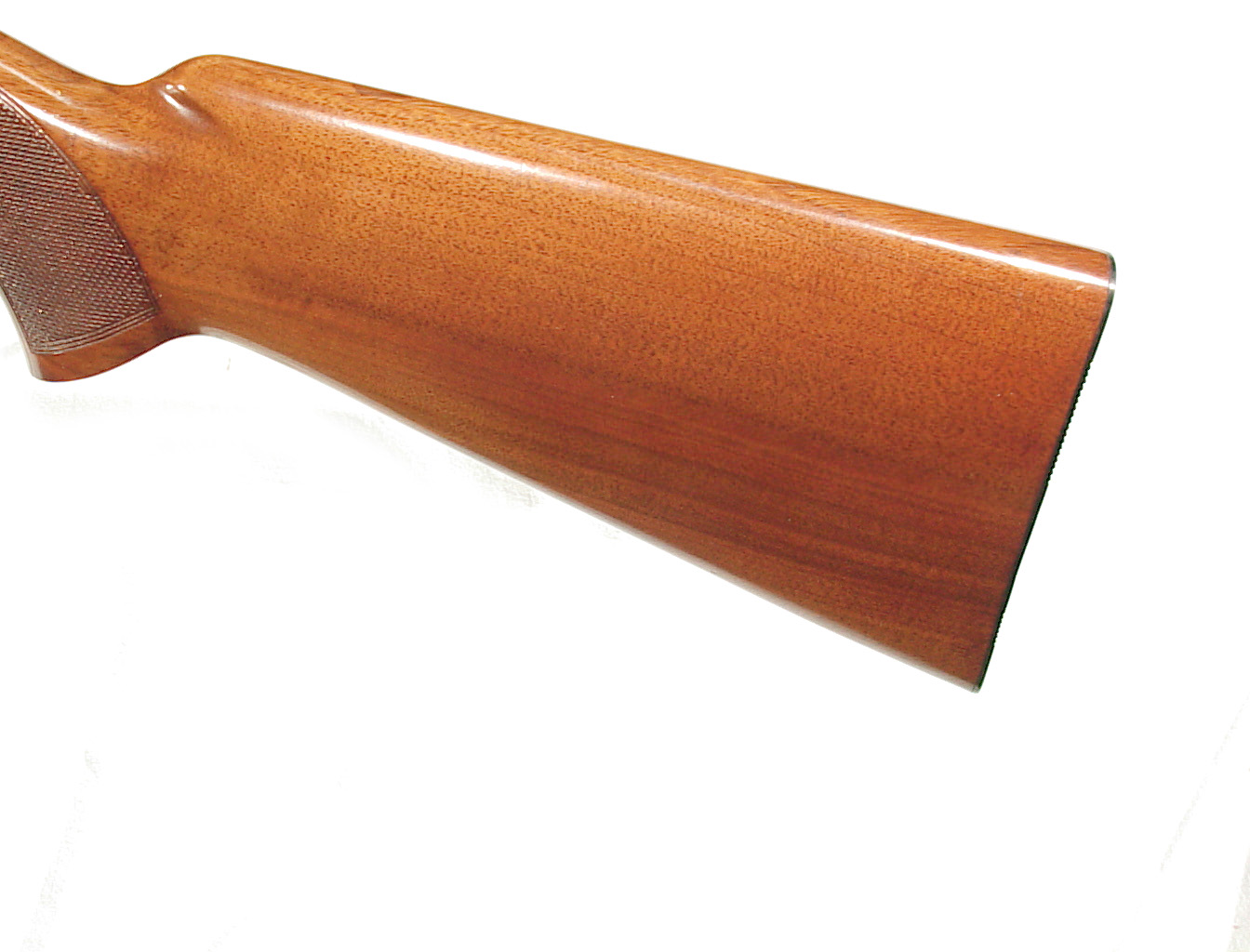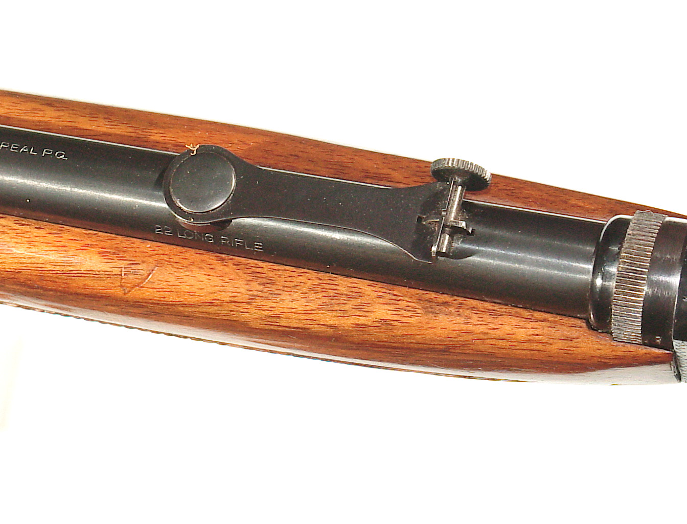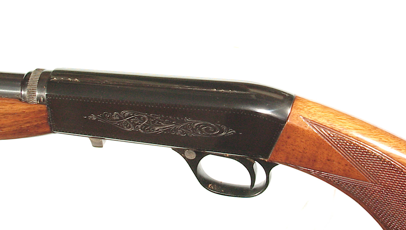 .22 long rifle, 19 1/4″ round barrel with factory take-down feature. Blade front sight and early factory “wheel” rear sight. Semi-auto engraved receiver finished blue. Checkered walnut forend and pistol grip buttstock with the magazine located in the buttstock. In as new condition retaining all of the blue, super wood and checkering. Mint bore. mfg 1956