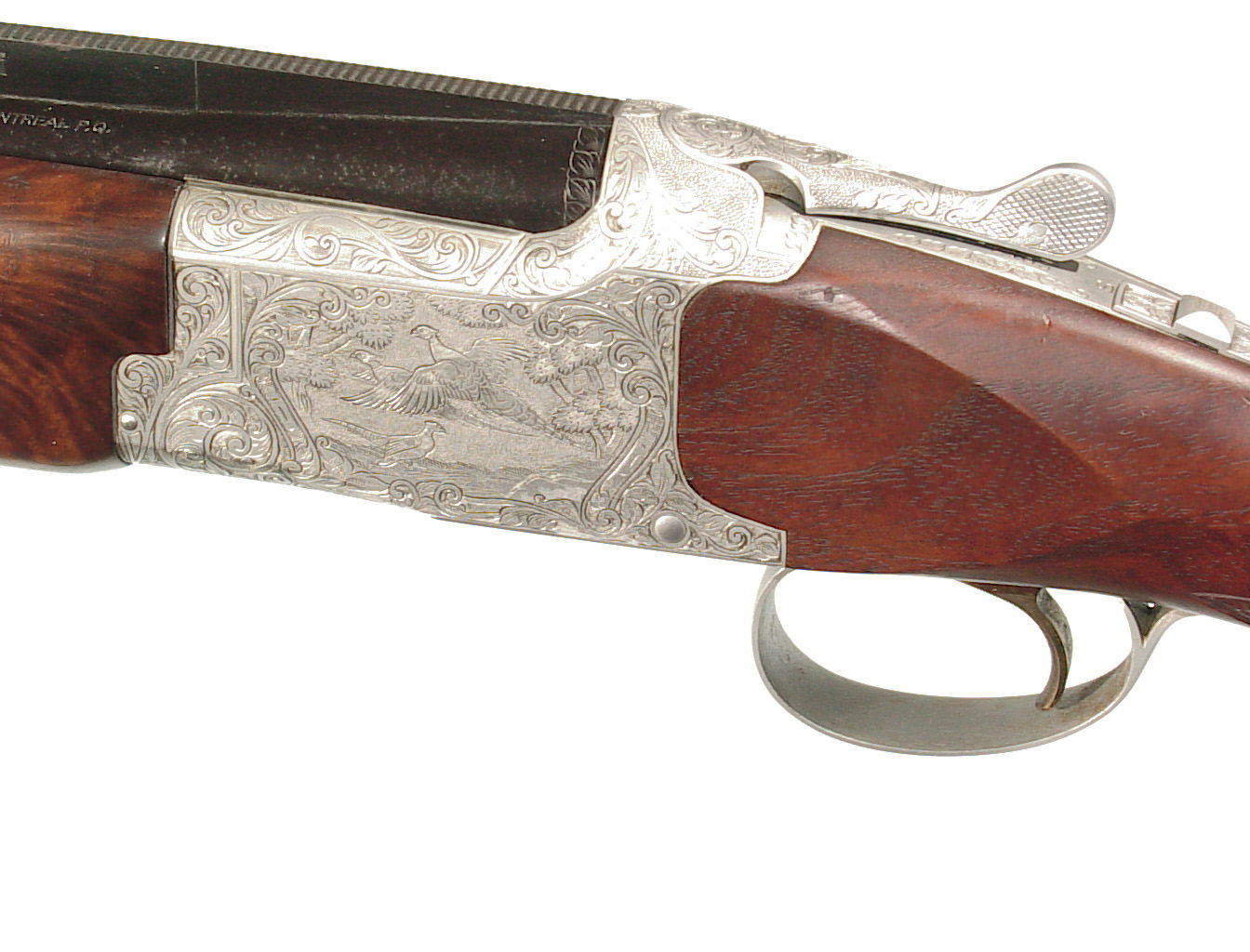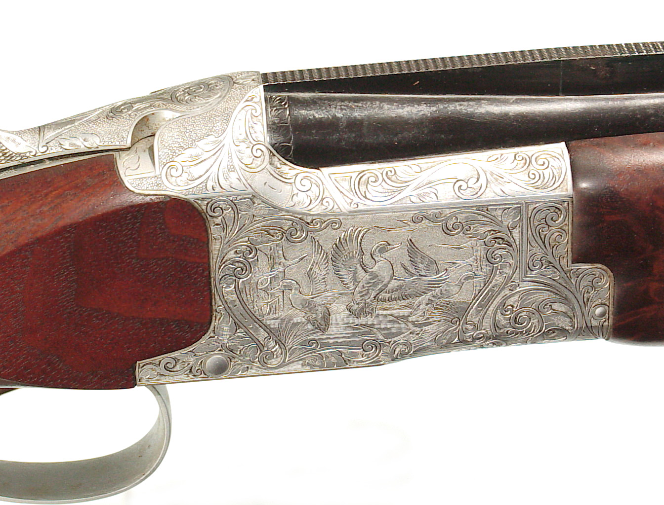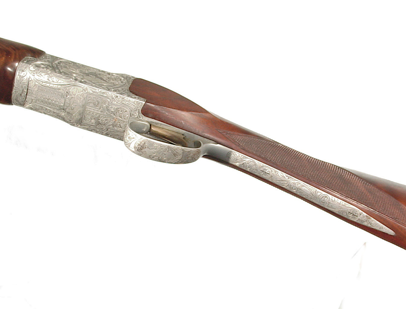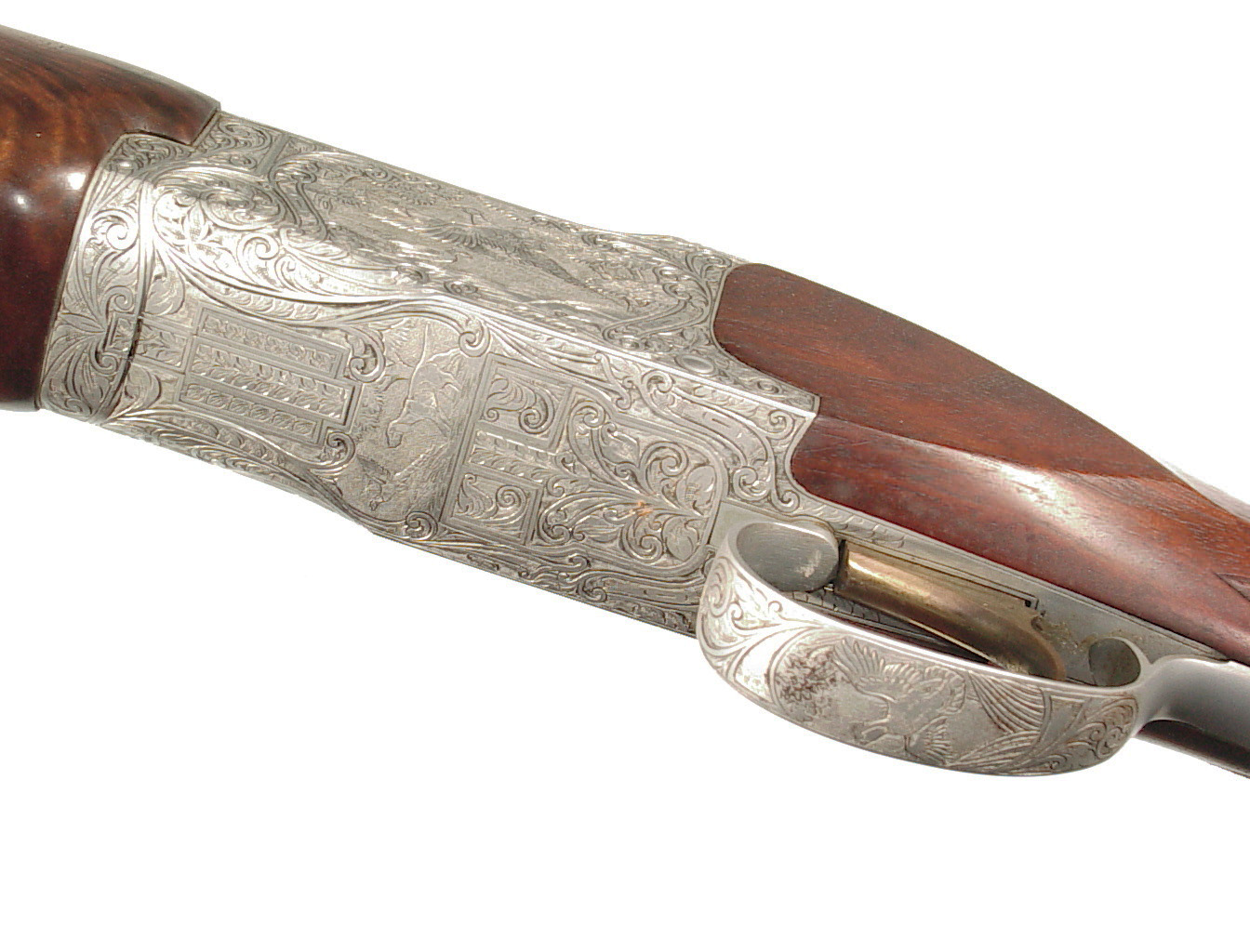 .410 gauge, 26″ vent rib barrels choked imp cylinder & modified. Beautiful game scene receiver and triggerguard with single trigger and automatic selector. Superb burl walnut oil finished stocks configured schaneble checkered forend and straight grip buttstock ending with a factory buttplate. LOP: 14 1/4″ Weight: 6 lbs 13 oz Comb: 1 1/2″ Heel: 2 1/4″ In very little or unused original condition with 99% plus blue, mint wood and checkering. Perfect bore and mechanics. Exceptional.