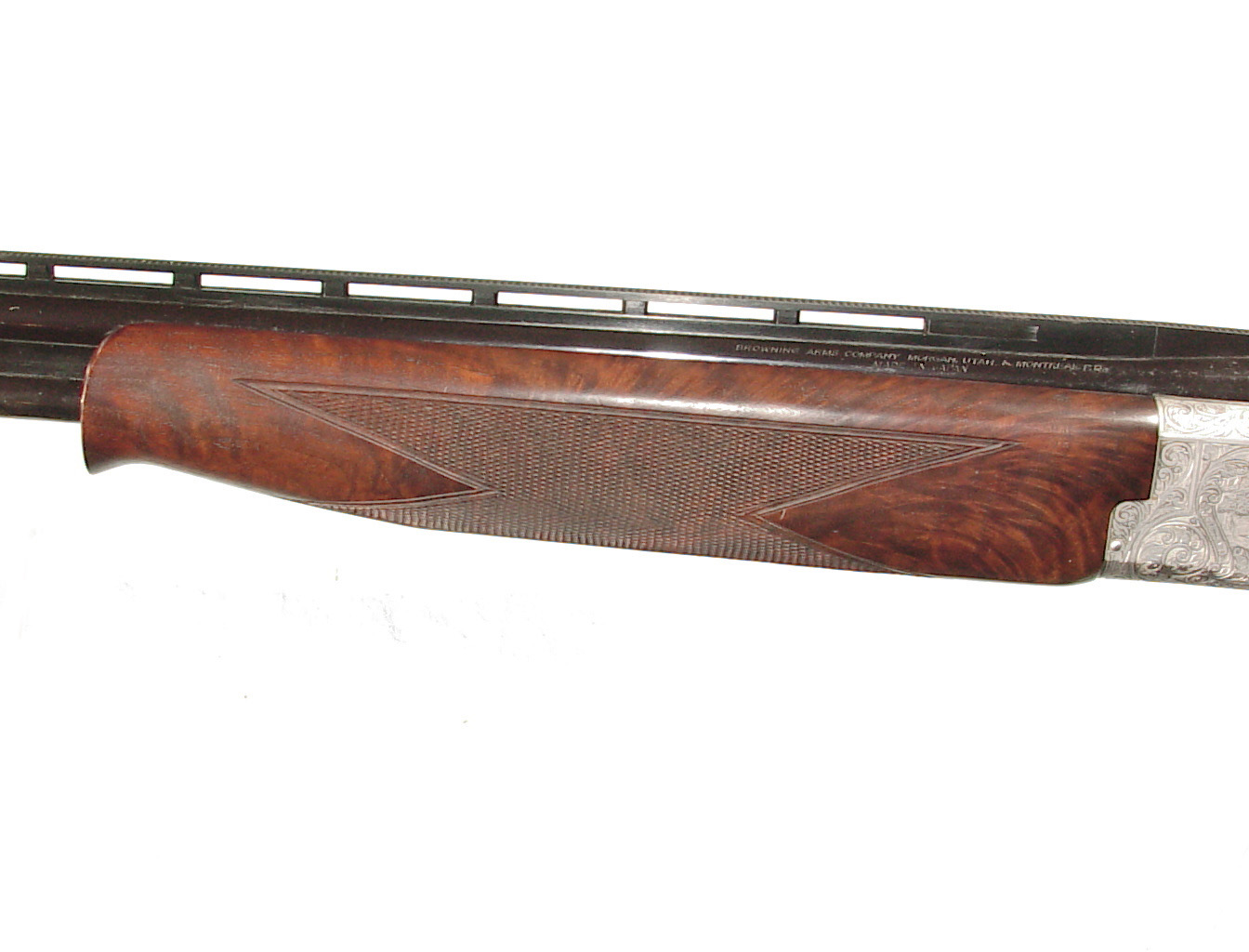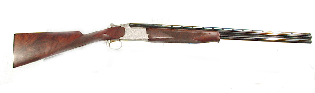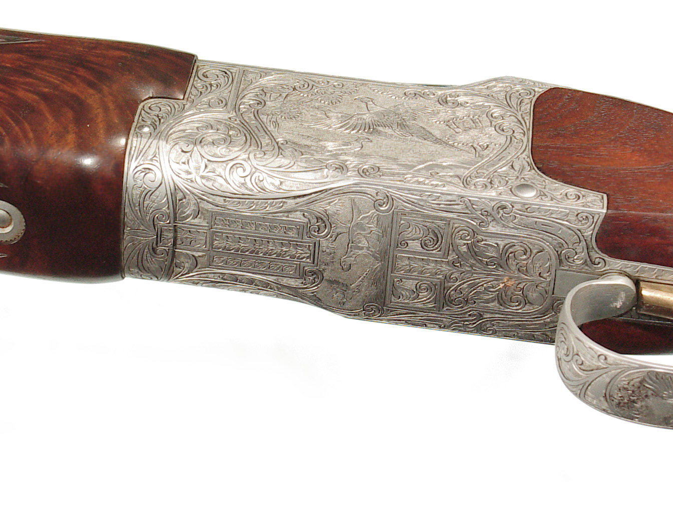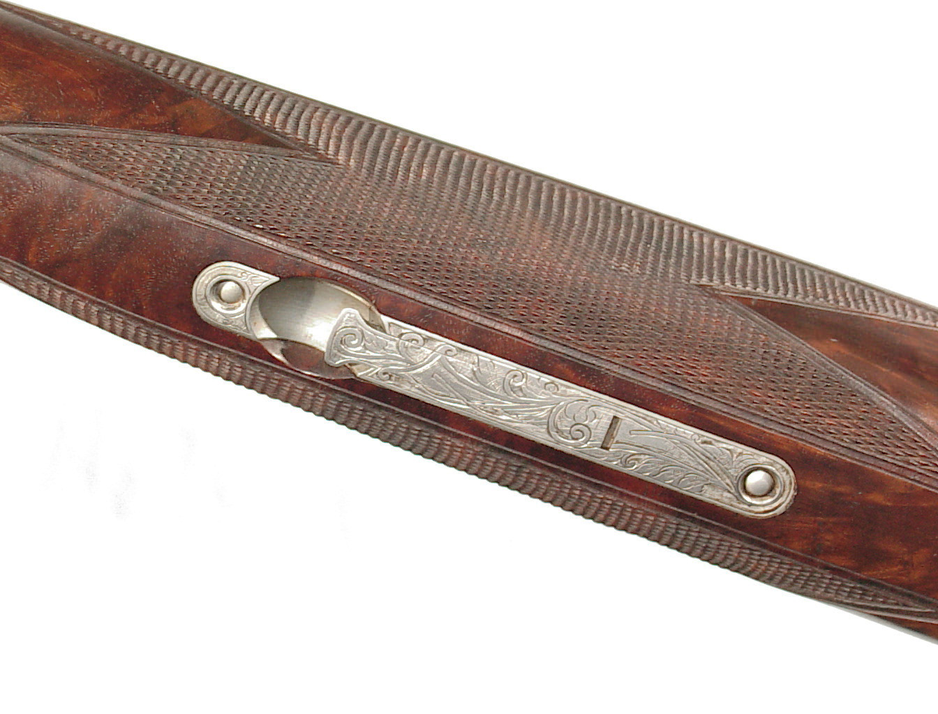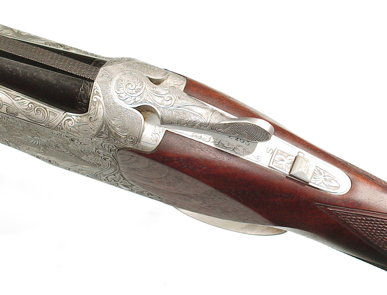 .410 gauge, 26″ vent rib barrels choked imp cylinder & modified. Beautiful game scene receiver and triggerguard with single trigger and automatic selector. Superb burl walnut oil finished stocks configured schaneble checkered forend and straight grip buttstock ending with a factory buttplate. LOP: 14 1/4″ Weight: 6 lbs 13 oz Comb: 1 1/2″ Heel: 2 1/4″ In very little or unused original condition with 99% plus blue, mint wood and checkering. Perfect bore and mechanics. Exceptional.