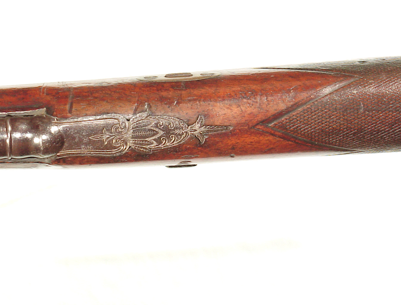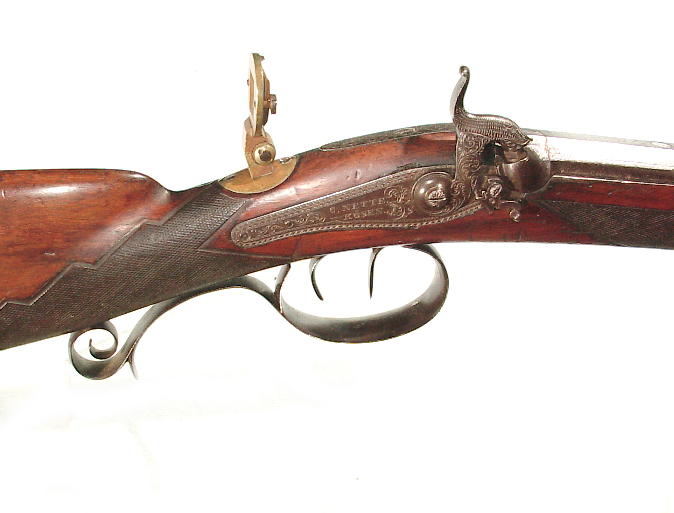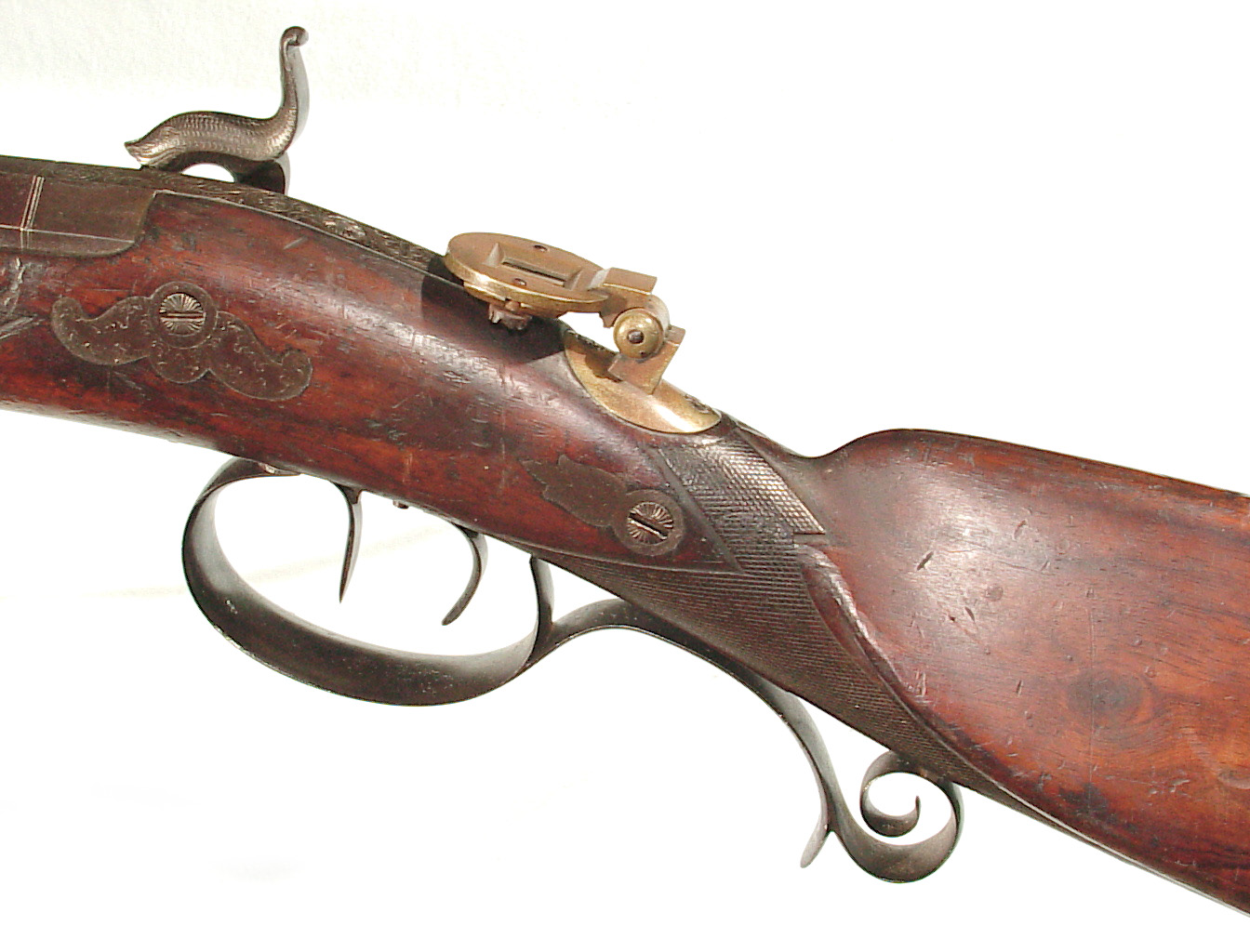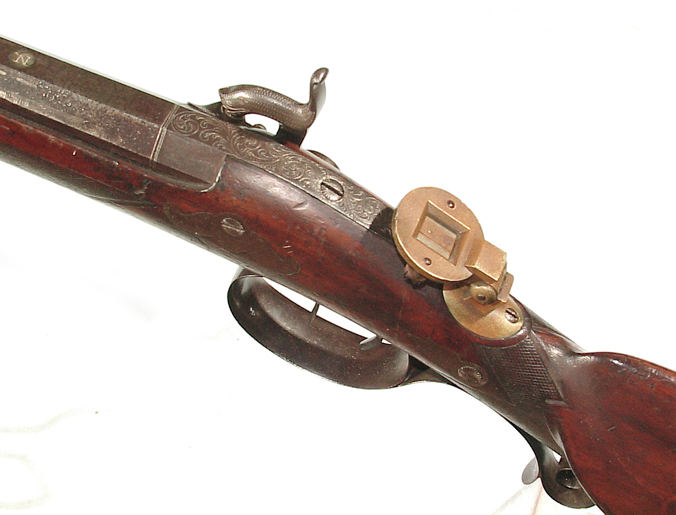 .65 caliber, 30″ full octagon swamped barrel with fine blade front sight and folding leaf rear. A flip up brass tang mounted peep sight is present and is both windage and elevation adjustable. Back action percussion lock with dolphin hammer with rotating block safety, fully engraved with maker’s name. A silver maker’s mark is on the top barrel flat (N). The triggerguard and mounts are engraved. Full length walnut stock checkered on the forend and wrist. In addition it is relief carved behind the cheekpiece. Sling swivels and original brass tipped ramrod, and wooden sliding patchbox. In lovely condition showing use but nicely cared for with bright bore and free of damage. Mechanically excellent.