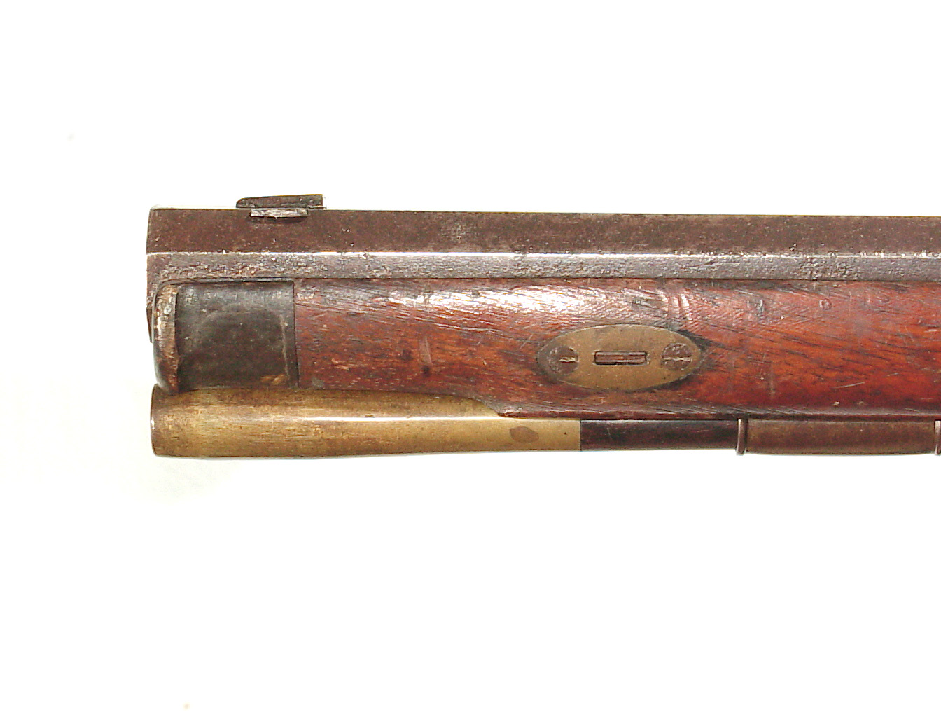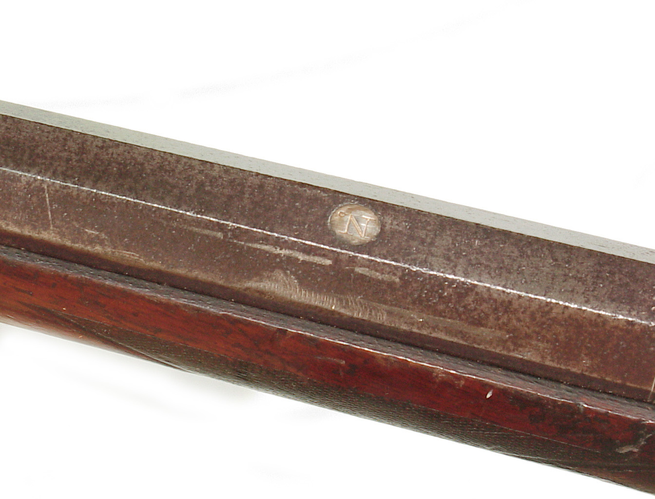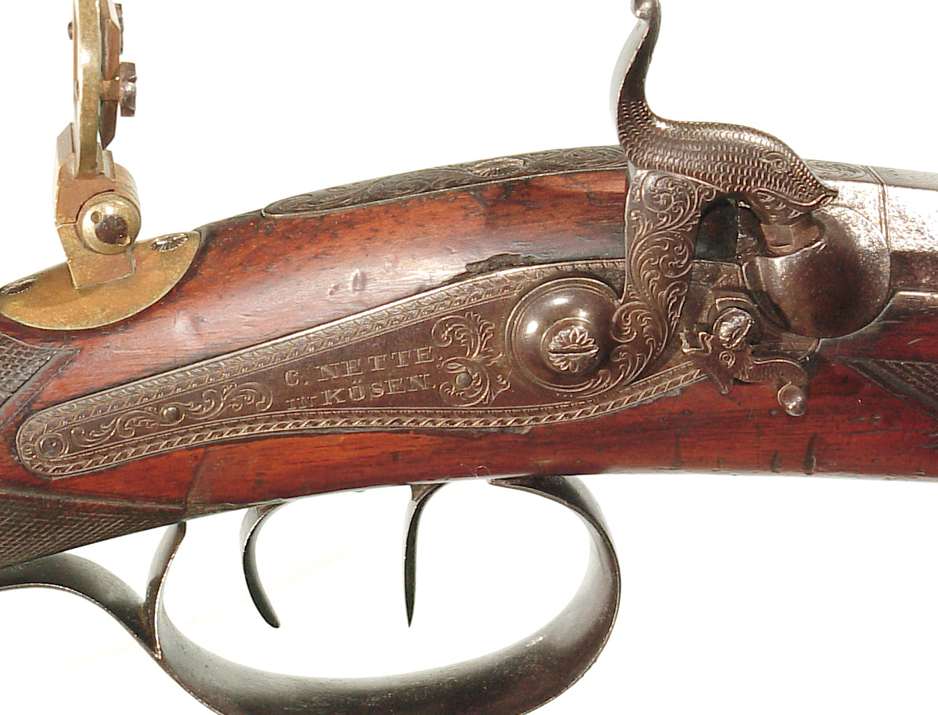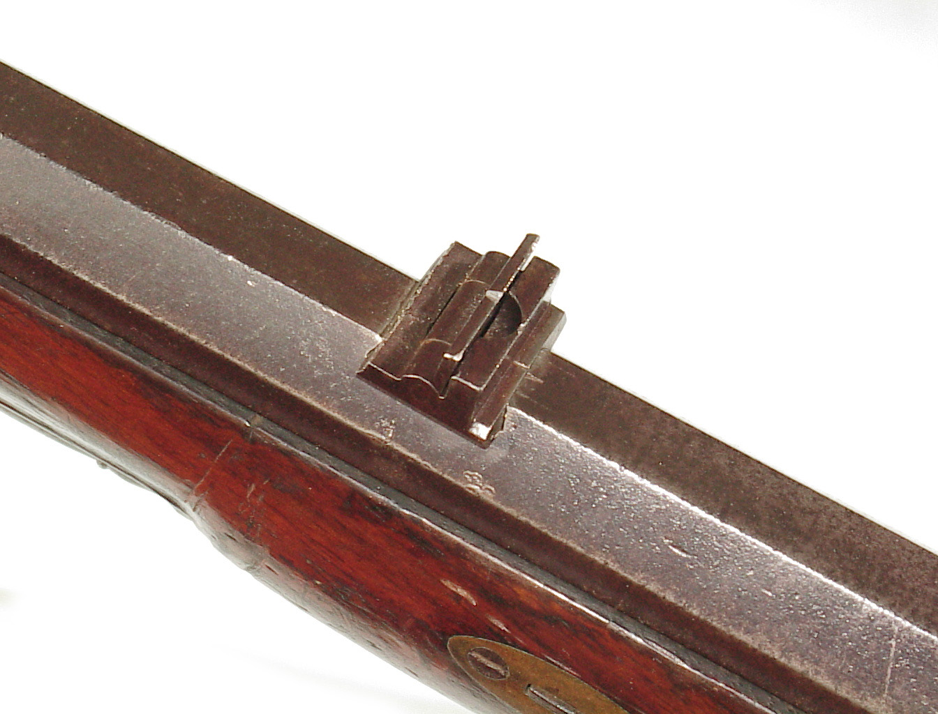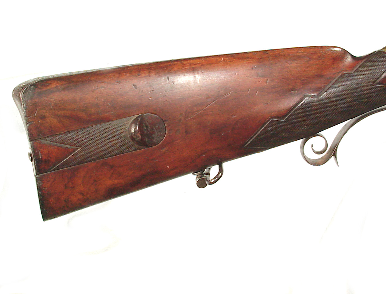 .65 caliber, 30″ full octagon swamped barrel with fine blade front sight and folding leaf rear. A flip up brass tang mounted peep sight is present and is both windage and elevation adjustable. Back action percussion lock with dolphin hammer with rotating block safety, fully engraved with maker’s name. A silver maker’s mark is on the top barrel flat (N). The triggerguard and mounts are engraved. Full length walnut stock checkered on the forend and wrist. In addition it is relief carved behind the cheekpiece. Sling swivels and original brass tipped ramrod, and wooden sliding patchbox. In lovely condition showing use but nicely cared for with bright bore and free of damage. Mechanically excellent.