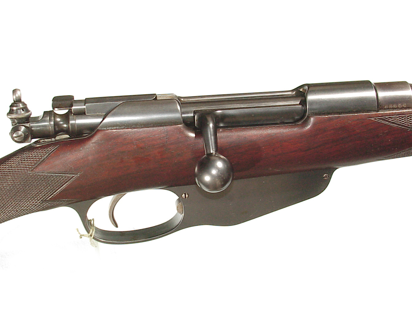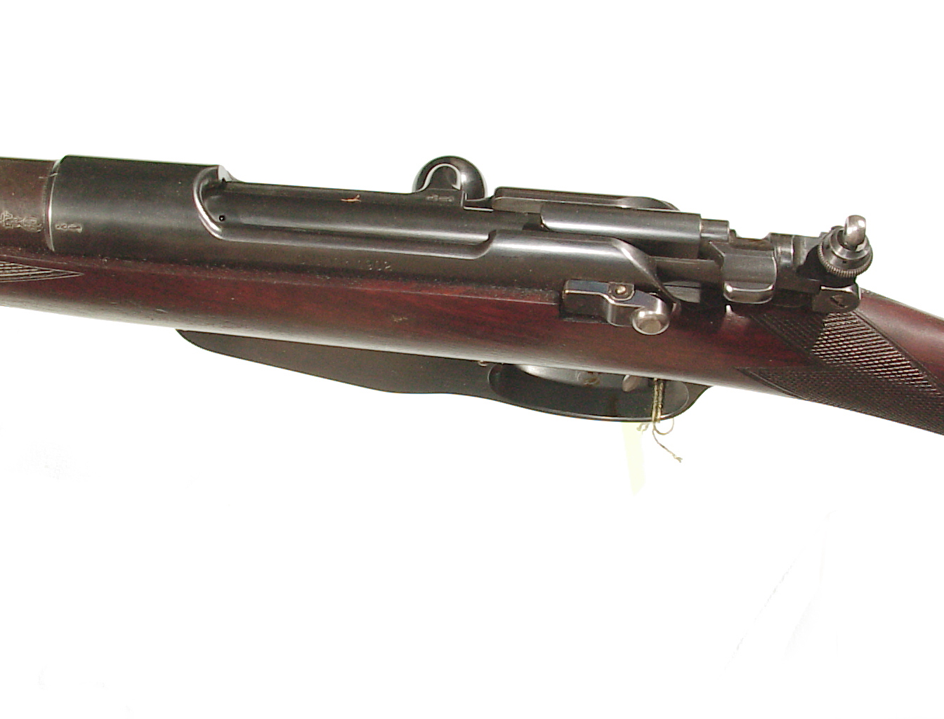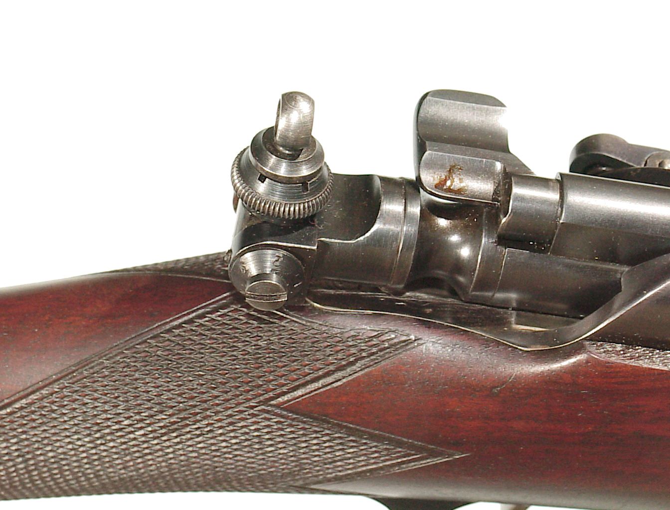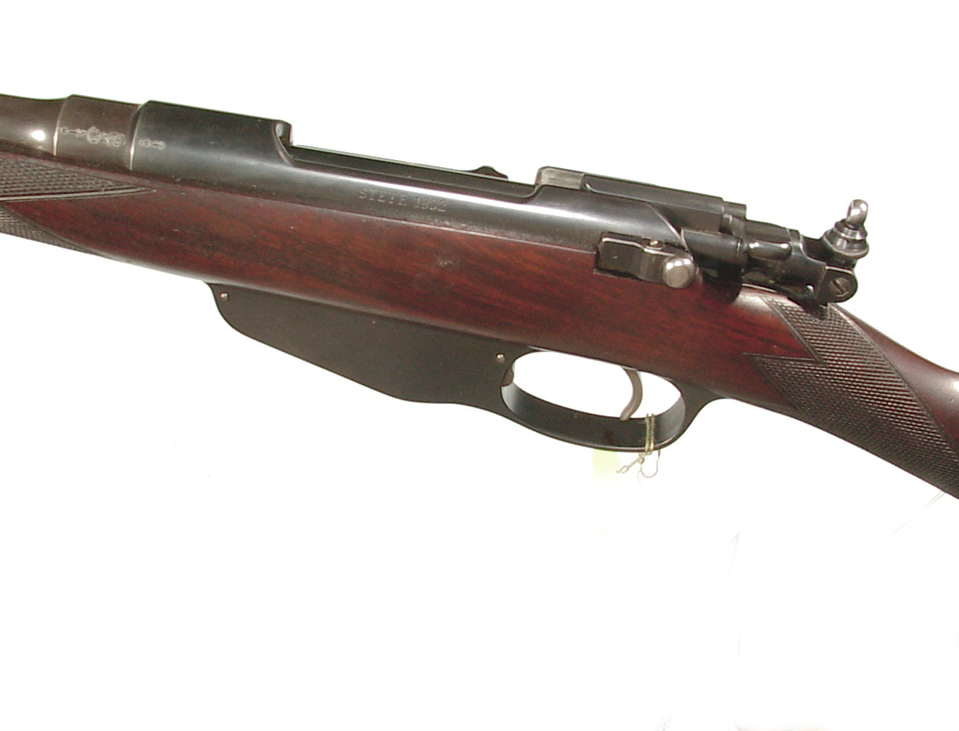 6.5X54R caliber. 26″ round barrel with dovetailed blade front sight, 3 leaf folding express rear and a folding elevations and windage adjustable bolt peep sight. Bolt action using the Styerm1893 rifle as a platform and stamped “STYER 1902” on the receiver. The barrel is engraved on the top “SHOT AND SIGHTED BY HOLLAND & HOLLAND 98 NEW BOND STREET,LONDON”. Checkered straight grip walnut stock ending with a blued steel buttplate. In excellent condition retaining nearly all of the original blue, excellent wood and checkering and mint bore. LOP: 14 1/4″ Interesting early British bolt action sporting rifle