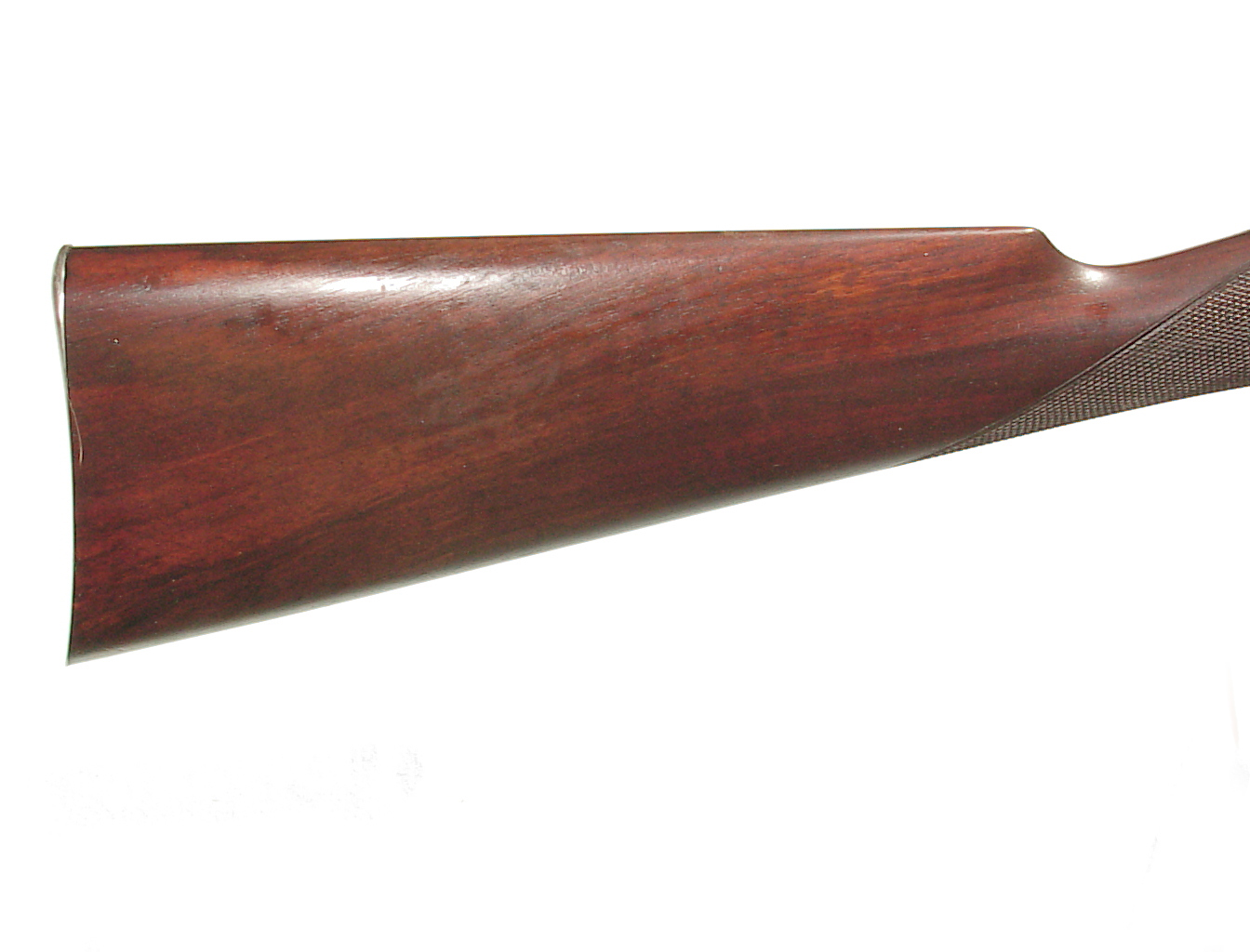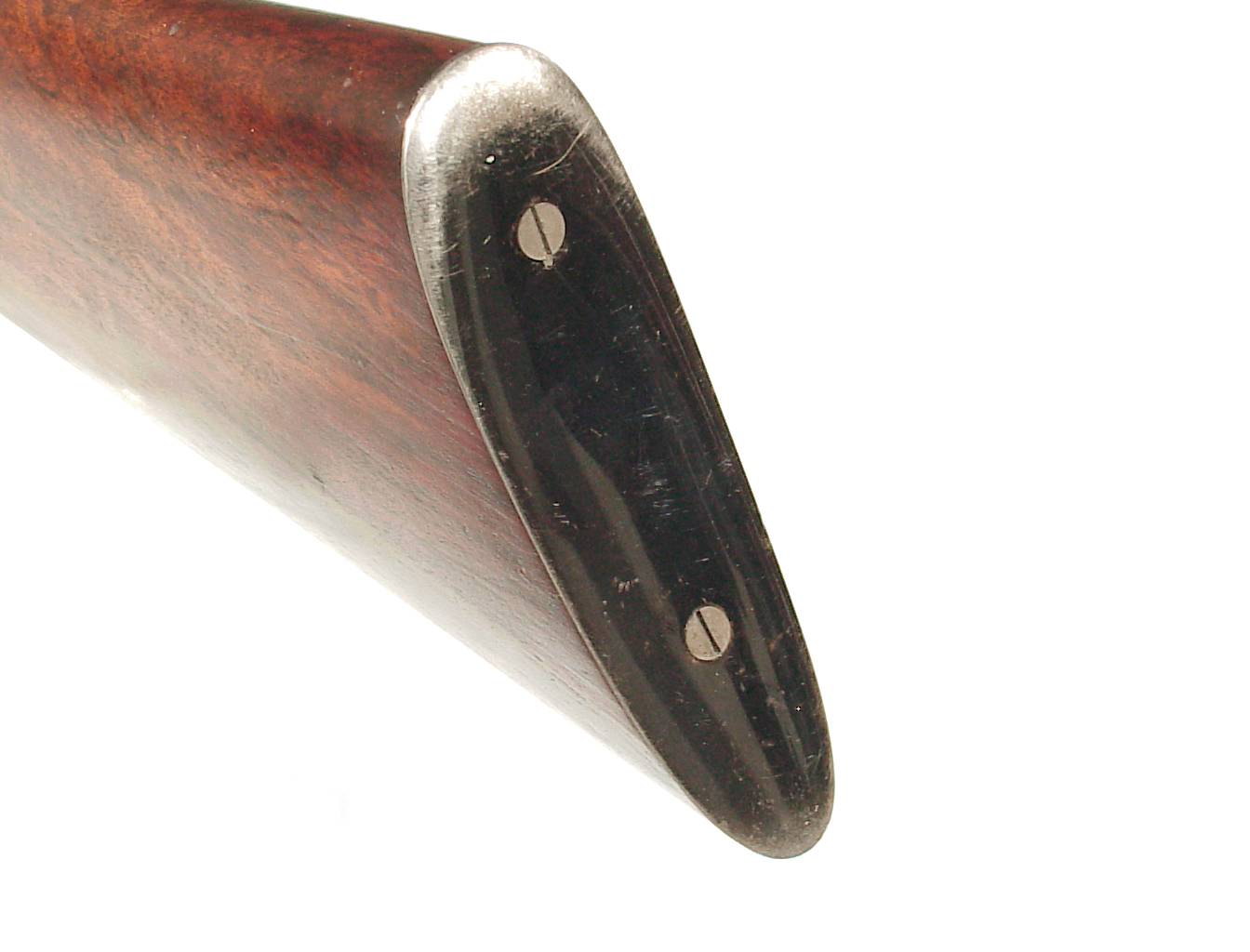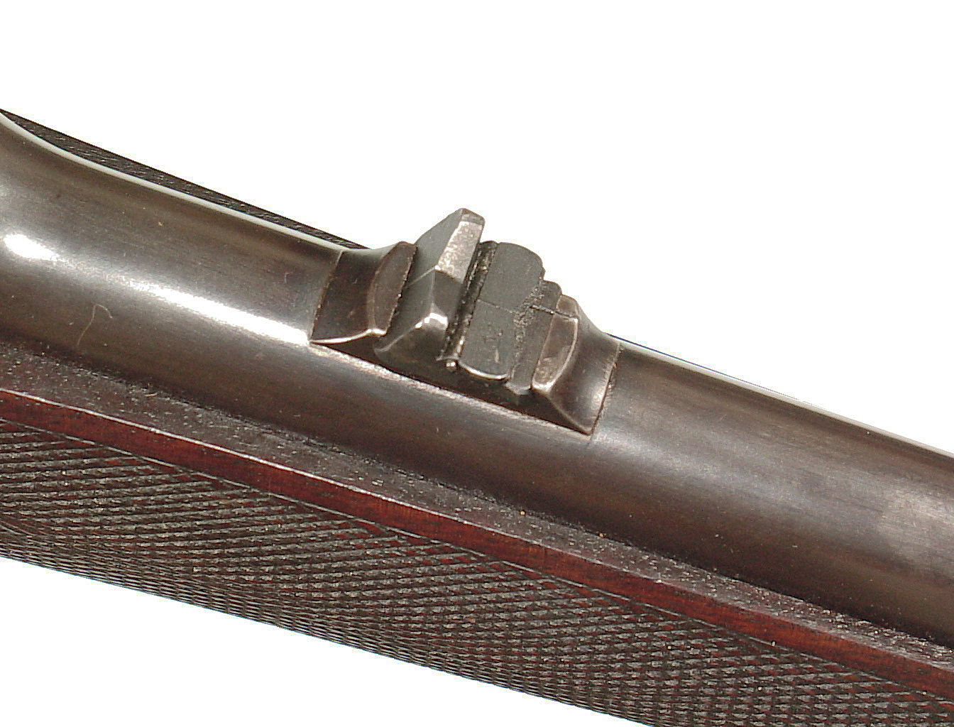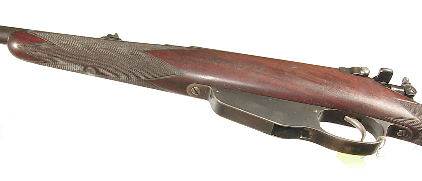 6.5X54R caliber. 26″ round barrel with dovetailed blade front sight, 3 leaf folding express rear and a folding elevations and windage adjustable bolt peep sight. Bolt action using the Styerm1893 rifle as a platform and stamped “STYER 1902” on the receiver. The barrel is engraved on the top “SHOT AND SIGHTED BY HOLLAND & HOLLAND 98 NEW BOND STREET,LONDON”. Checkered straight grip walnut stock ending with a blued steel buttplate. In excellent condition retaining nearly all of the original blue, excellent wood and checkering and mint bore. LOP: 14 1/4″ Interesting early British bolt action sporting rifle
