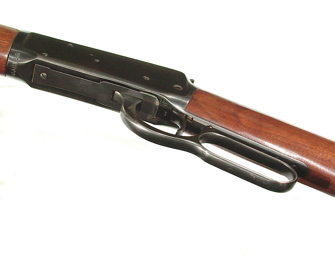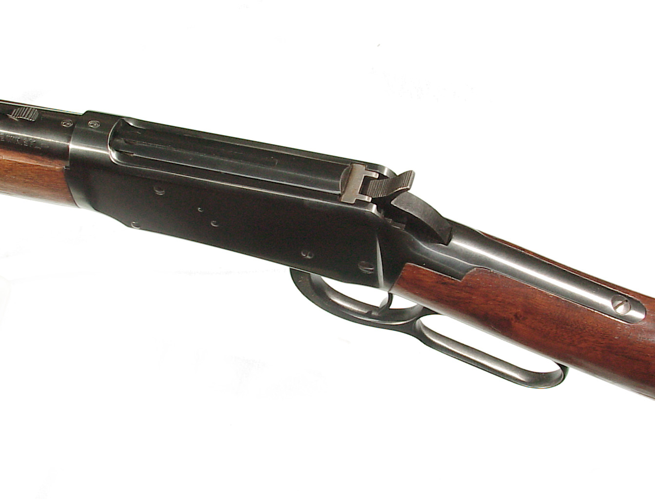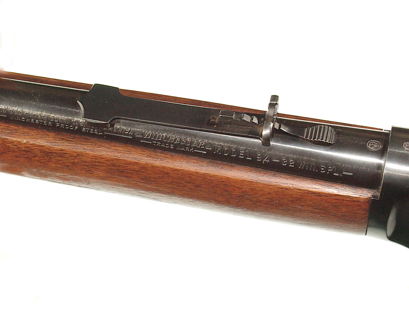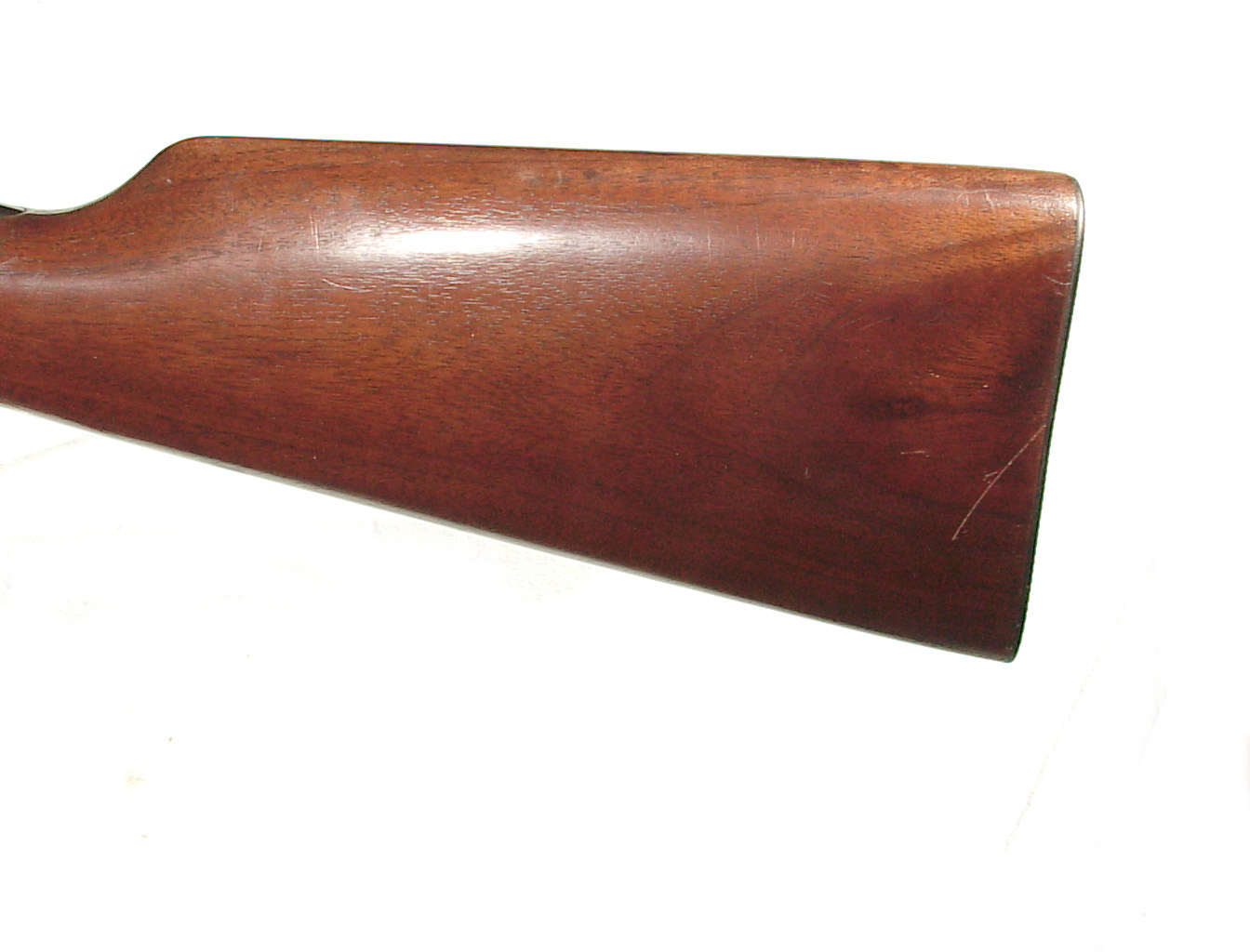 .32 Winchester special caliber, 20″ round barrel and full length magazine, with ramp front sight and rear buckhorn barrel sight. Lever action. Finished blue overall with plain stocks checkered steel buttplate. In superb original condition retaining 99% blue, minty wood and perfect bore. Appears little used. Mfg 1952