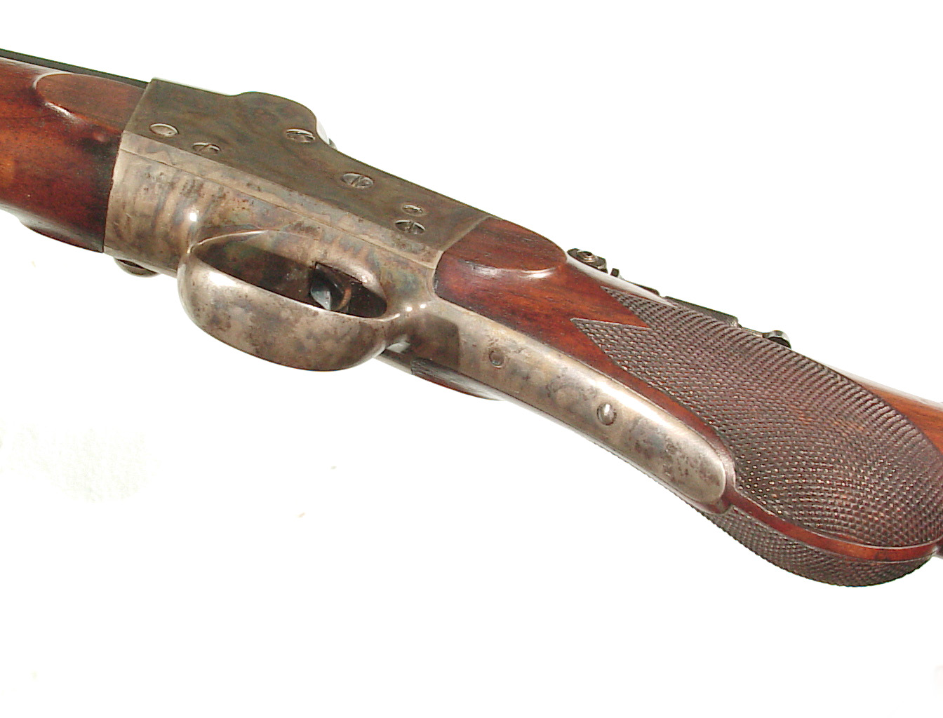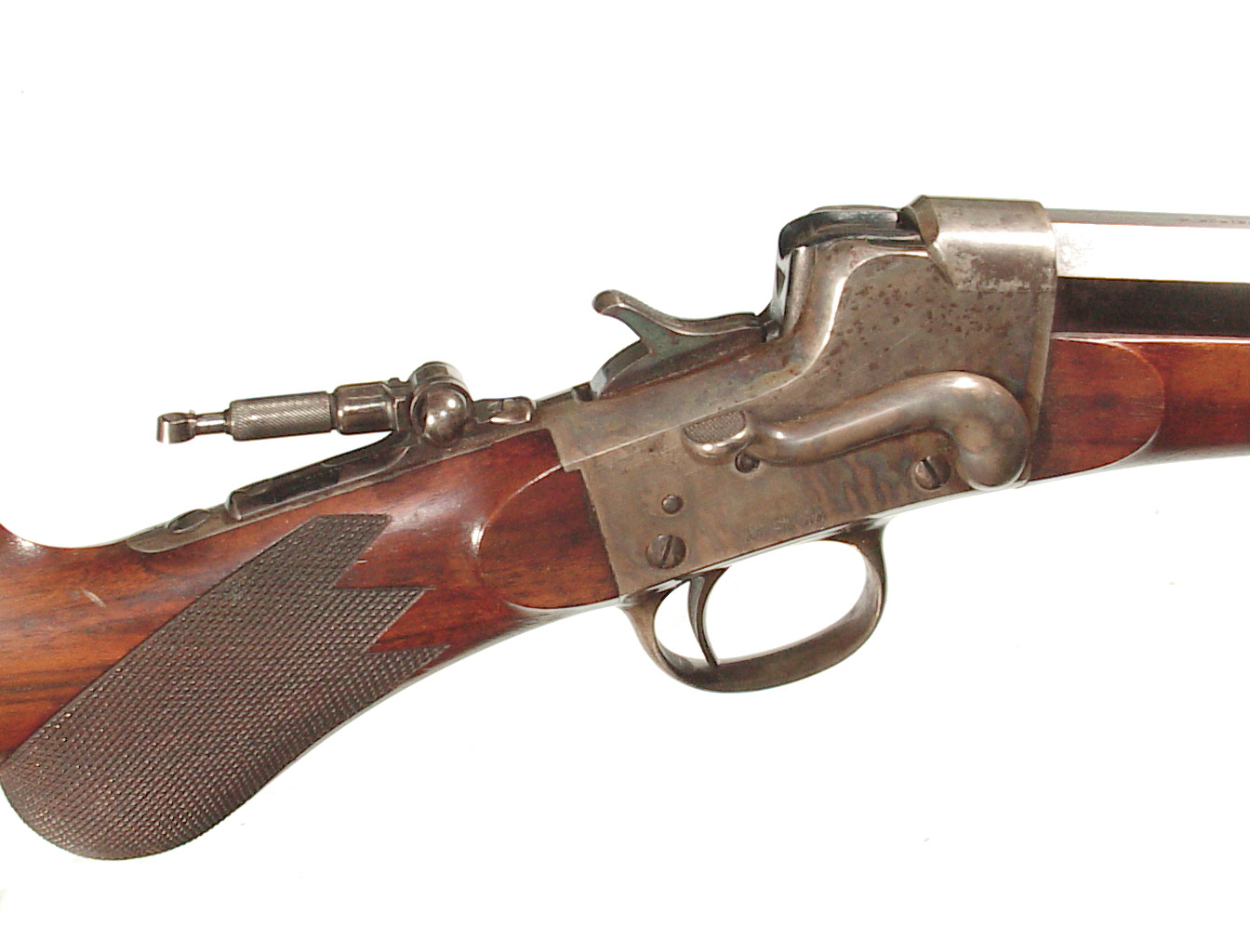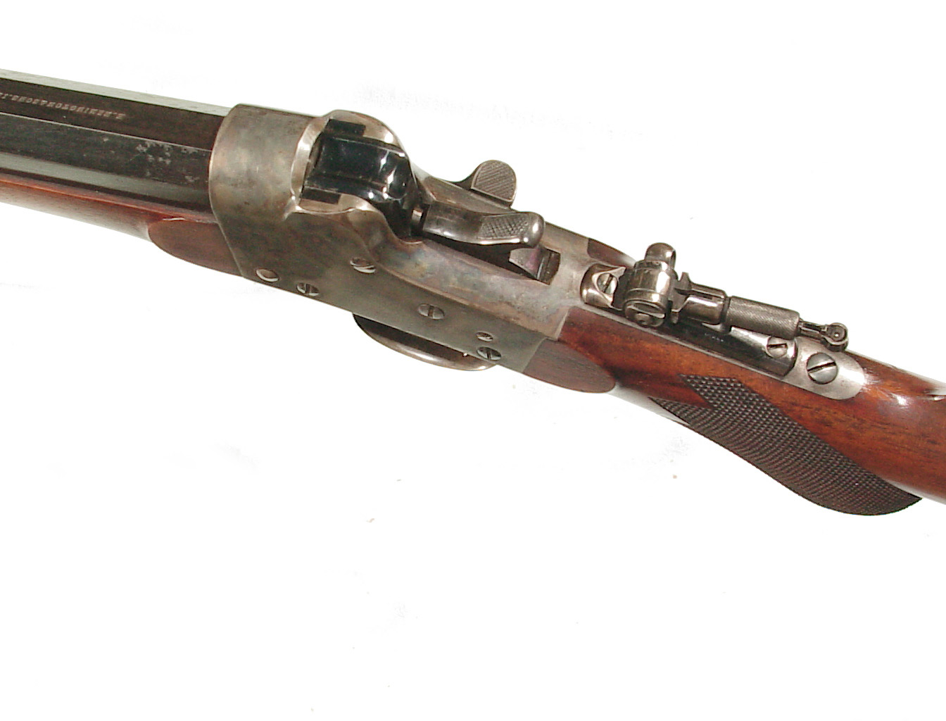 .40-50 caliber, 26″ part octagon barrel with mid barrel sight, windage front and elevation adjustable rear tang. Lever actuated case hardened falling block action with external hammer. Plain uncheckered forend with nickel silver Schnabel cap. Checkered pistol grip buttstock ending with a casehardened steel buttplate. The barrel retaining most of the original blue finish. Excellent receiver with much of the case colors remaining. Beautiful wood and varnish. Nice bright bore and mechanically perfect.