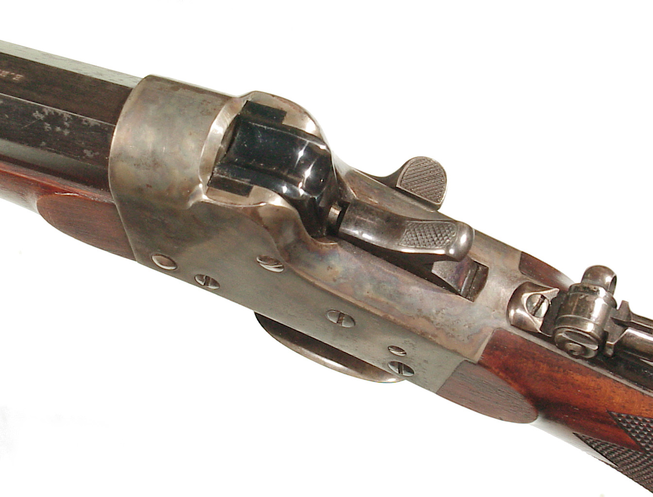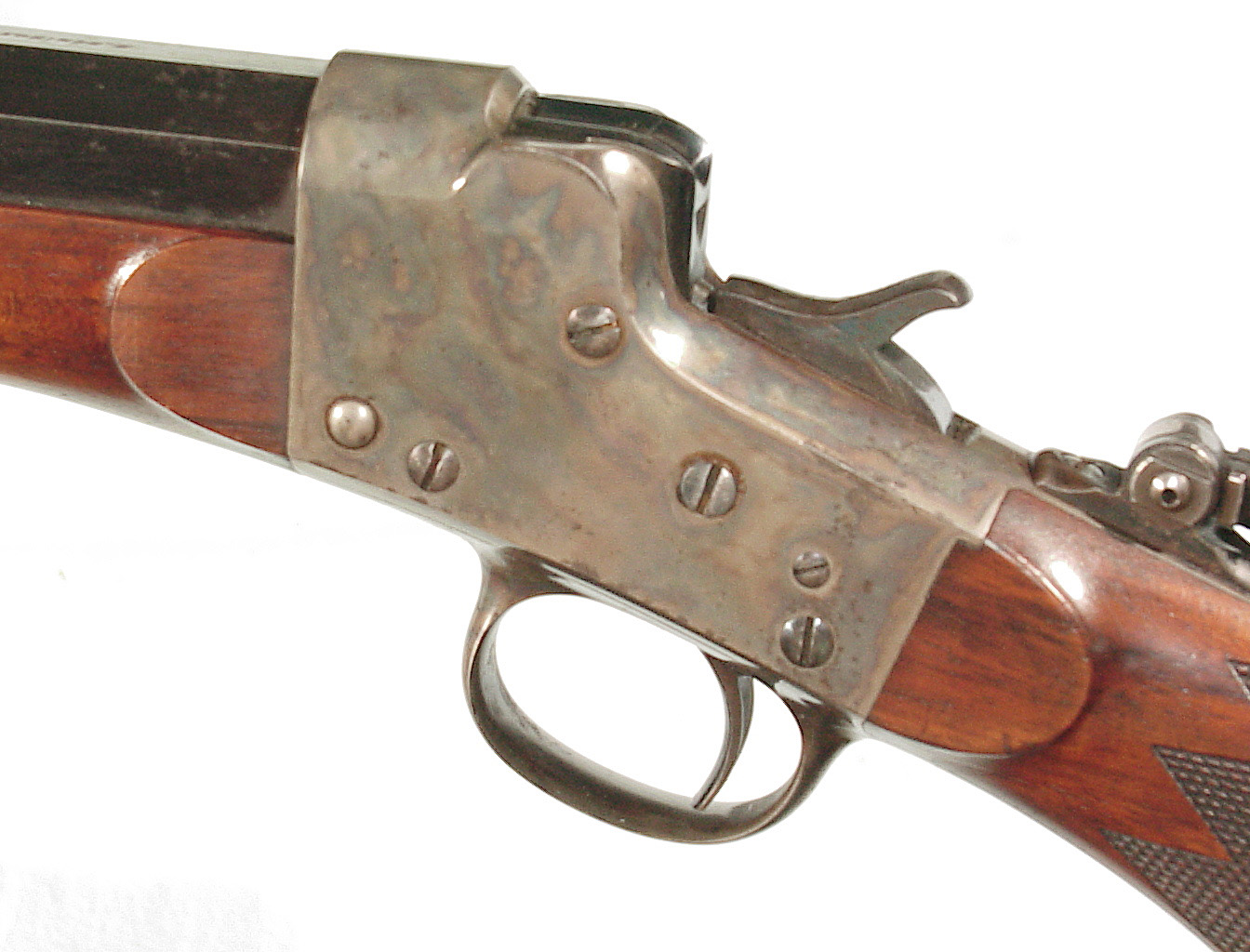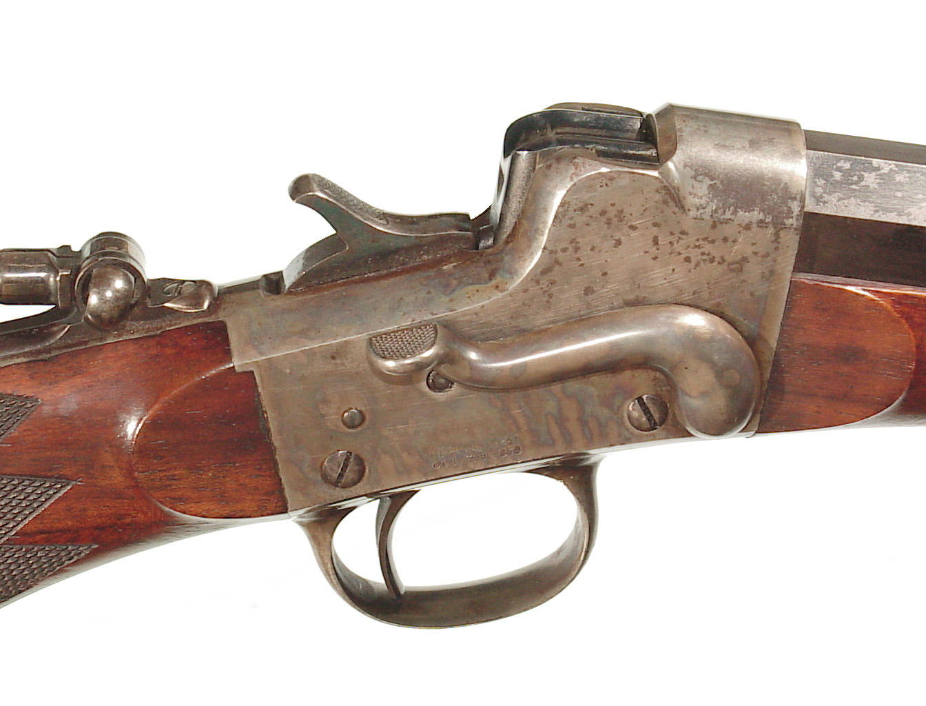 .40-50 caliber, 26″ part octagon barrel with mid barrel sight, windage front and elevation adjustable rear tang. Lever actuated case hardened falling block action with external hammer. Plain uncheckered forend with nickel silver Schnabel cap. Checkered pistol grip buttstock ending with a casehardened steel buttplate. The barrel retaining most of the original blue finish. Excellent receiver with much of the case colors remaining. Beautiful wood and varnish. Nice bright bore and mechanically perfect.