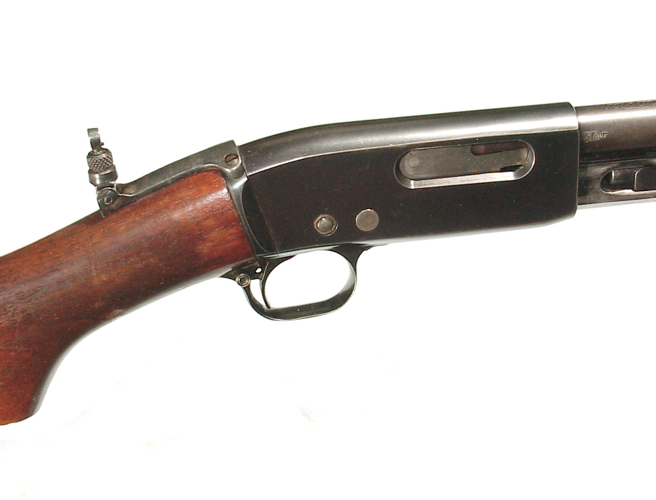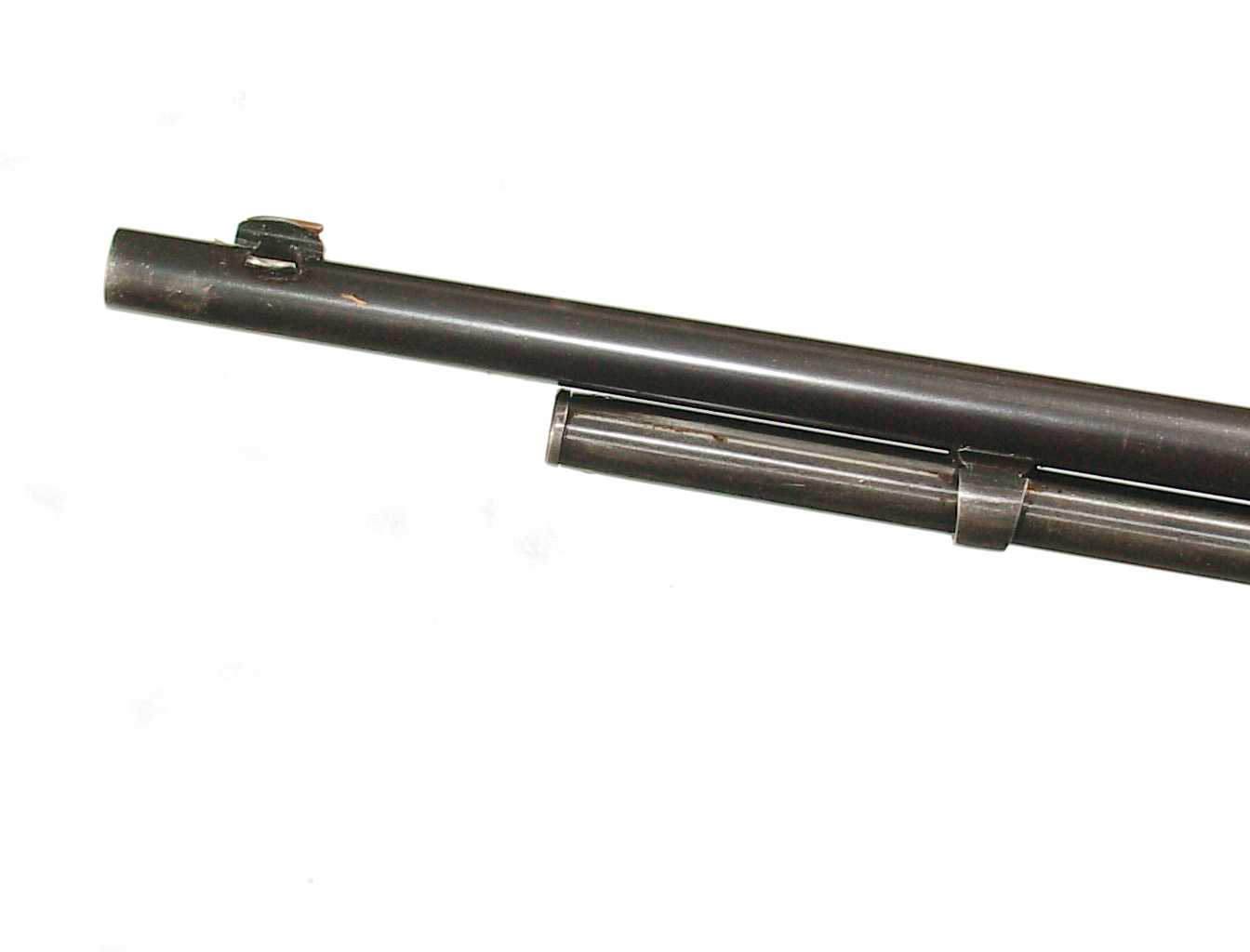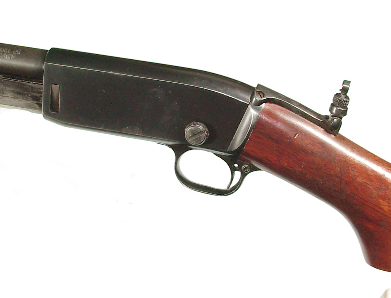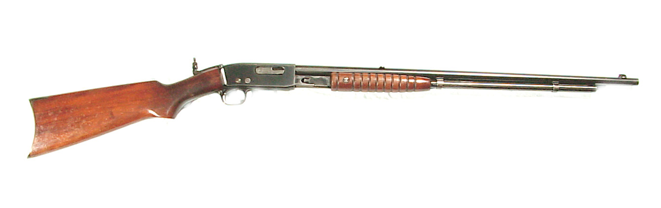 .32-20 Winchester caliber, 24″ round barrel standard front sight and a blank at mid-barrel. Pump action with the takedown feature and tubular magazine located under the barrel.
