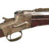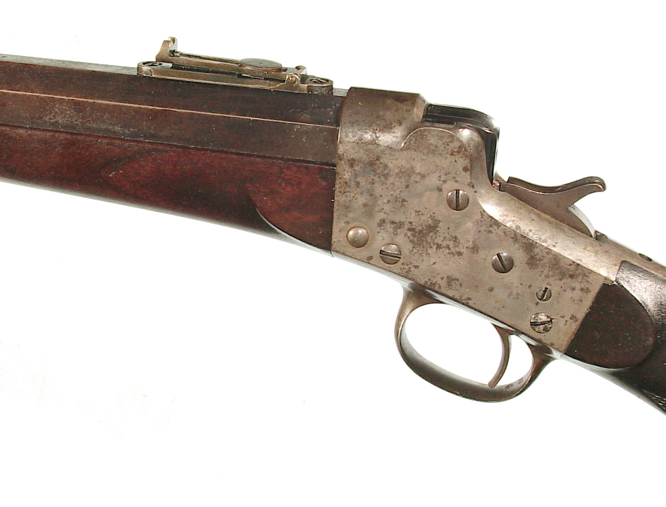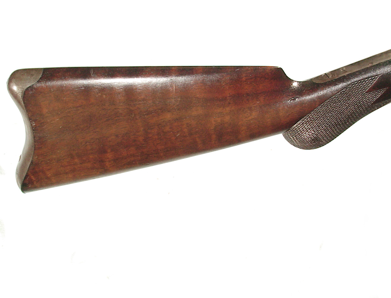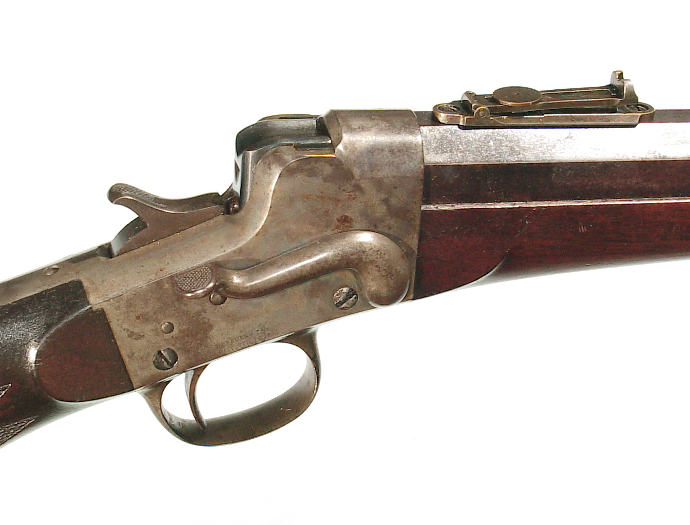 .40 2 1/2″ straight caliber, 30″ part octagon barrel, casehardened falling block action. Plain uncheckered walnut forend and pistol grip buttstock ending with a steel buttplate. Beach folding front sight and ladder folding peep rear barrel sight. Tang sight missing. Retaining much barrel blue, the receiver showing mottled case colors mixing with gray. Mint bore. Very fine wood with some minor handling marks and free of damage. Mechanically excellent.