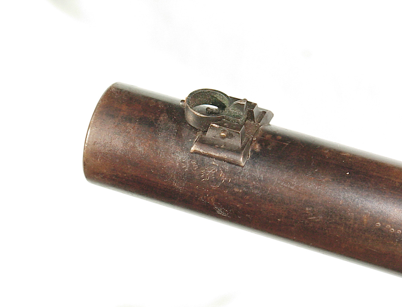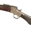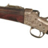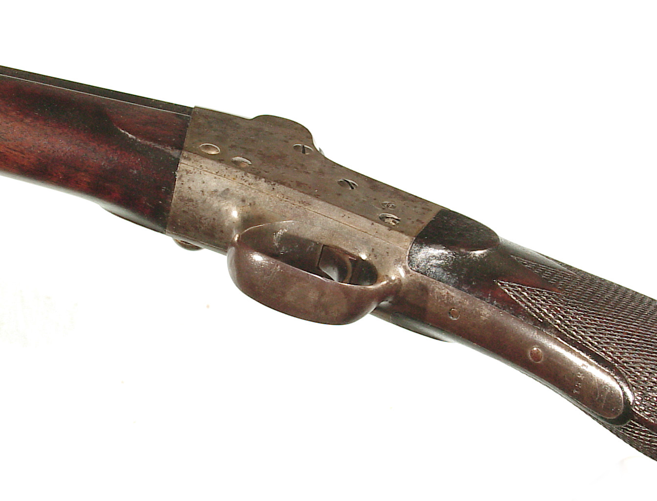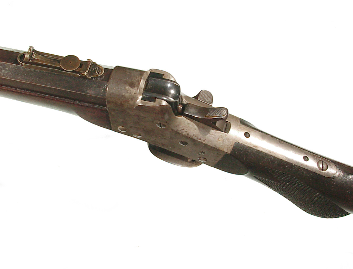 .40 2 1/2″ straight caliber, 30″ part octagon barrel, casehardened falling block action. Plain uncheckered walnut forend and pistol grip buttstock ending with a steel buttplate. Beach folding front sight and ladder folding peep rear barrel sight. Tang sight missing. Retaining much barrel blue, the receiver showing mottled case colors mixing with gray. Mint bore. Very fine wood with some minor handling marks and free of damage. Mechanically excellent.