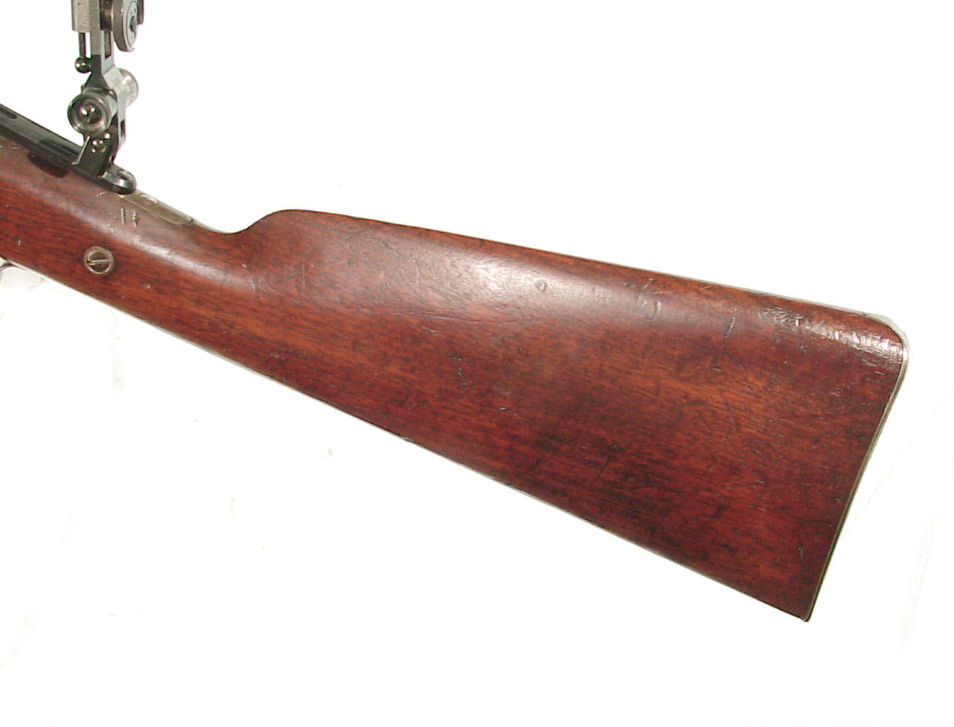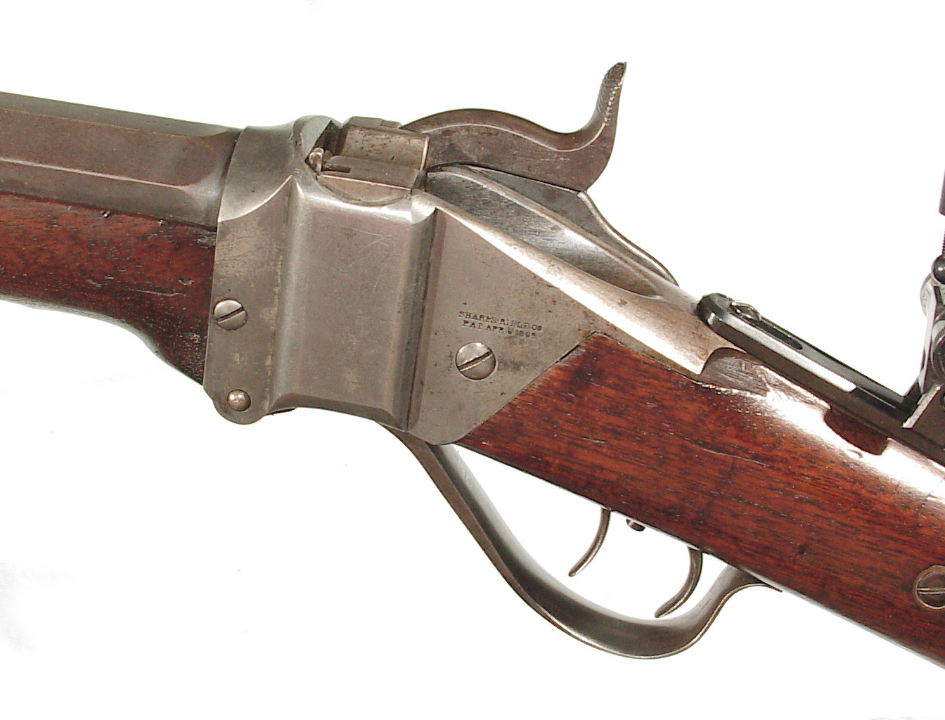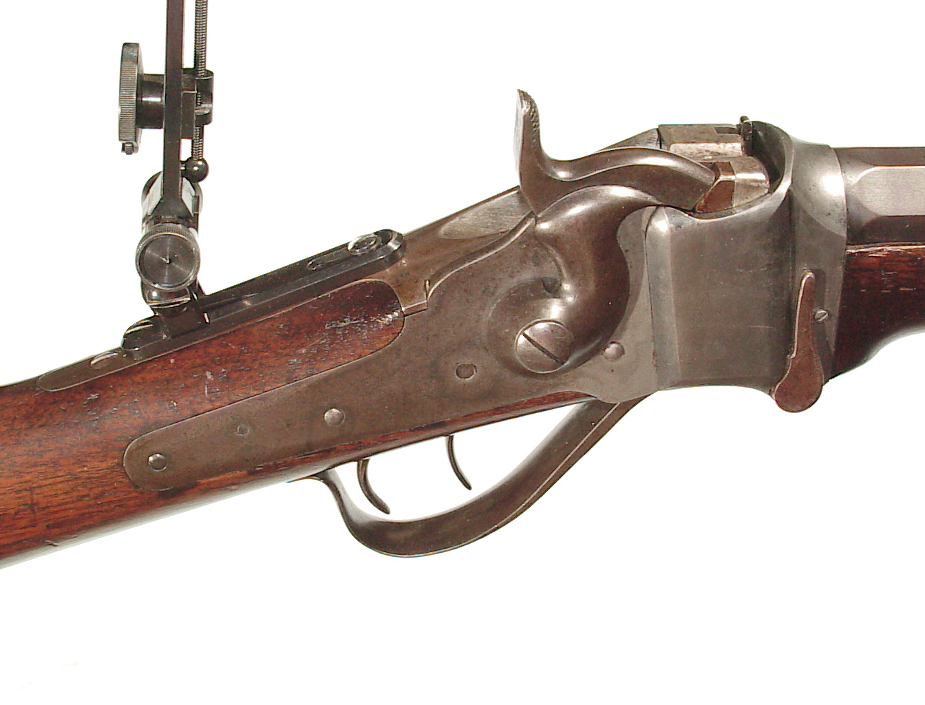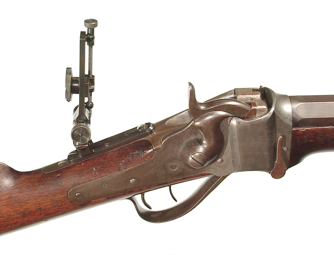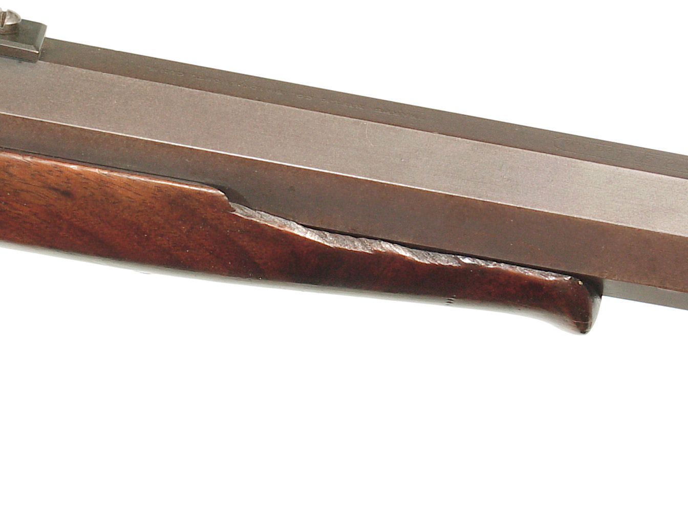 .45 caliber, 30″ full octagonal barrel. Casehardened falling block action and lock, and double set triggers. Plain uncheckered forend and straight grip buttstock ending with a checkered steel buttplate. Sights consist of a modern globe front and Soule rear tang sight. Lawrence barrel sight appears to be original. In very fine condition with the barrel showing much of the finish a good legend, an older professional refinish. The receiver having mottled case colors mixing with a gray patina. Nice wood and varnish with various minor handling marks and slight damage to the right side of the forend at the barrel channel and at the head of the stock on the left side. Excellent bright bore and rifling. Mechanically excellent. The factory letter indicates that the rifle was invoiced July 11, 1878 and shipped to “h. Folsom & Co, St. Louis, Mo. The rifle weighed 11 lbs, 3 oz.