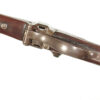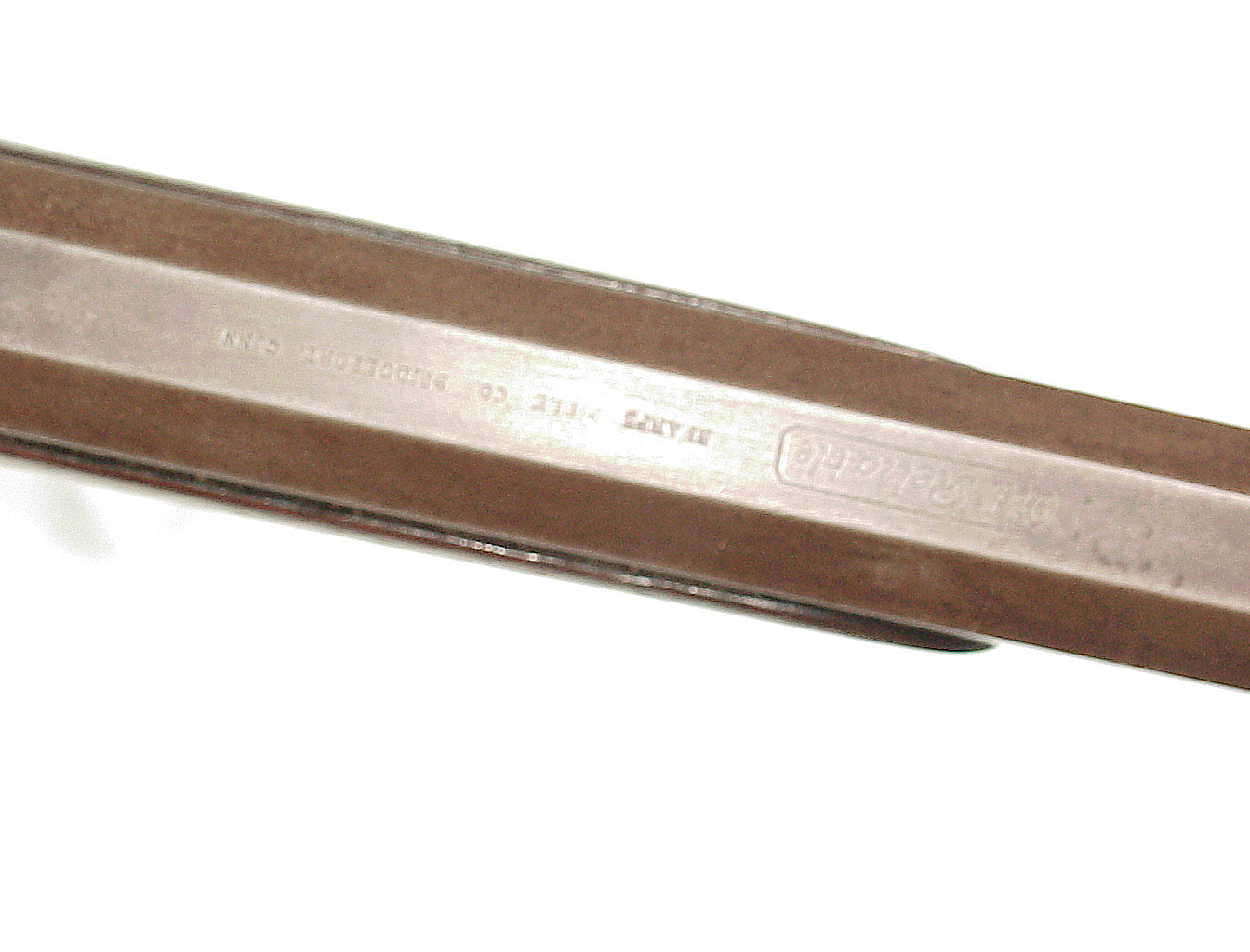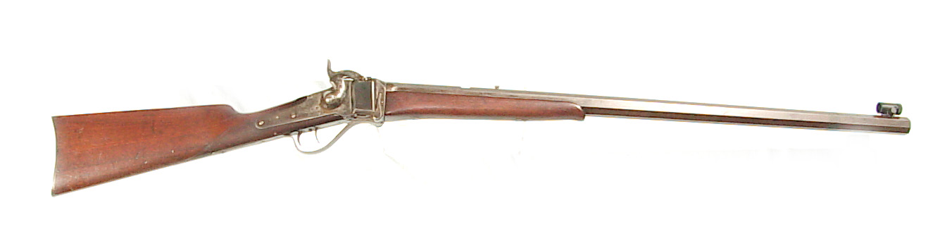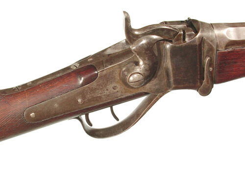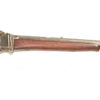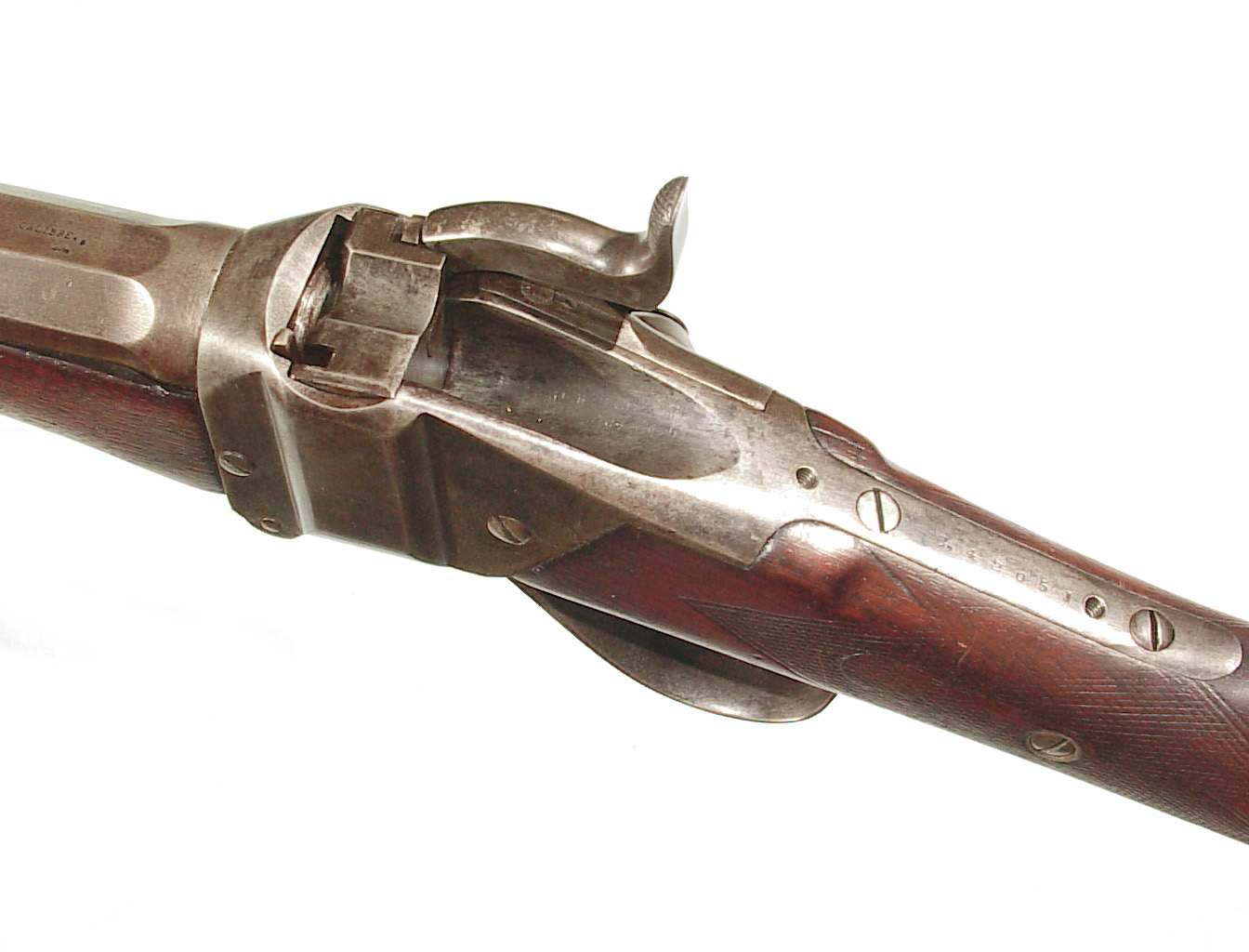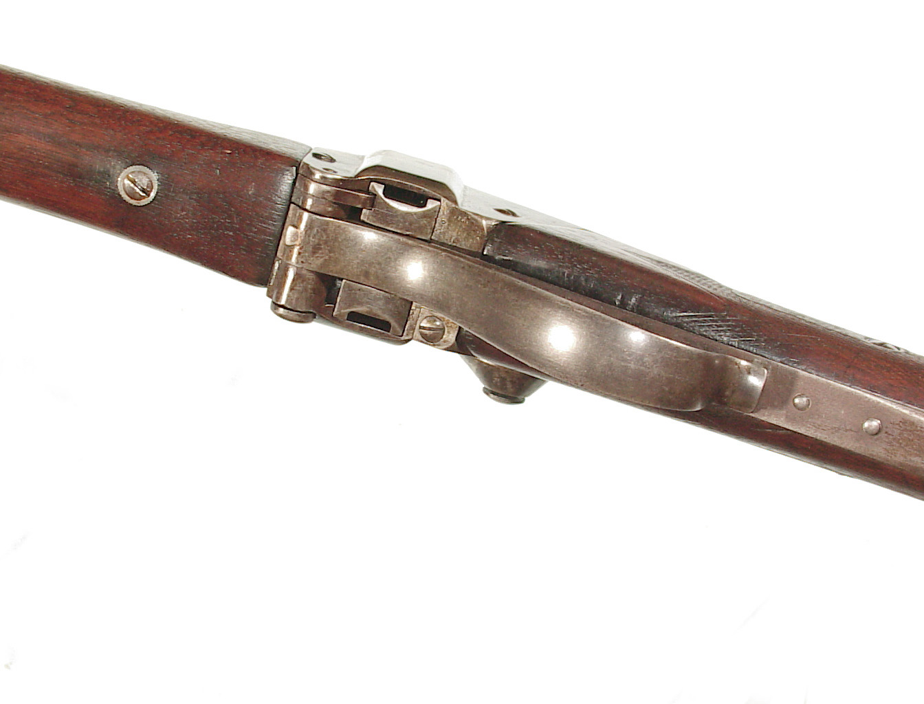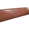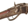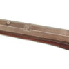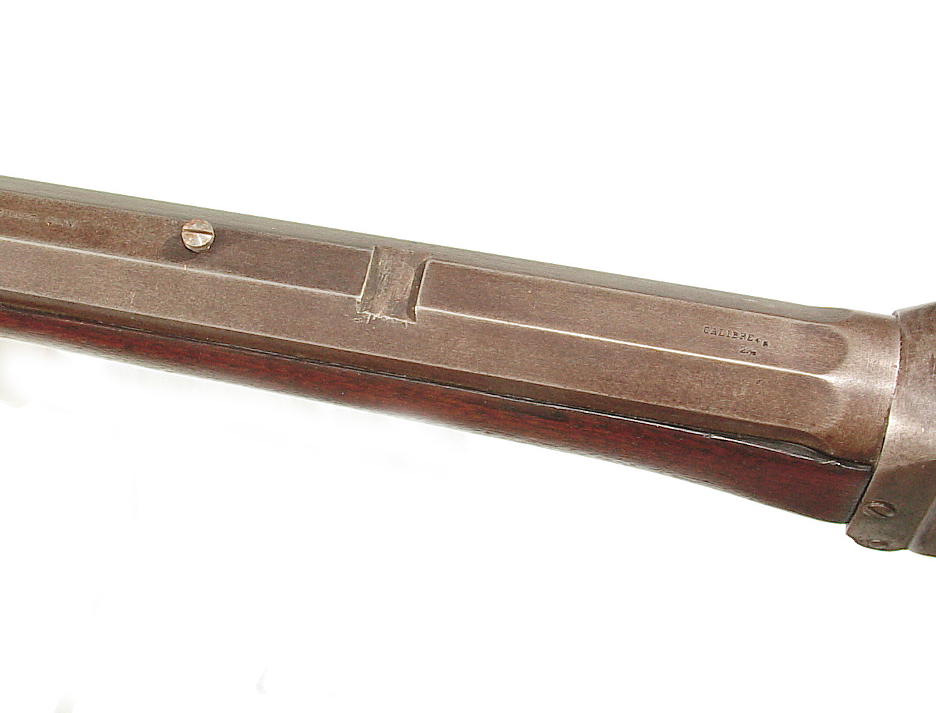 .45 2 7/8″ caliber, 30″ heavy full octagon barrel. 1874 falling block action with plain forend a checkered straight grip buttstock ending with a steel rifle buttplate. Front sight a replacement, the rear sights missing. Excellent mint bore with sharp rifling. The barrel showing some blue mixing with a pleasing plum patina and smooth surfaces. Very nice visible legend and “OLD RELIABLE” stamps on the top flat. The receiver having mottle case colors mixing with gray. Very fine wood with only minor handling marks and some wear to the checkering. Overall very pleasing. Weight 11 lbs 7 oz. Manufactured from Civil War actions by E.C Meachum, St Louis and often purchased for use out west. Having heavy barrels in large calibers.