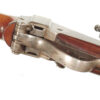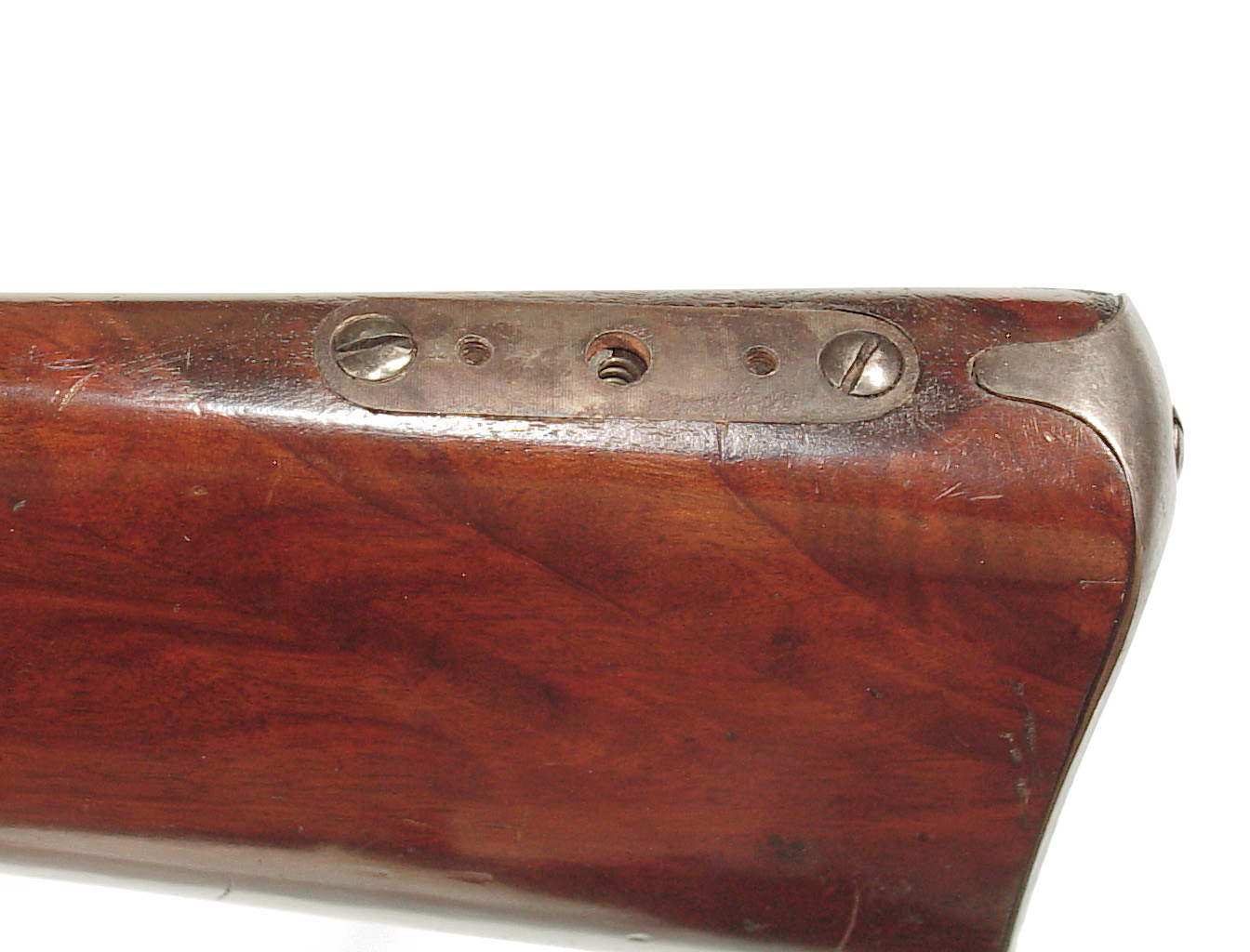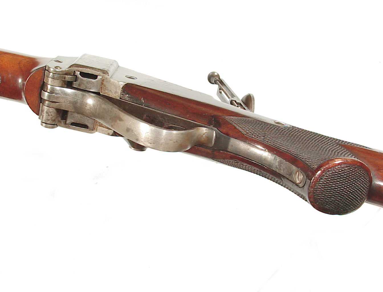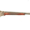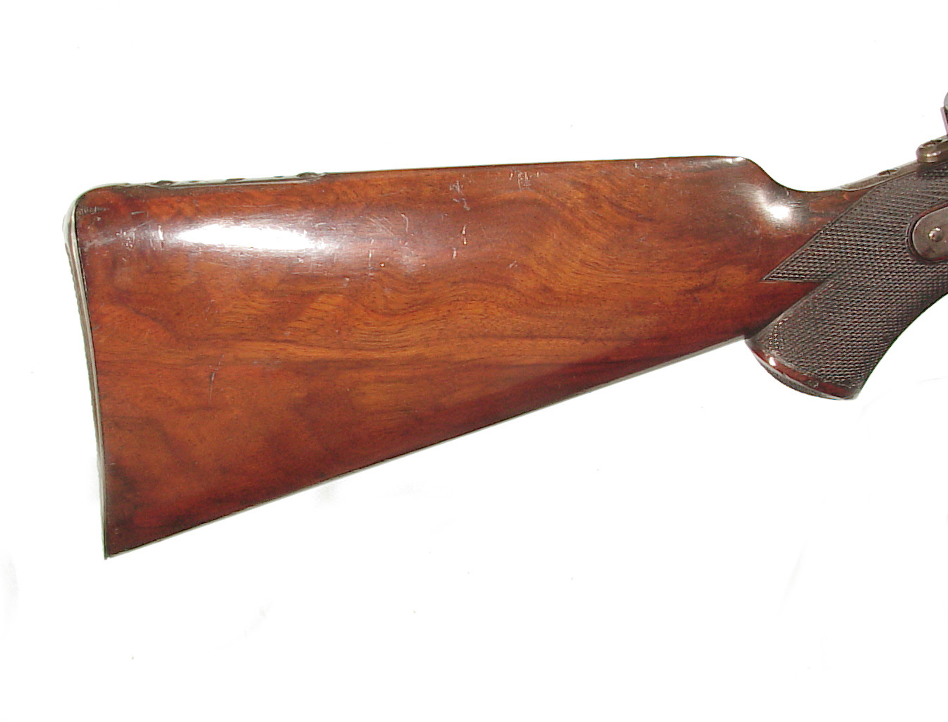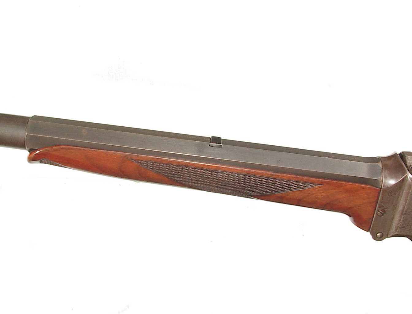 .45-100 caliber, 32″ part octagon barrel finished blue. Casehardened falling block receiver with external hammer. Checkered forend and pistol grip stock ending in a checkered steel buttplate. Sights consist of windage adjustable globe front and long-range vernier adjustable rear tang sight. The rifle is also equipped with a factory heel position located and the rear. In very fine original condition with the barrel retaining most of the blue and the receiver showing fading case colors mixing with silver. Very nice wood with some minor handling marks and crisp checkering and varnish. Excellent bright bore. Very scarce only 258 mfg.