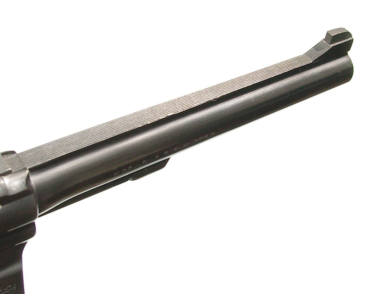 .22 rimfire, 6″ ribbed barrel, 6 shot cylinder with rebated chambers, and double/single action. Adjustable rear sight, case hardened trigger & hammer, and checkered factory walnut grips. In near, unused original condition retaining 99% blue, and excellent grips. Mint bore. In it’s original gold factory box with instructions in the lid. 1953 mfg.