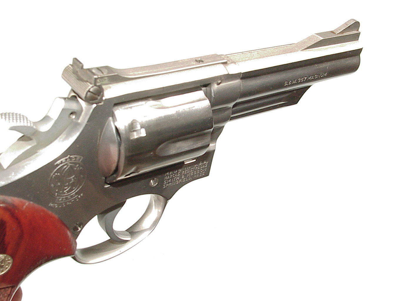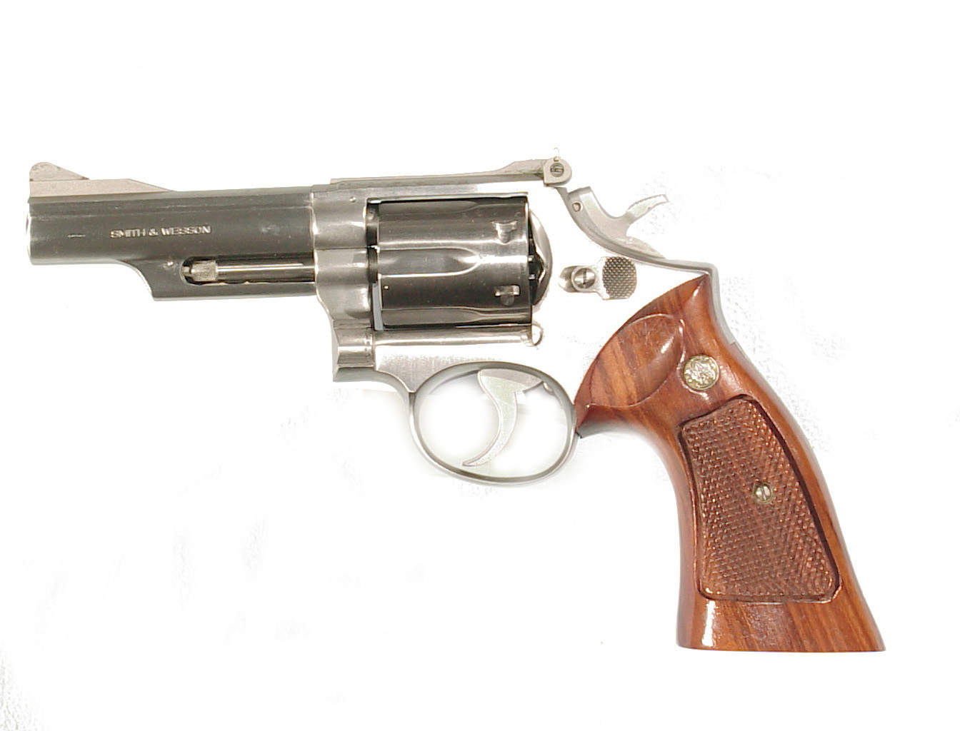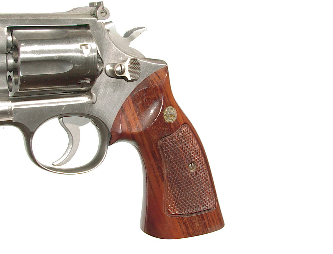 .357 magnum caliber, 4″ barrel, six shot double action with factory target grips. Adjustable rear sight. In excellent condition showing only minor use and mint bore. Accompanied by it’s factory blue box, numbered to the gun. Cleaning rod, screw driver, and jag are still sealed in the plastic wrapper. Oil paper and instruction/warranty card. 1972 mfg.