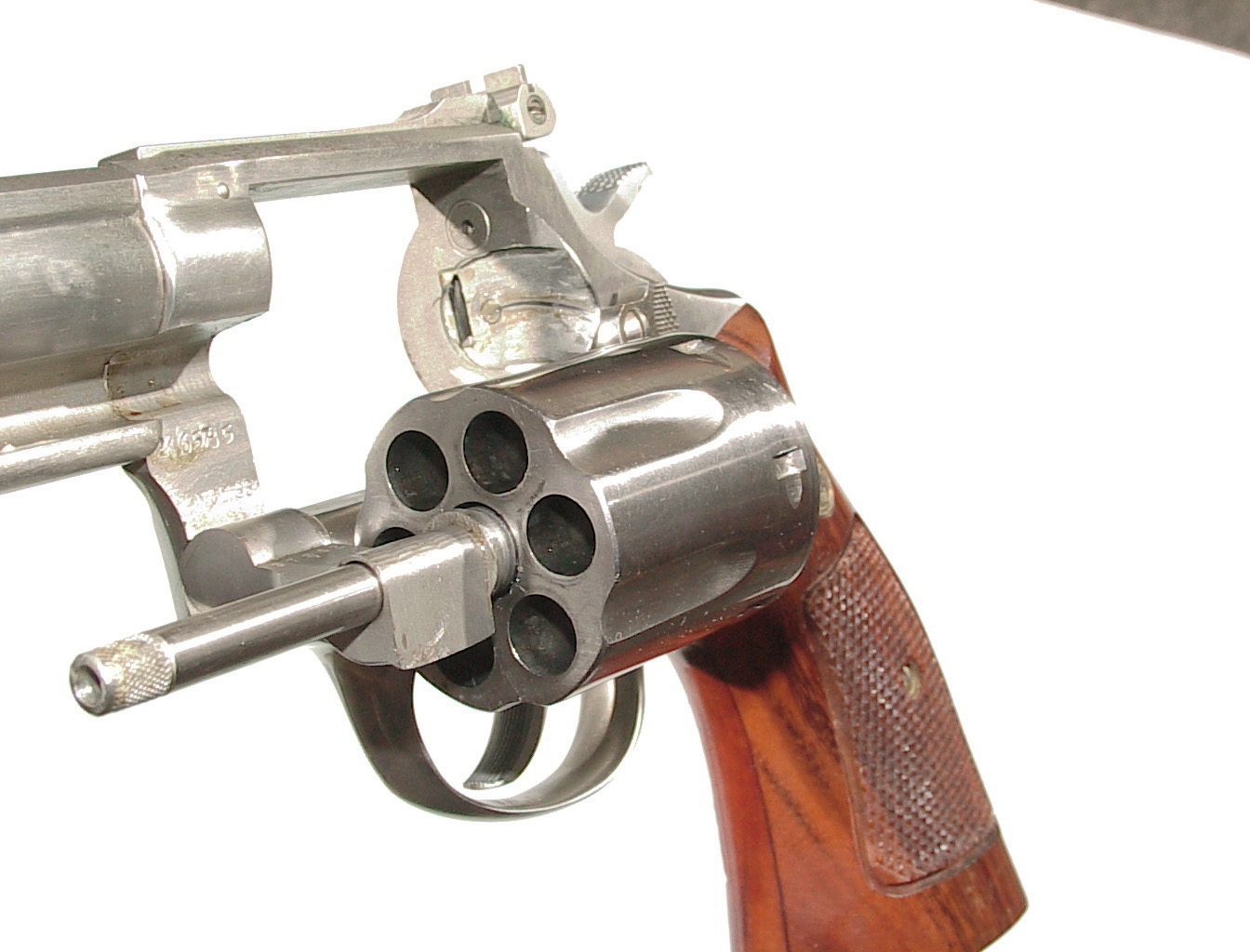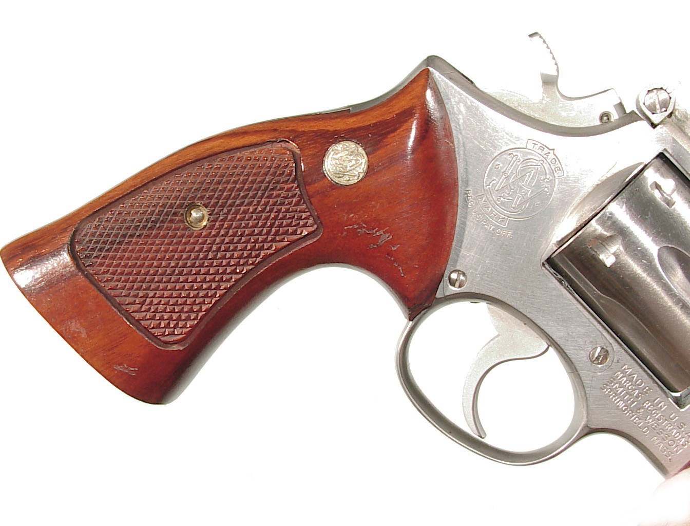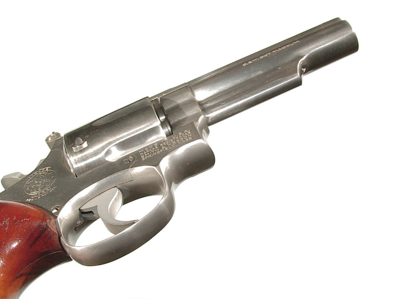 .357 magnum caliber, 4″ barrel, six shot double action with factory target grips. Adjustable rear sight. In excellent condition showing only minor use and mint bore. Accompanied by it’s factory blue box, numbered to the gun. Cleaning rod, screw driver, and jag are still sealed in the plastic wrapper. Oil paper and instruction/warranty card. 1972 mfg.