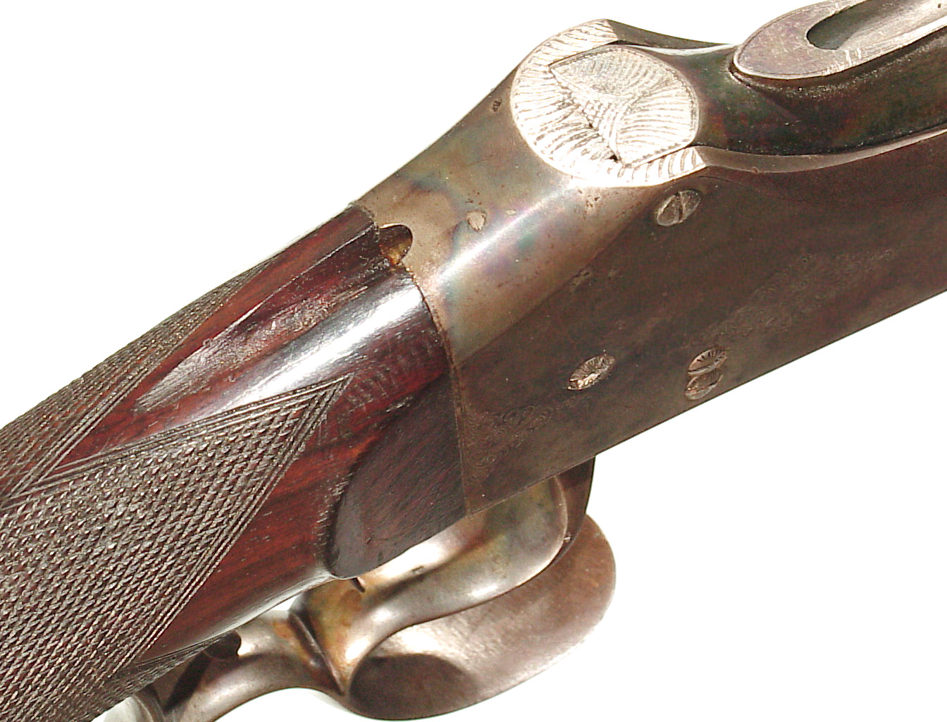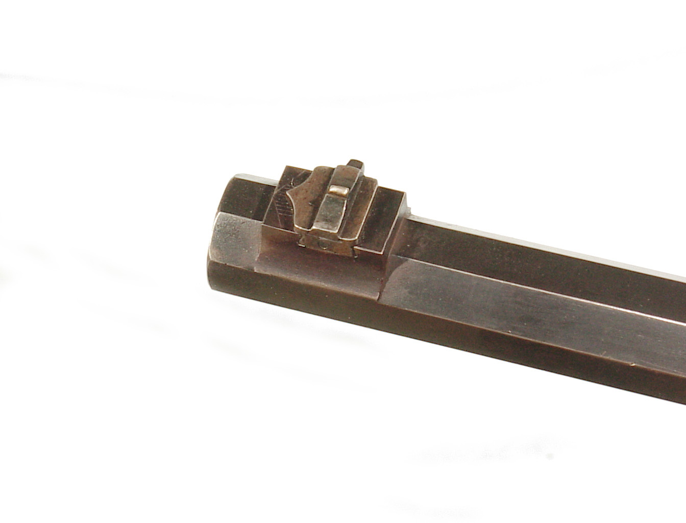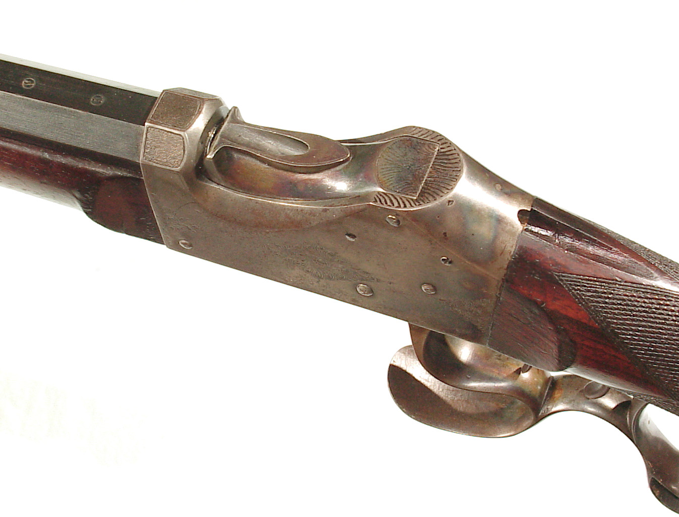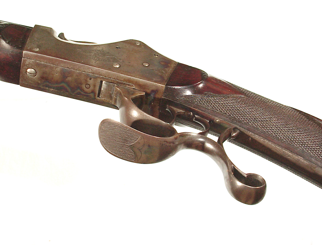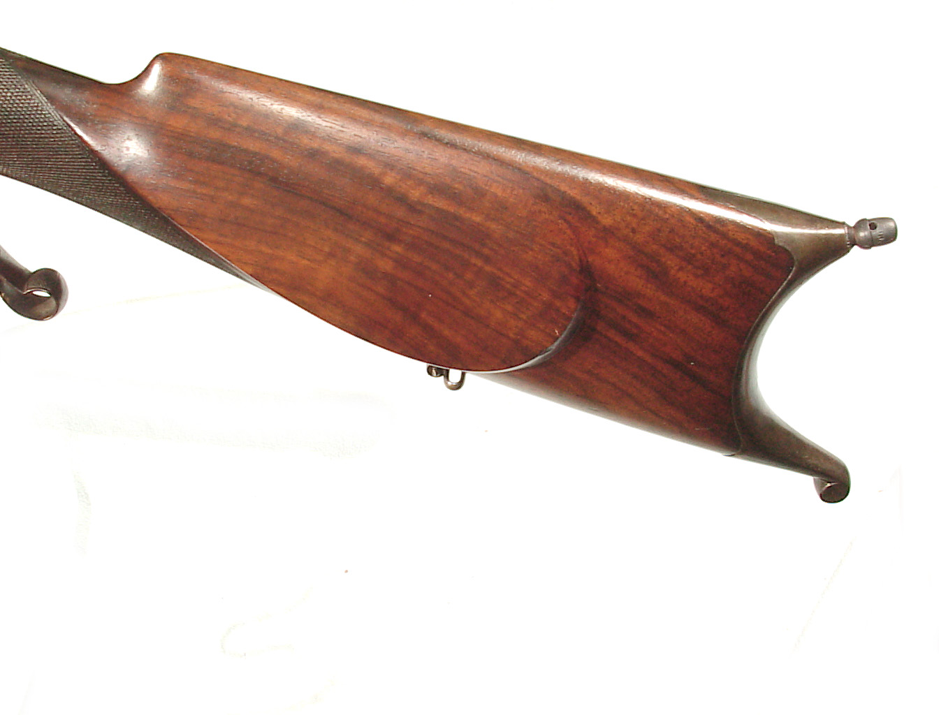 .22 rimfire, 26.5 full octagon barrel with windage adjustable and elevation adjustable barrel sight. Engraved and casehardened Martini falling block single shot action with rear frame access for a cleaning rod to be used from the rear. Fancy finger rest trigger guard and double set triggers. Plain forend and checkered straight grip buttstock with cheekpiece and ending with a Swiss buttplate. Sling swivels. In very fine condition the barrel retaining much of the blue, the receiver showing case colors mixing with gray and very crisp engraving. Nice wood with sharp checkering and only minor handling marks. Mint bore that appears to have been relined from another ctg. Tapped for scope blocks which accompany the rifle. No maker’s mark is visible.