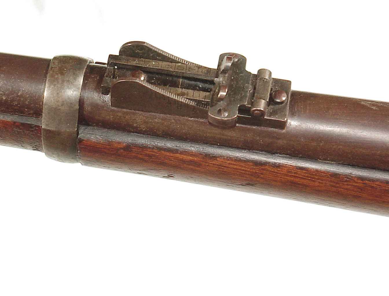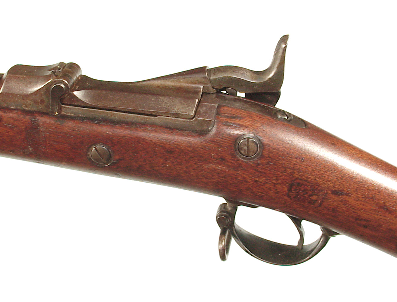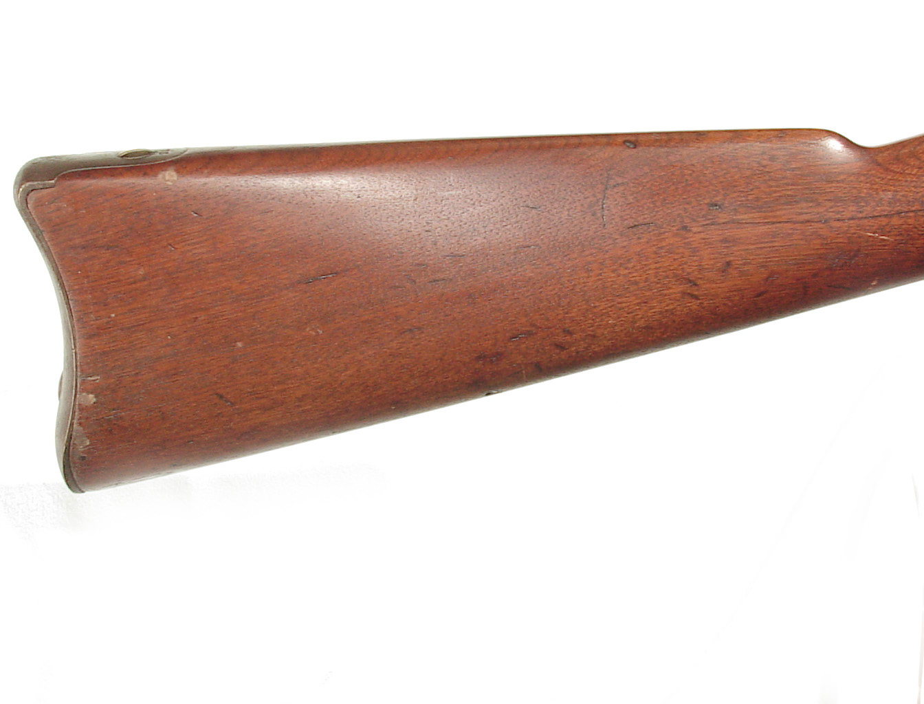 .45-70 caliber, 32 5/8″ barrel secured by two bands with the cleaning rod located underneath. Trapdoor action with external hammer and flat lock marked “US/SPRINGFIELD” Full length walnut stock bearing the U.S. inspector’s cartouche for (SWP/1880) on the left wrist. All parts finished blue with the breechblock and uppertang casehardened. In very fine original condition with the metal showing much blue fading to thinning with gray. Very nice with visible cartouche and the bore in excellent. Mechanically sound.