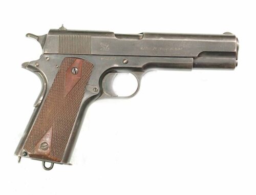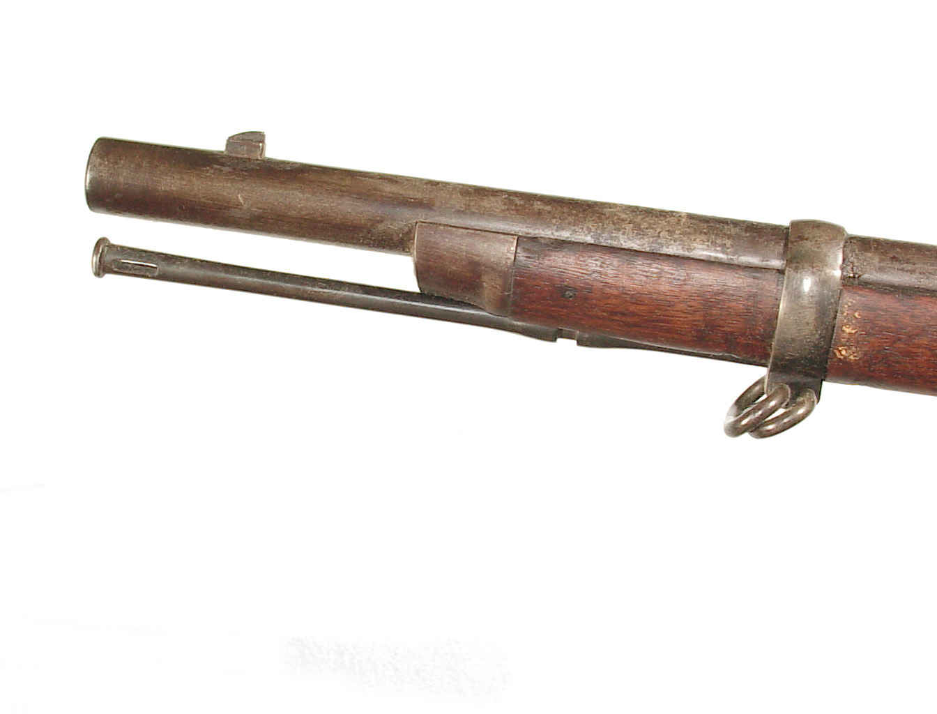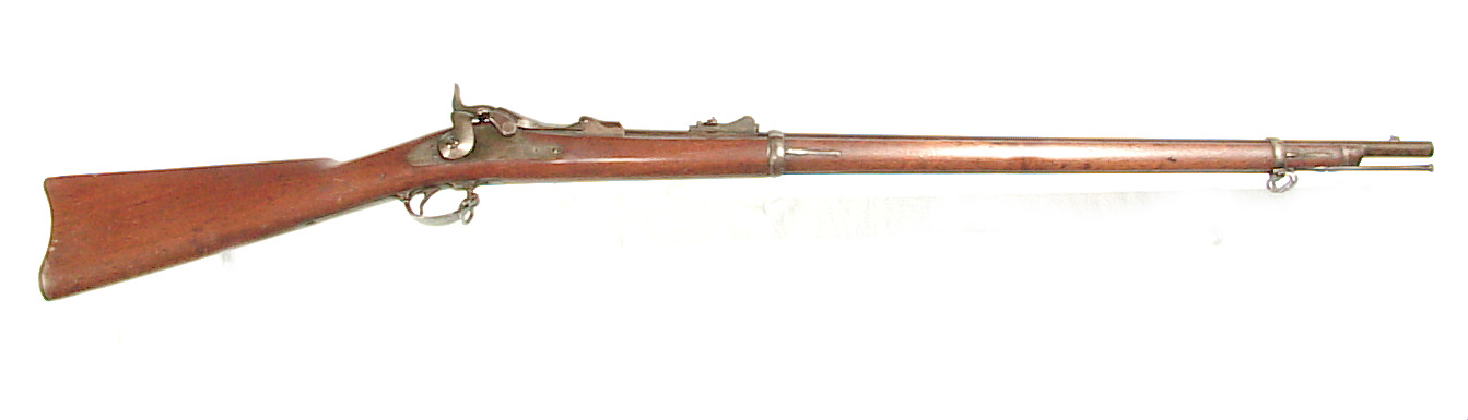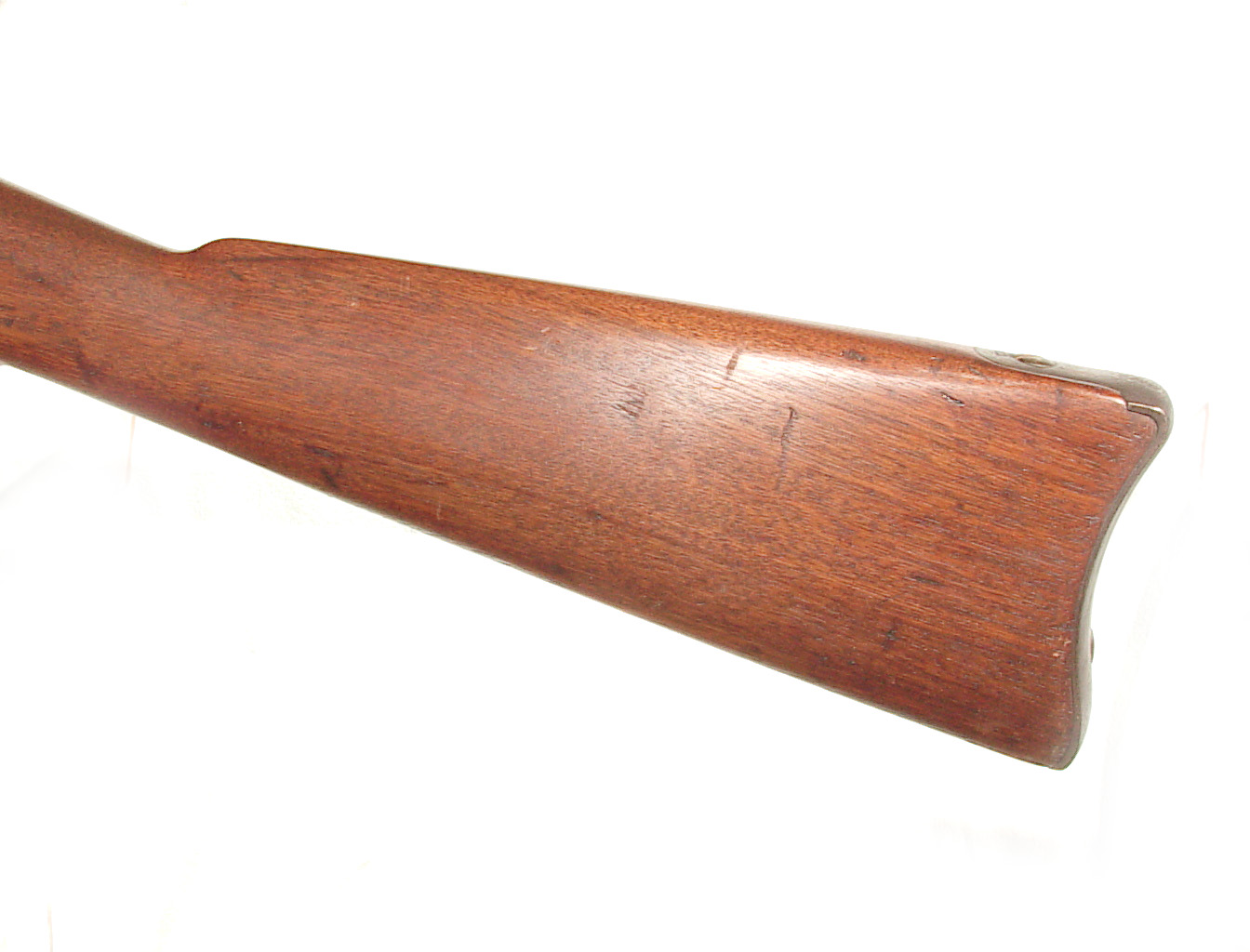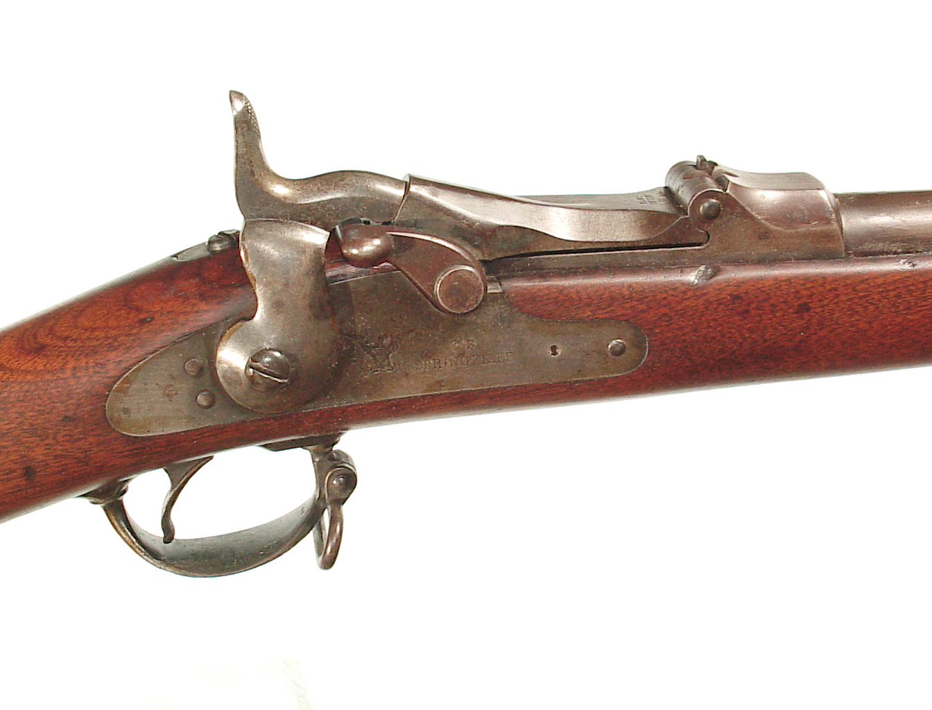 .45-70 caliber, 32 5/8″ barrel secured by two bands with the cleaning rod located underneath. Trapdoor action with external hammer and flat lock marked “US/SPRINGFIELD” Full length walnut stock bearing the U.S. inspector’s cartouche for (SWP/1880) on the left wrist. All parts finished blue with the breechblock and uppertang casehardened. In very fine original condition with the metal showing much blue fading to thinning with gray. Very nice with visible cartouche and the bore in excellent. Mechanically sound.
