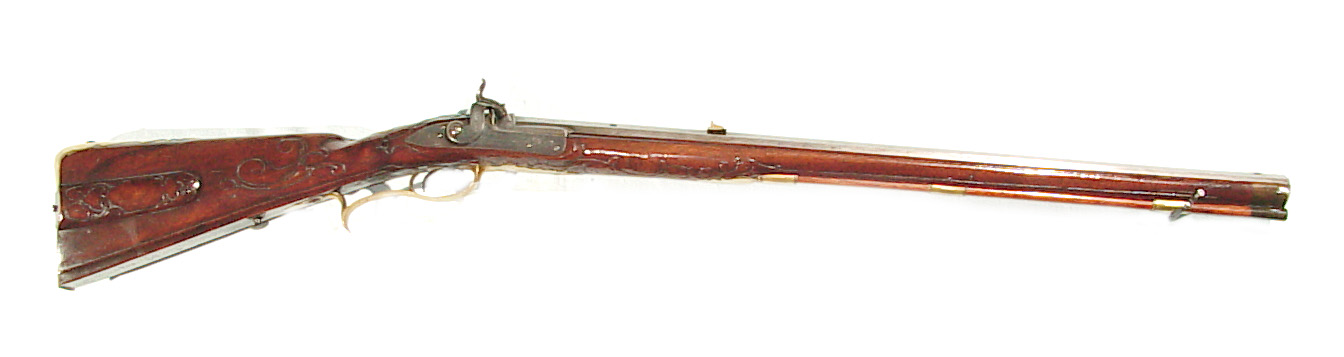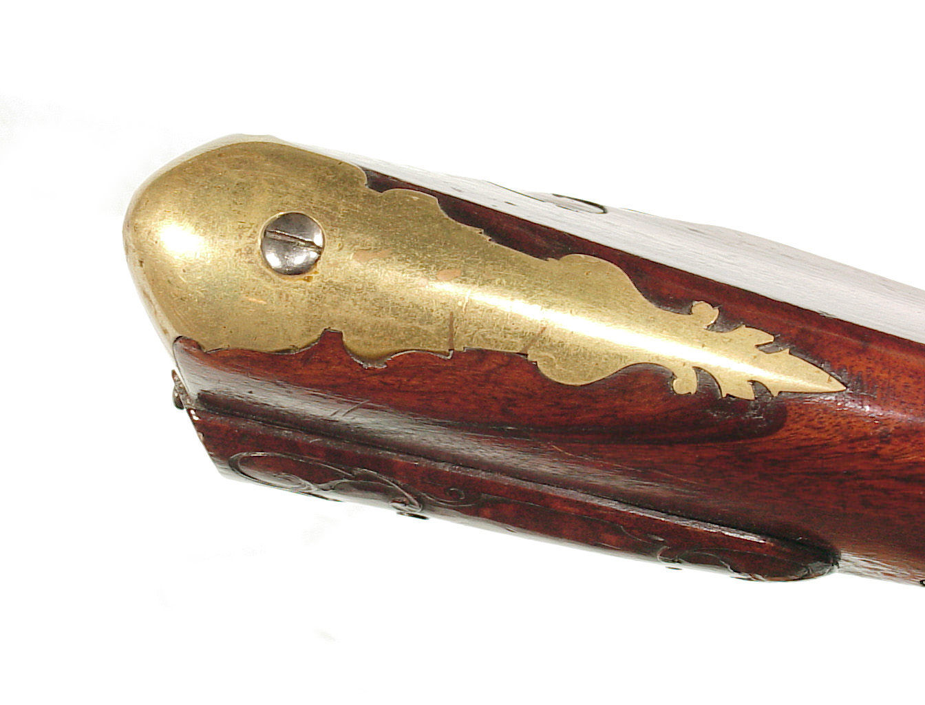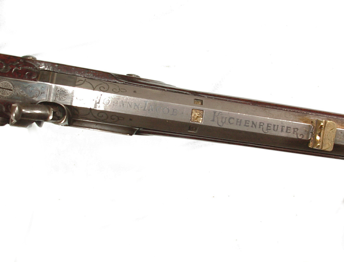 .64 caliber, 28″ full octagon and swamped barrel with “JOHANN JACOB KUCHENREUTER” in silver on the barrel flat and the maker’s touchmark in gold in 3 places. Full length incised & relief carved stock with sliding wooden patchbox. Brass mounts and triggerguard. The English percussion lock is signed “THOMAS SMITH, 55 PARLIAMENT ST”. A beautiful rifle with superb barrel and stock work of an earlier period by Kucheneruter ca. 1750-70. Brass mounts and triggerguard are also from the earlier period. Thomas Smith worked at the Parliament St. address from 1835-1839 when the conversion to percussion would have occurred. The percussion lock retains considerable casehardened finish and is mechanically excellent. Very high quality.