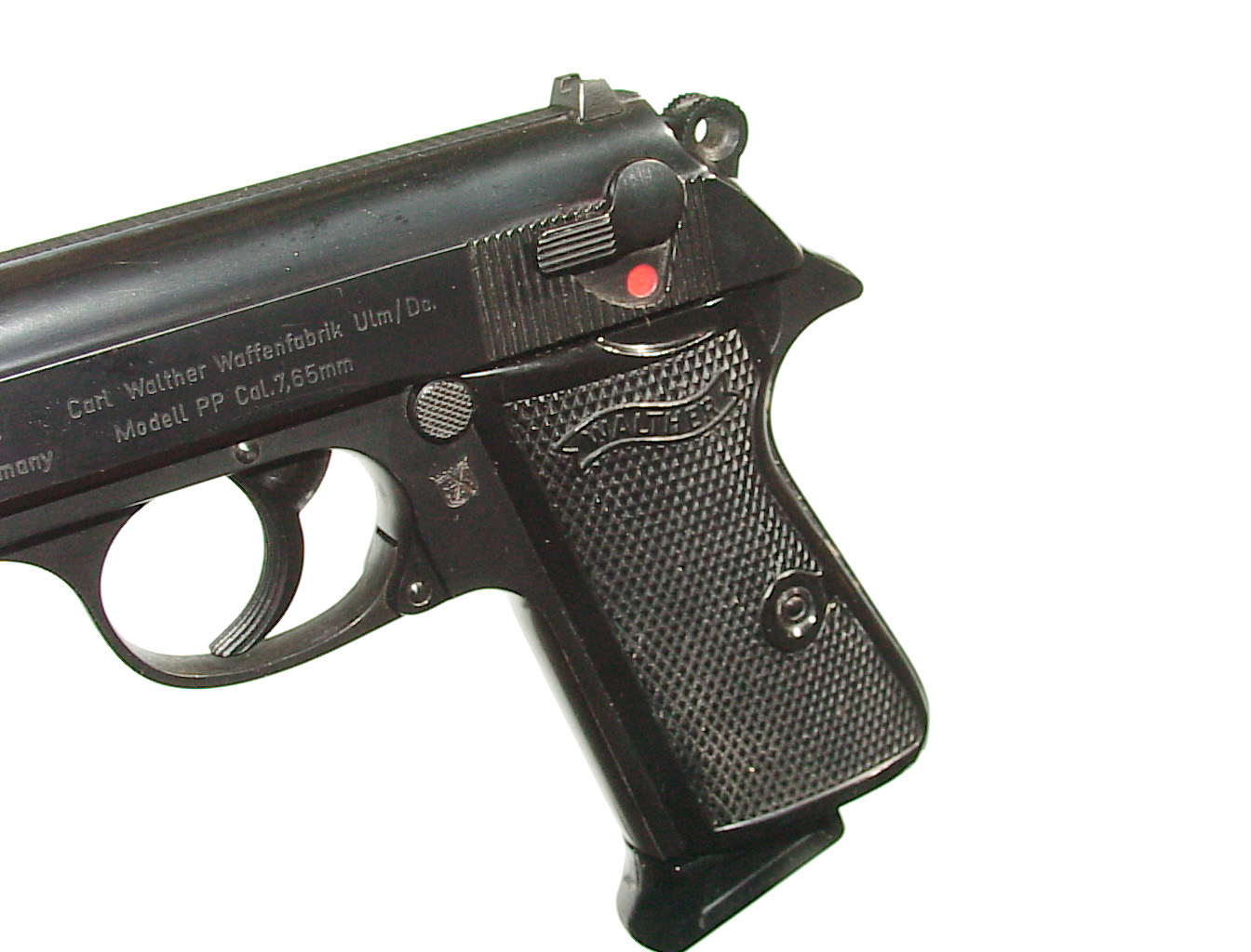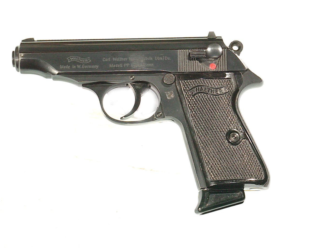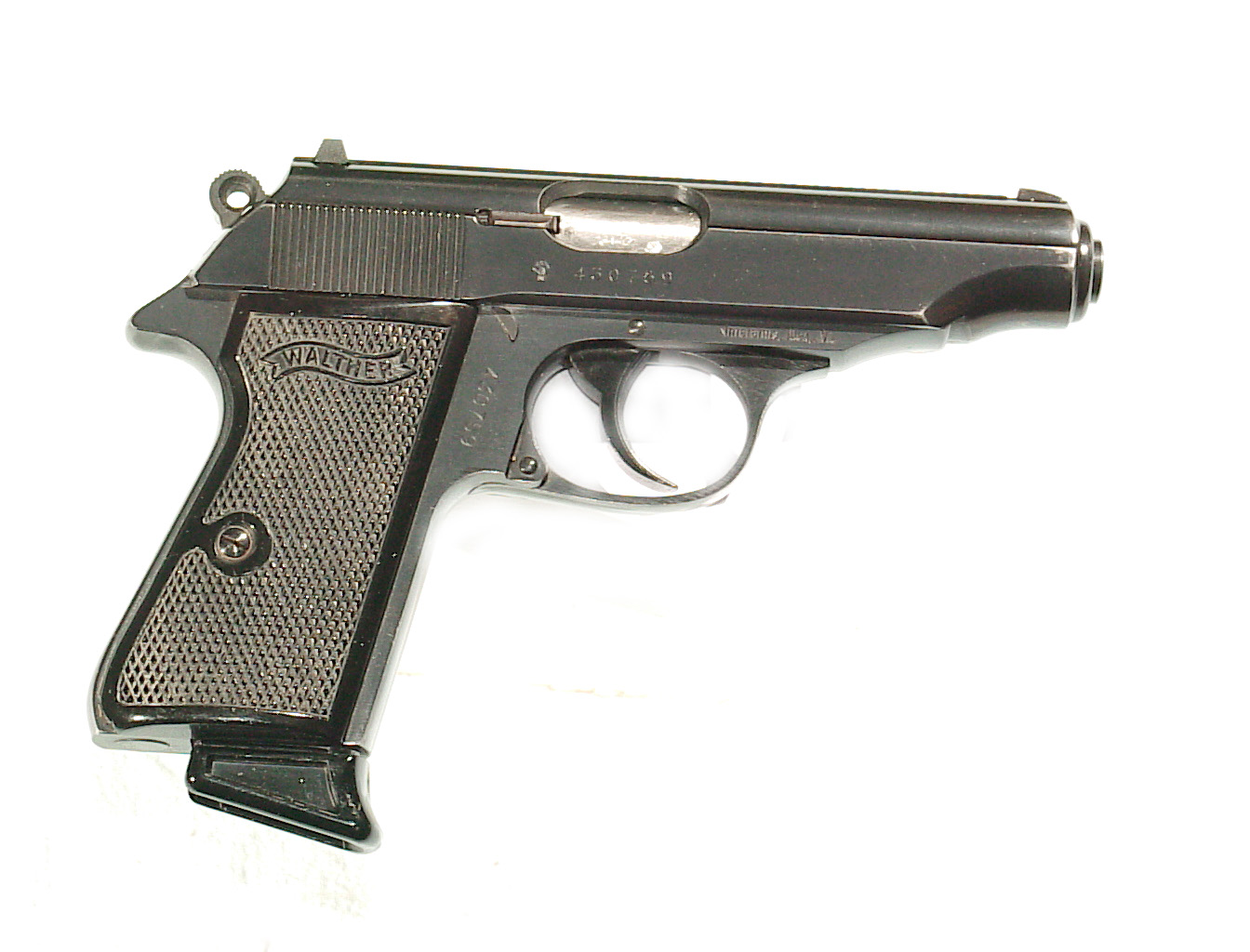 .32 a.c.p., double action semi-auto with external hammer and block type safety. Finished blue overall with black checkered plastic grips. In super condition retaining 98% plus blue with only some very minor highlighting at the muzzle from being in a holster. Mint bore and perfect mechanics. In it’s factory black plastic box.
