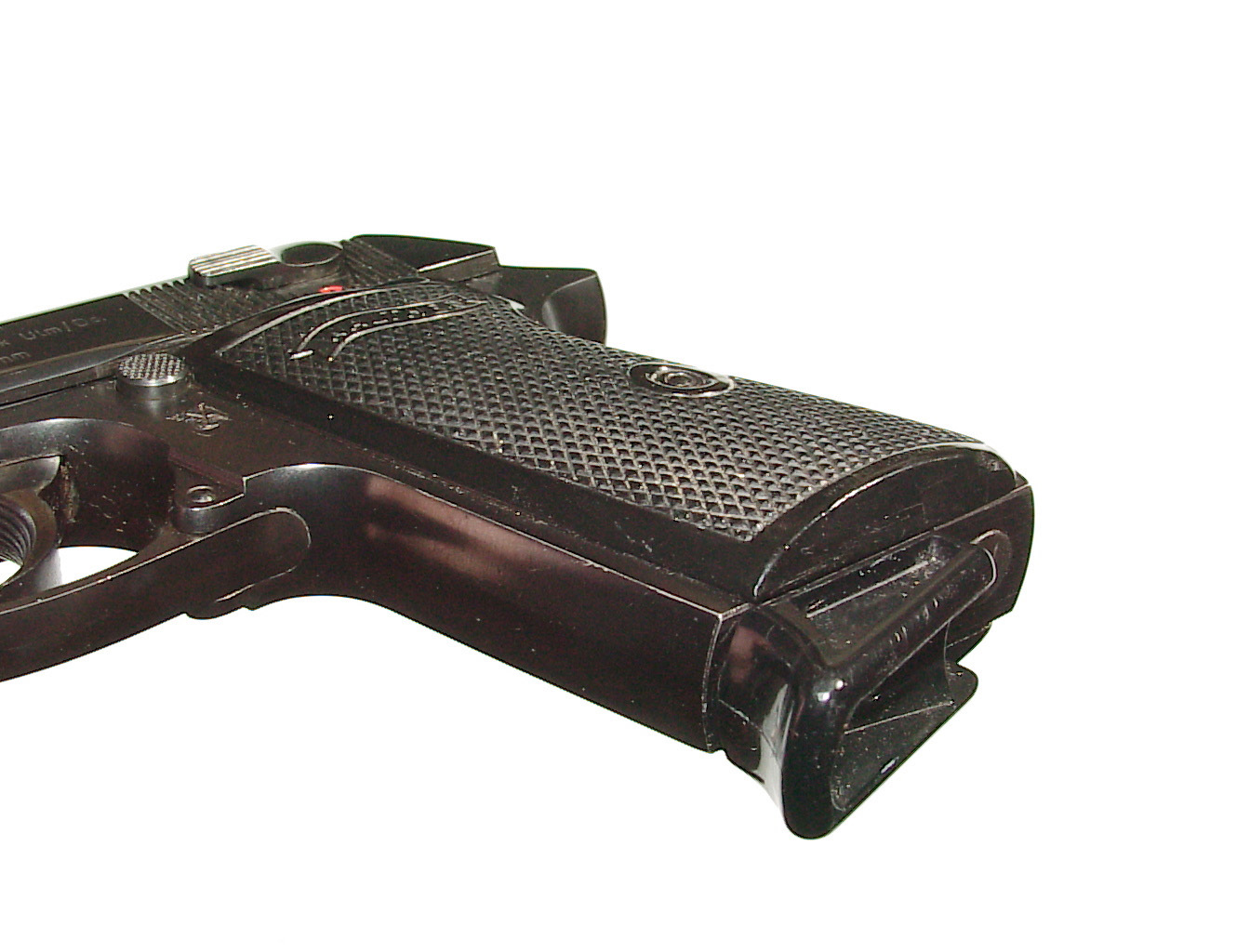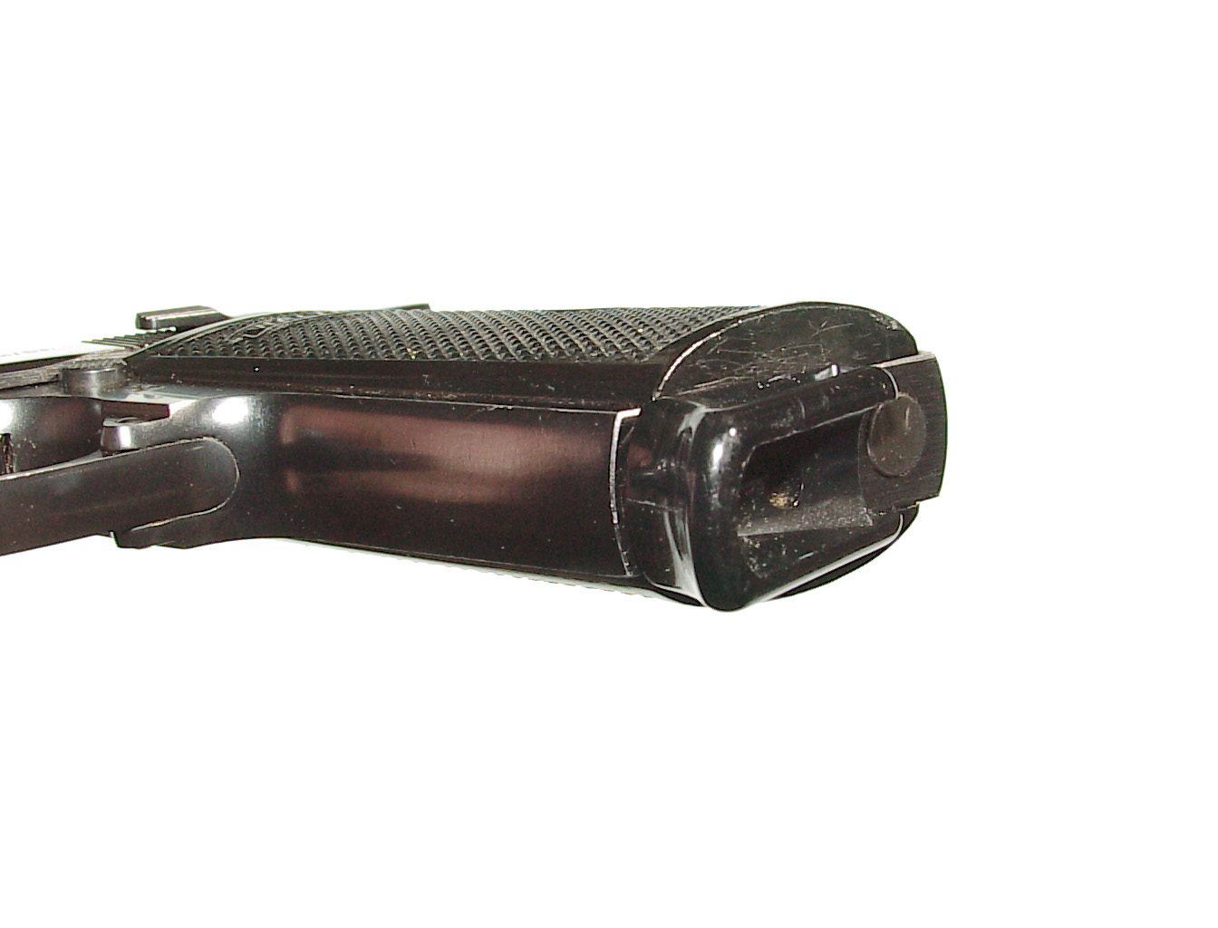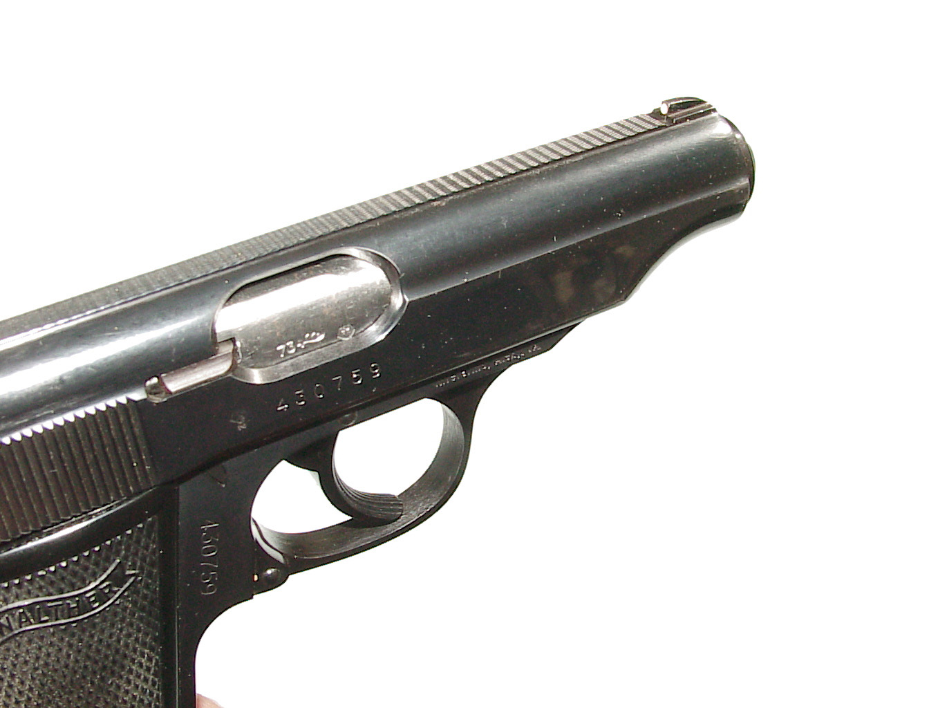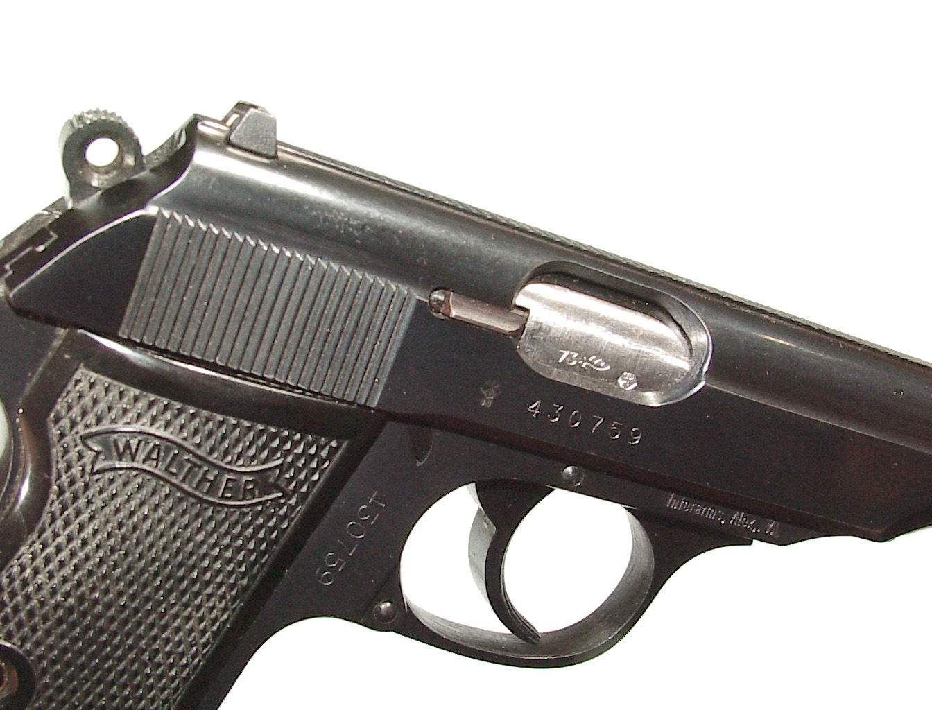 .32 a.c.p., double action semi-auto with external hammer and block type safety. Finished blue overall with black checkered plastic grips. In super condition retaining 98% plus blue with only some very minor highlighting at the muzzle from being in a holster. Mint bore and perfect mechanics. In it’s factory black plastic box.