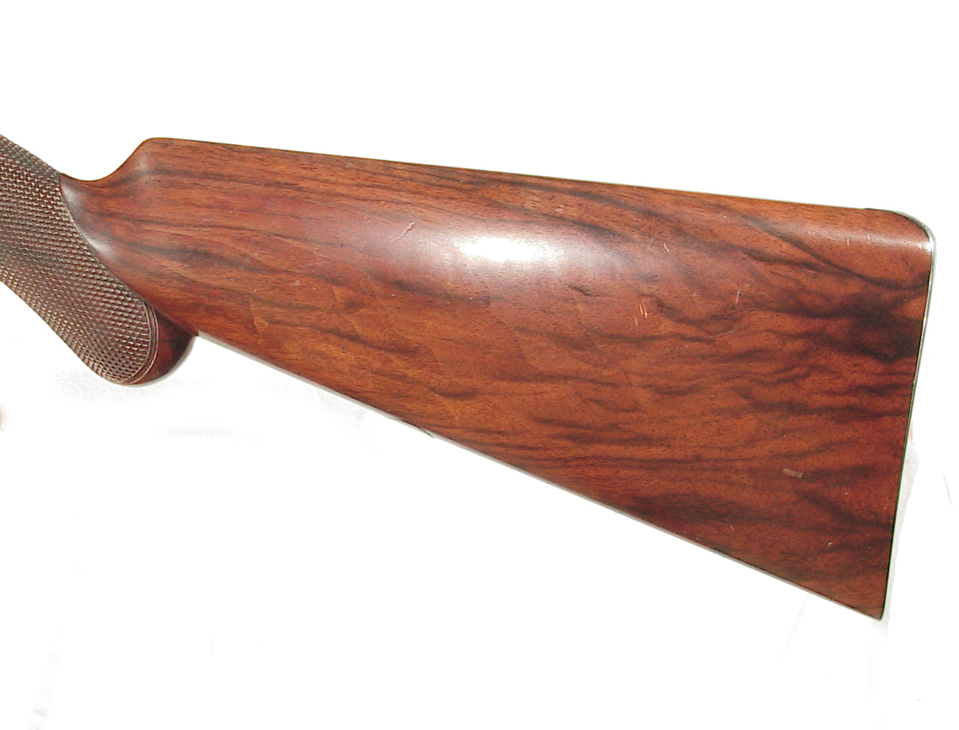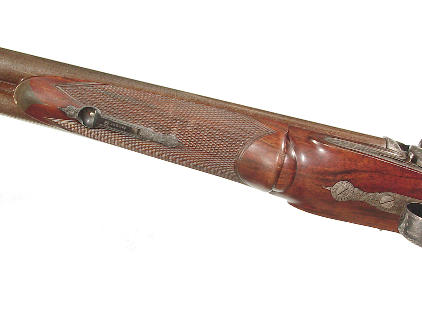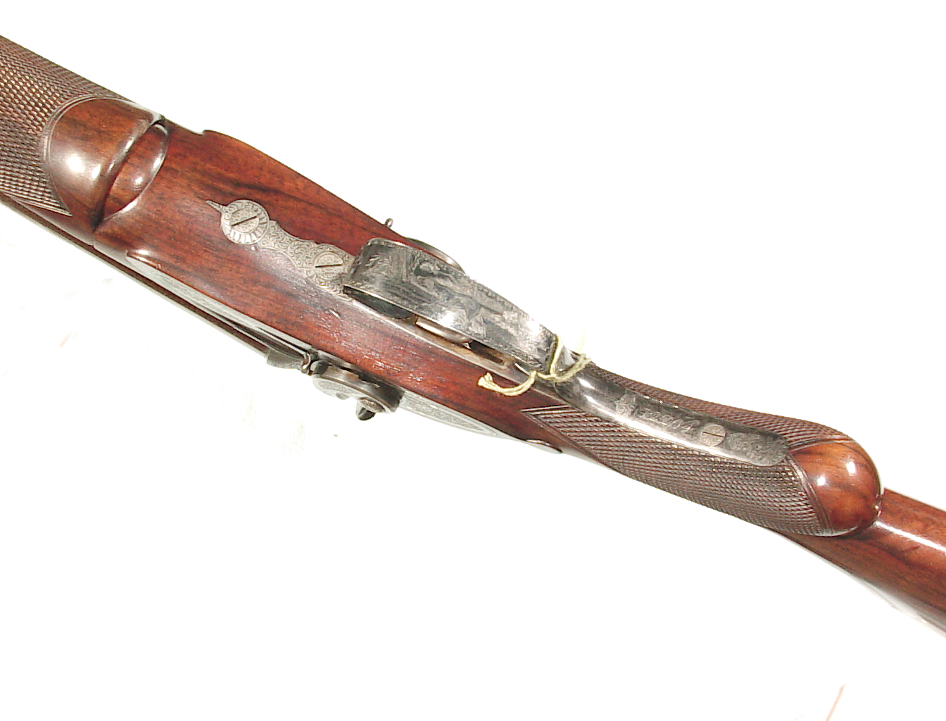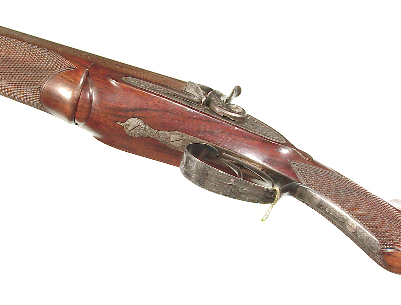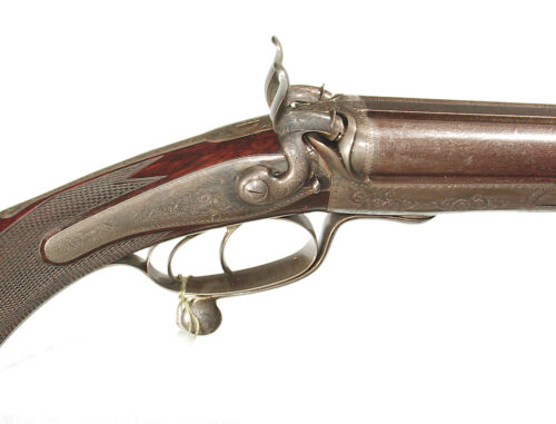 12 bore (gauge) 2 1/2″ chambers, 30″ damascus steel barrels with top bite. Bar in Wood engraved locks, early style hammers, rebounding. Top lever opening and double triggers. Checkered walnut forend and pistol grip buttstock ending with a steel buttplate. LOP: 14 1/4″. Weight; 6lbs 13oz. Engraved triggerguard depicting a pointing dog. In near new original condition with the barrels retaining 98% plus brown and damascus pattern. All off the casehardened finish on the locks and hammers. Top lever, and triggerguard show bright charcoal blue and the buttplate still has most of it’s blue finish. Minty wood and checkering. Perfect bores. Bores measure .733″ each. Choke both bores .005″