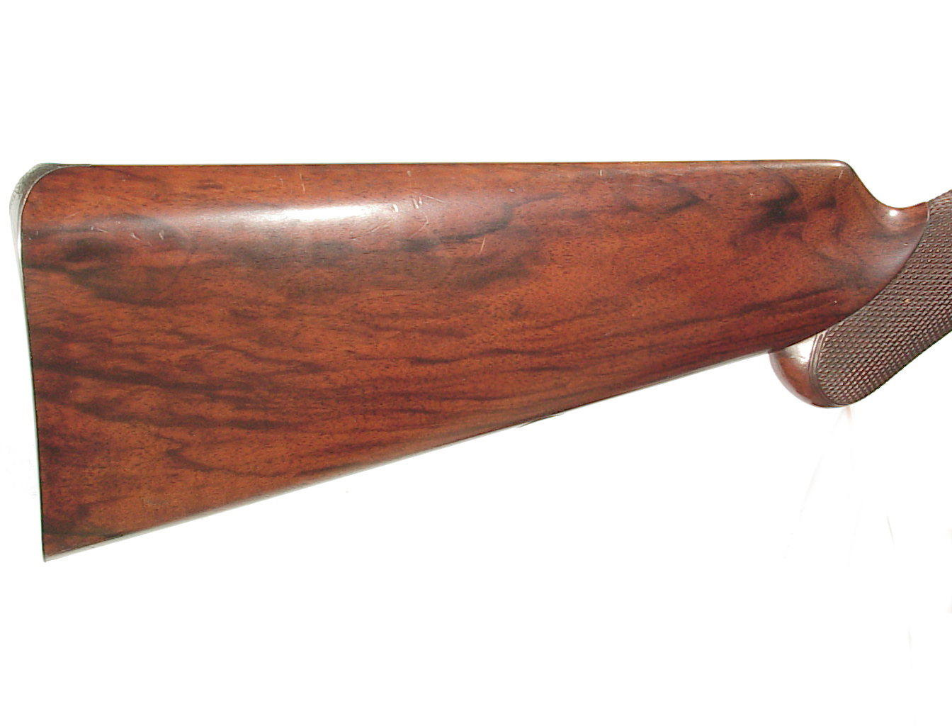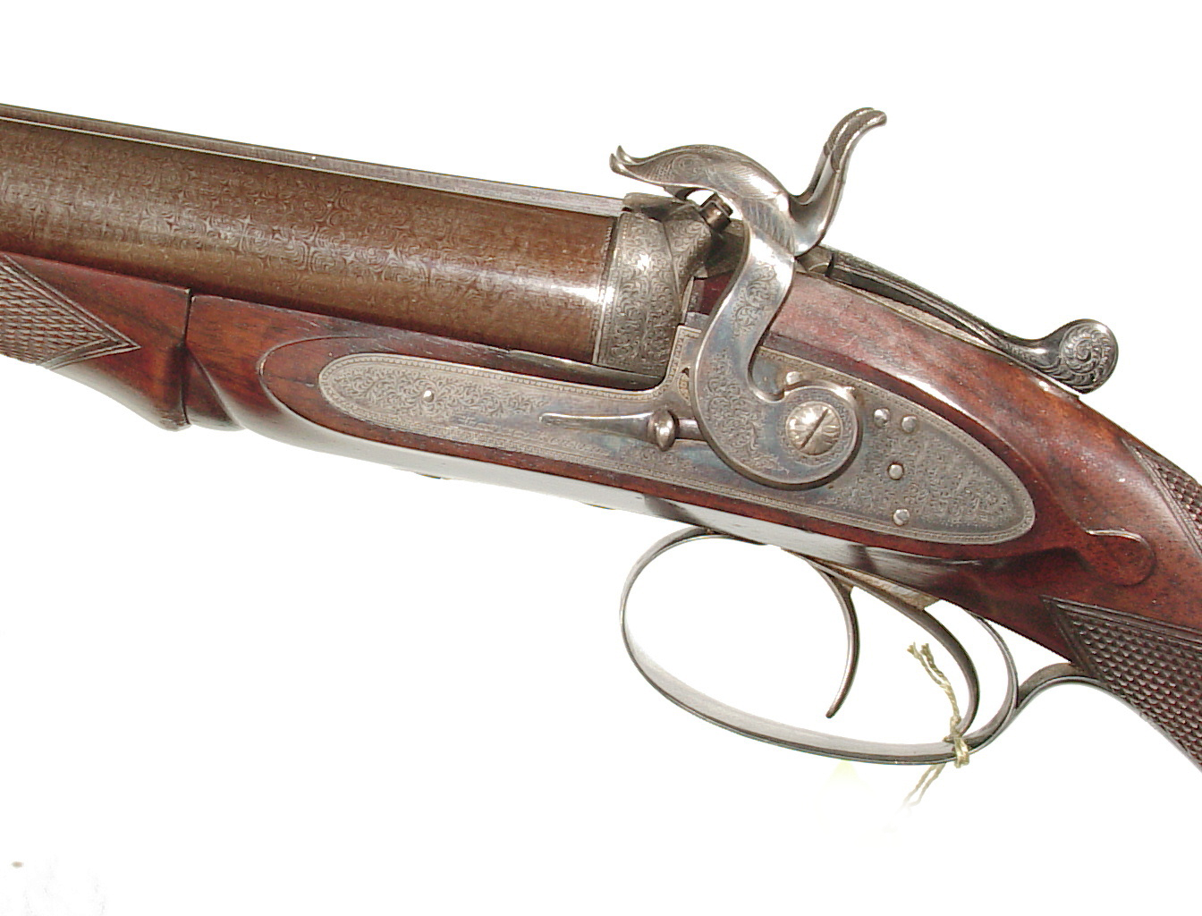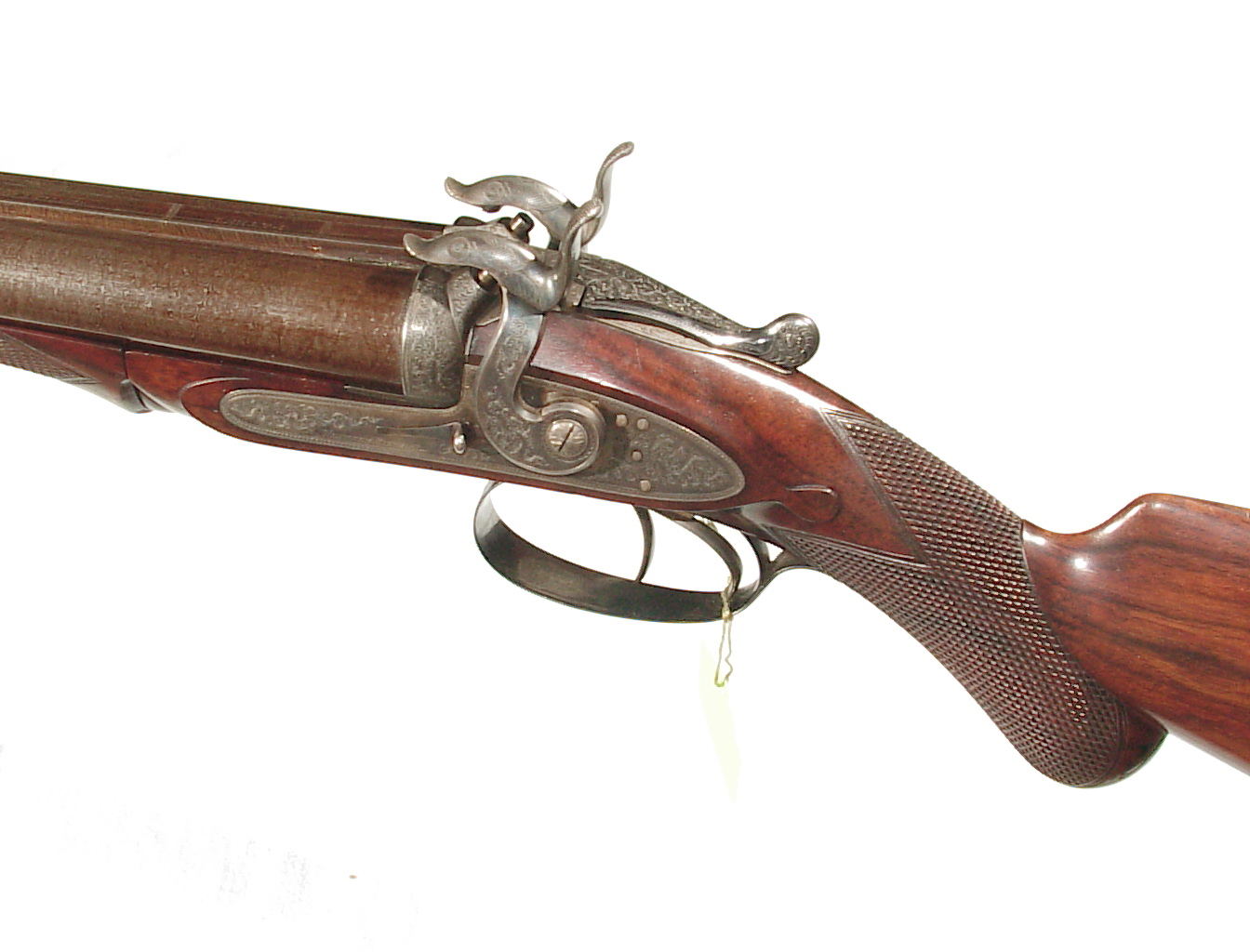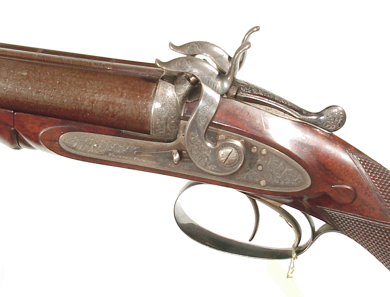 12 bore (gauge) 2 1/2″ chambers, 30″ damascus steel barrels with top bite. Bar in Wood engraved locks, early style hammers, rebounding. Top lever opening and double triggers. Checkered walnut forend and pistol grip buttstock ending with a steel buttplate. LOP: 14 1/4″. Weight; 6lbs 13oz. Engraved triggerguard depicting a pointing dog. In near new original condition with the barrels retaining 98% plus brown and damascus pattern. All off the casehardened finish on the locks and hammers. Top lever, and triggerguard show bright charcoal blue and the buttplate still has most of it’s blue finish. Minty wood and checkering. Perfect bores. Bores measure .733″ each. Choke both bores .005″