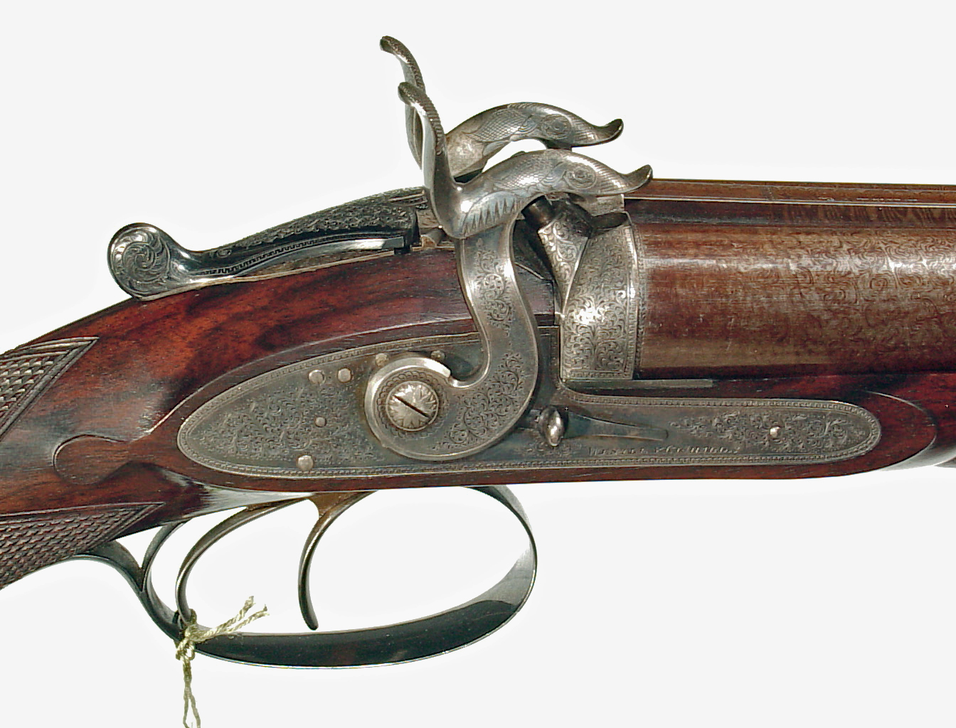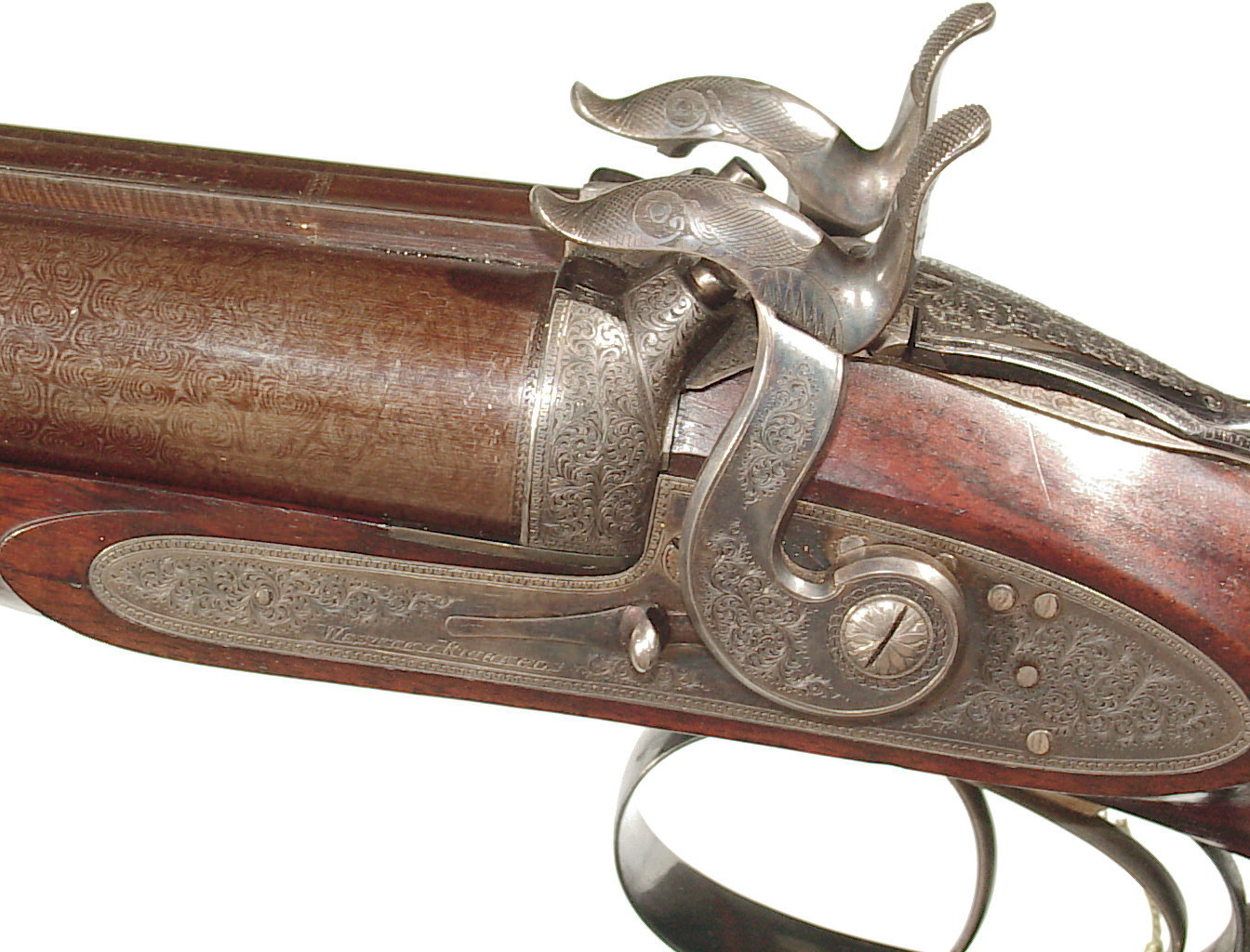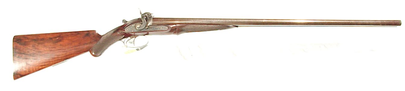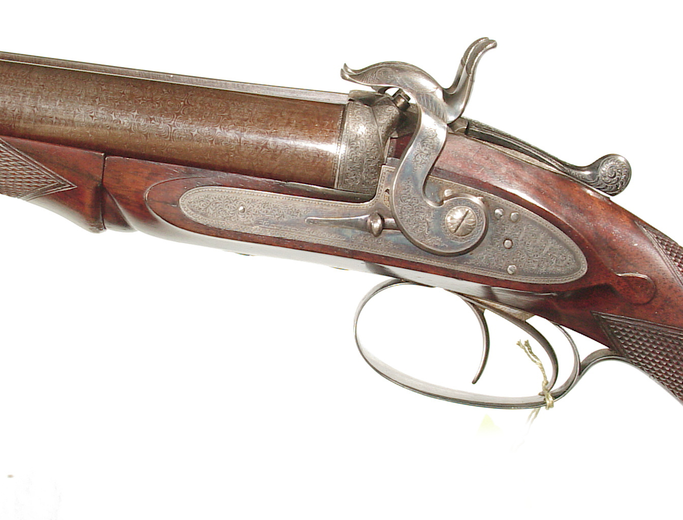 12 bore (gauge) 2 1/2″ chambers, 30″ damascus steel barrels with top bite. Bar in Wood engraved locks, early style hammers, rebounding. Top lever opening and double triggers. Checkered walnut forend and pistol grip buttstock ending with a steel buttplate. LOP: 14 1/4″. Weight; 6lbs 13oz. Engraved triggerguard depicting a pointing dog. In near new original condition with the barrels retaining 98% plus brown and damascus pattern. All off the casehardened finish on the locks and hammers. Top lever, and triggerguard show bright charcoal blue and the buttplate still has most of it’s blue finish. Minty wood and checkering. Perfect bores. Bores measure .733″ each. Choke both bores .005″