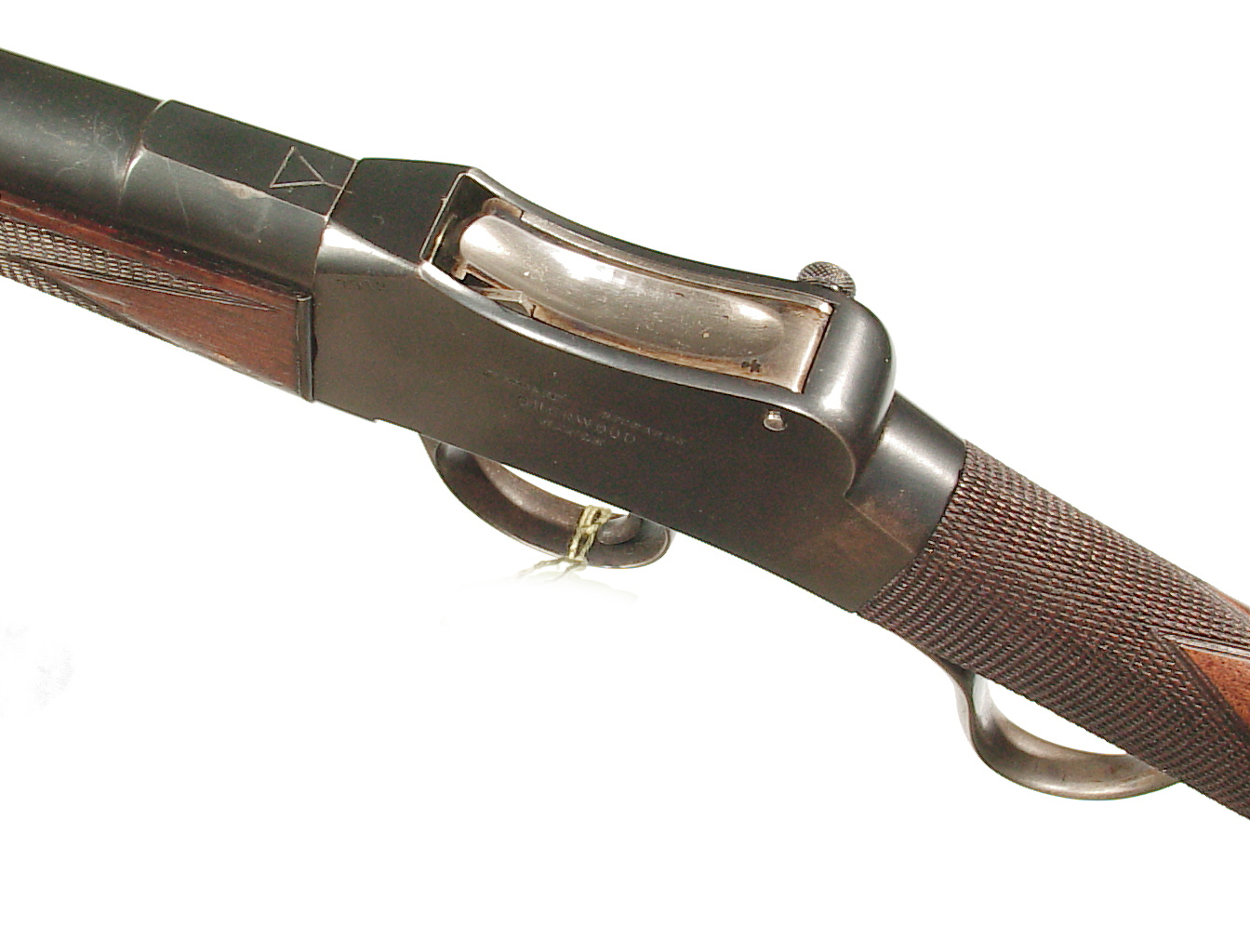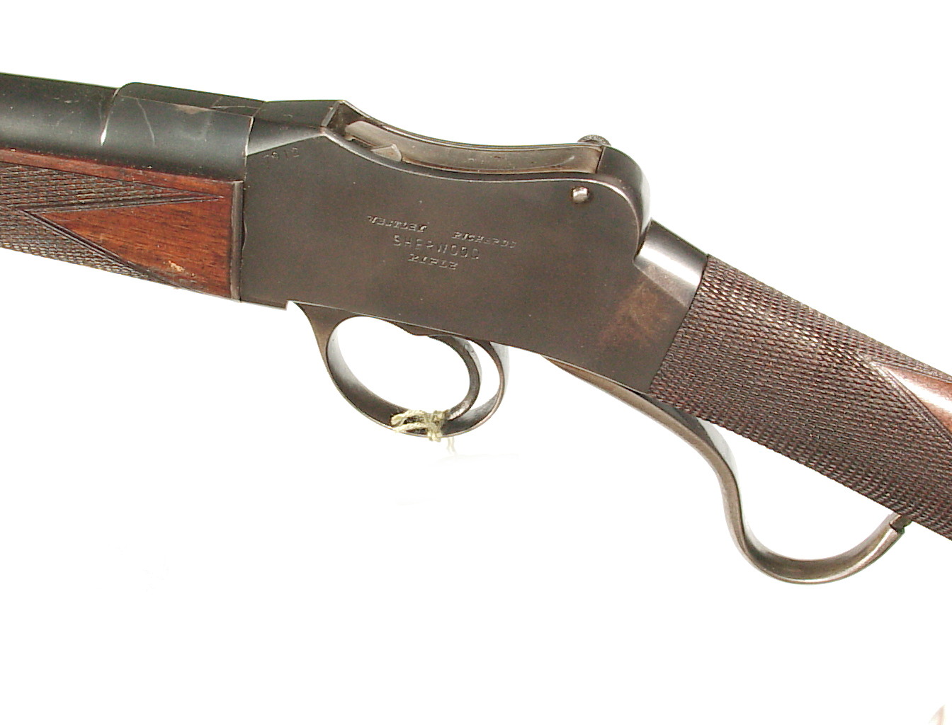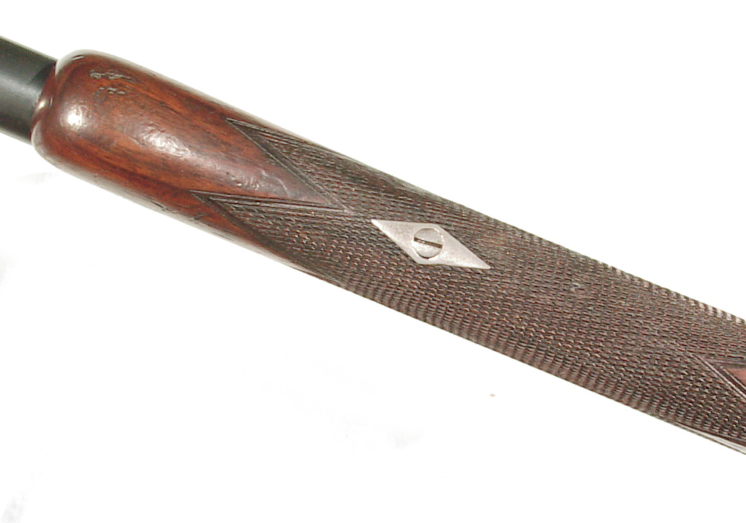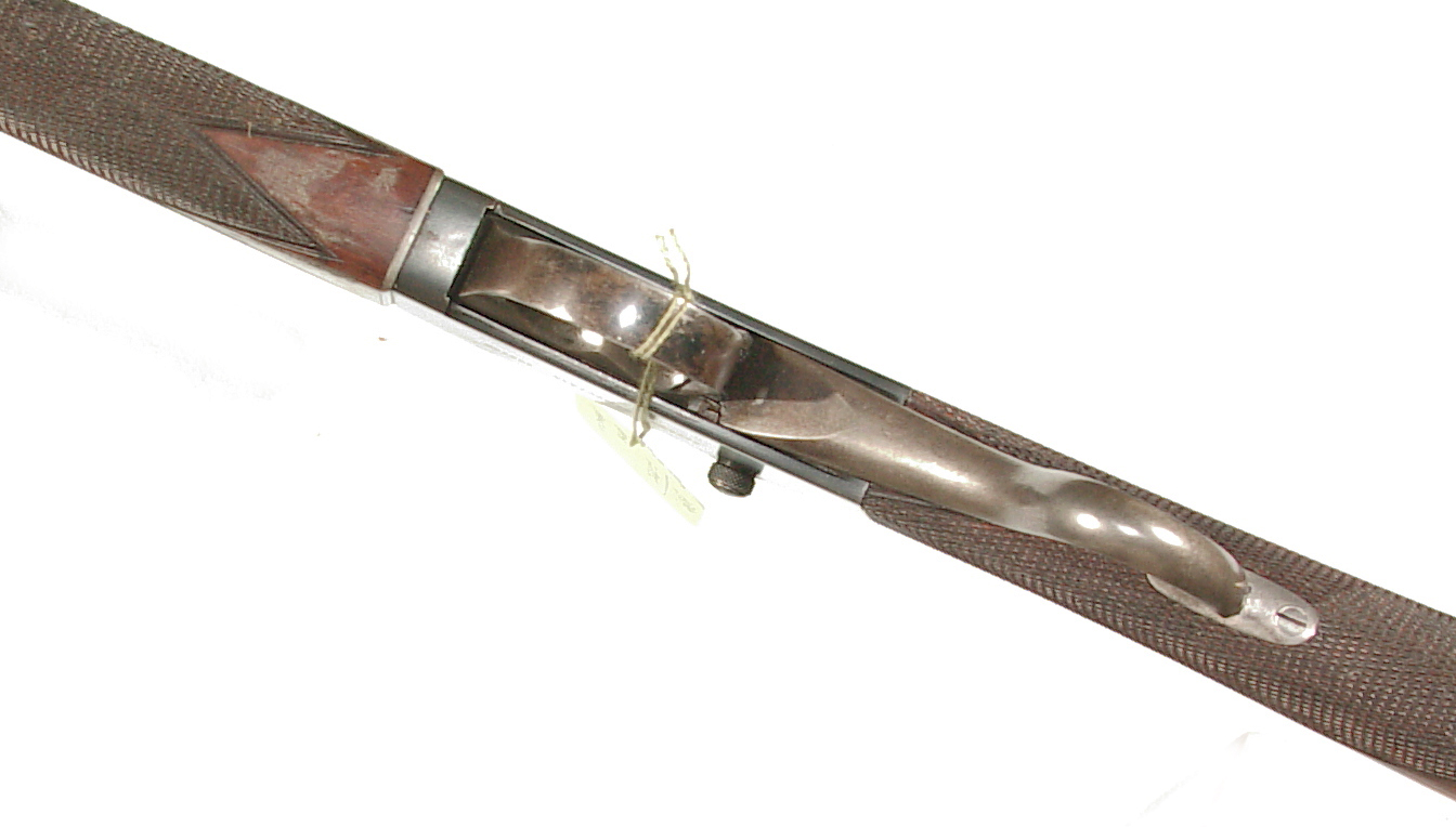 .300 Sherwood caliber. 27.5″ round barrel with raised rib front sight and two leaf folding rear on a raised rib. Lever actuated hinged breech Martini action. Checkered forend and straight grip buttstock beautifully figured wood and ending with a steel buttplate. In super original condition retaining 98-99% blue, mint bore, and excellent wood and checkering. One of the very nicest of these I have had.