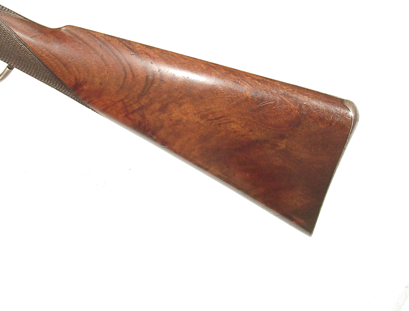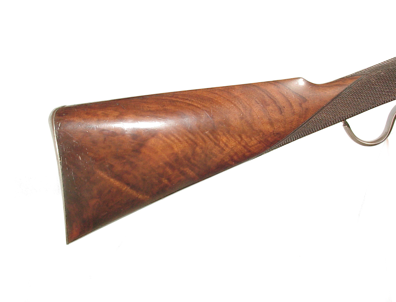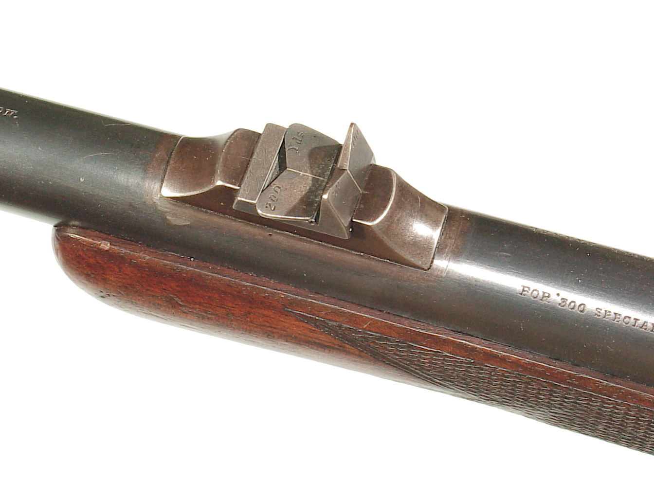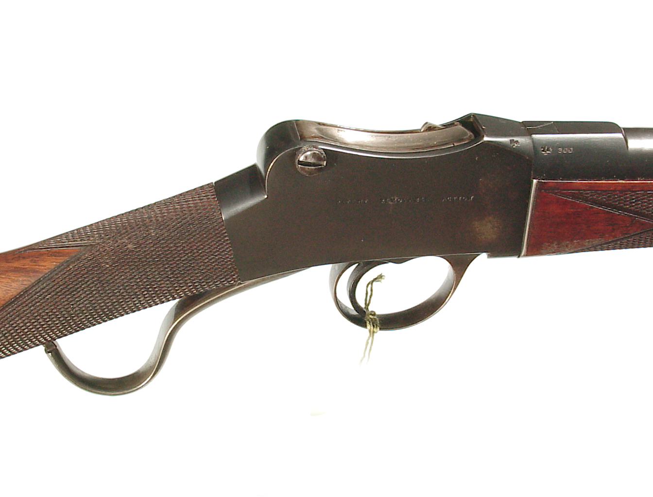 .300 Sherwood caliber. 27.5″ round barrel with raised rib front sight and two leaf folding rear on a raised rib. Lever actuated hinged breech Martini action. Checkered forend and straight grip buttstock beautifully figured wood and ending with a steel buttplate. In super original condition retaining 98-99% blue, mint bore, and excellent wood and checkering. One of the very nicest of these I have had.