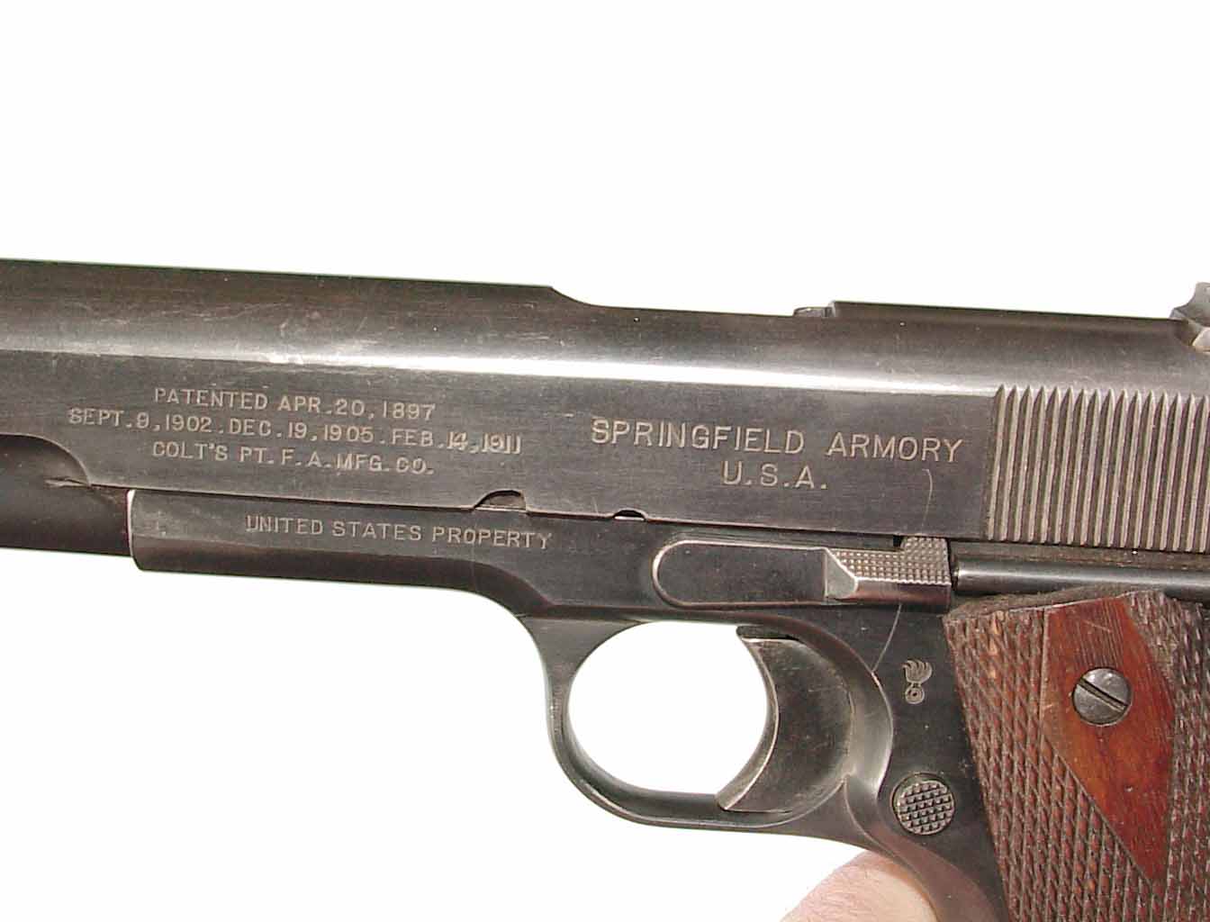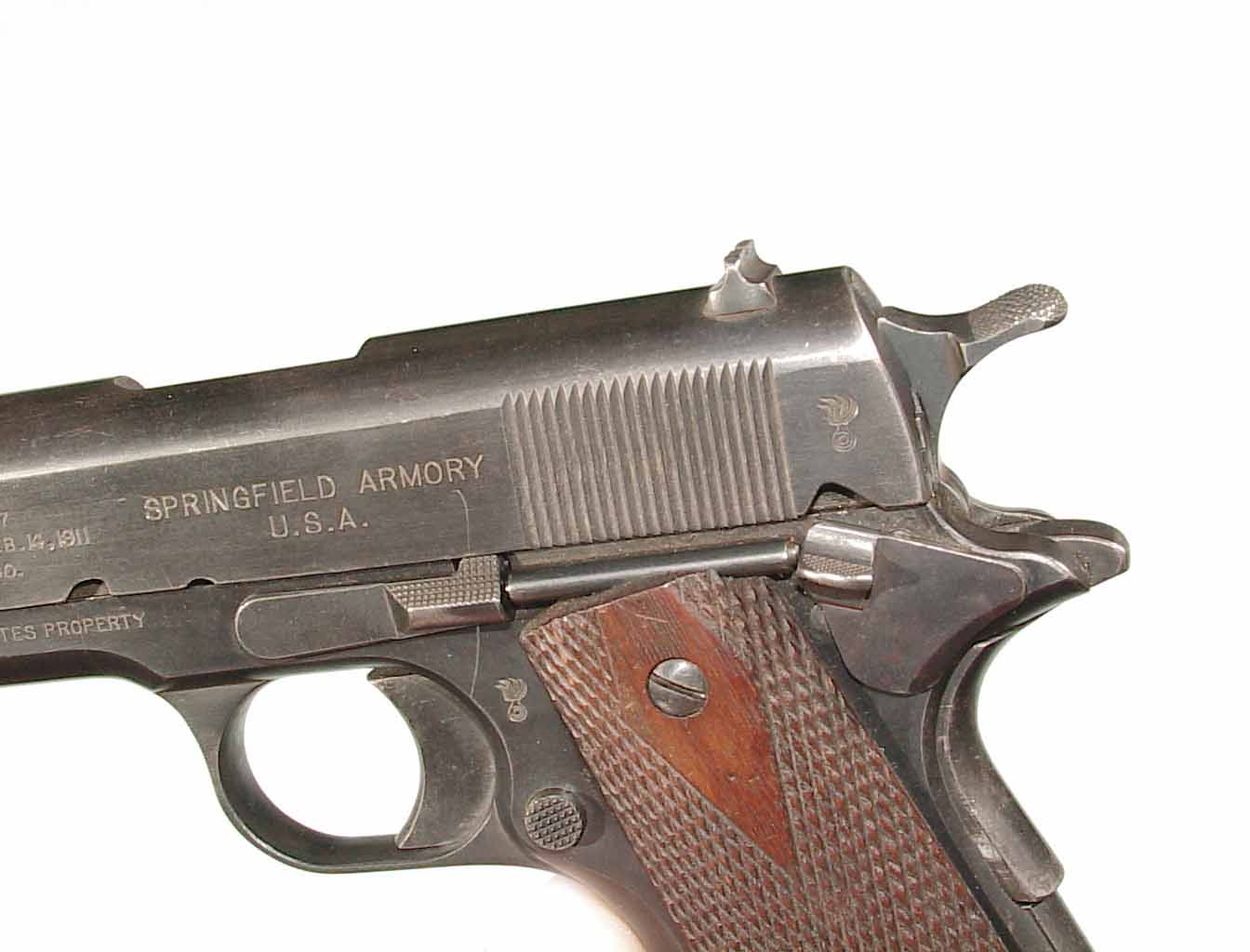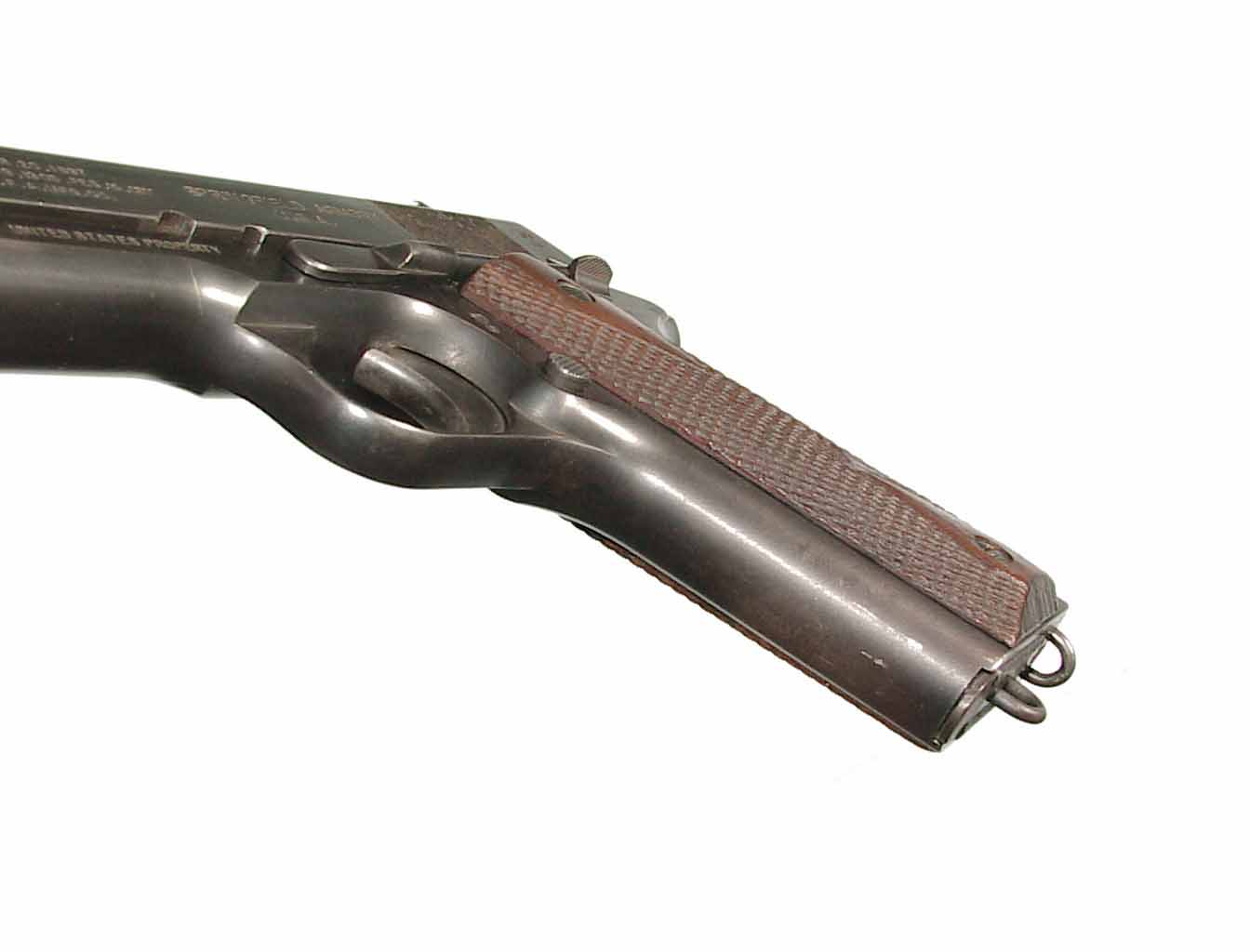 .45 acp caliber, 5″ barrel, finished blue overall with arsenal original checkered wooden grips. The left of the slide shows “SPRINGFIELD ARMORY/ U.S.A.” and the bursting bomb at the rear. The left side and the receiver is stamped “UNITED STATES PROPERTY” along with the bursting bomb on the receiver. The right side of the slide has the standing Eagle. Correct two tone magazine with crimped floorplate and lanyard ring. In excellent original condition retaining most of the blue, nice grips and mint bore. Mechanical functioning is perfect.