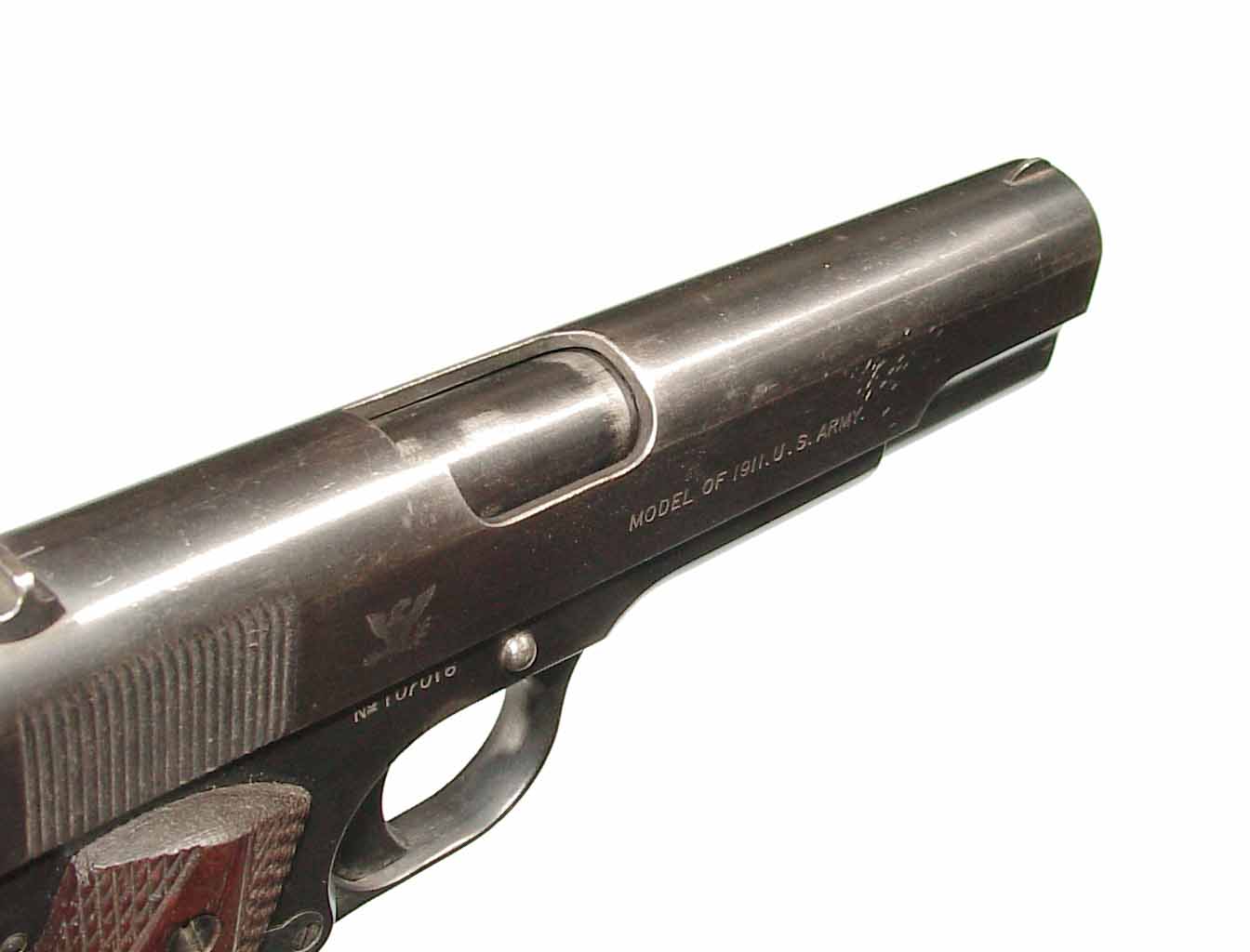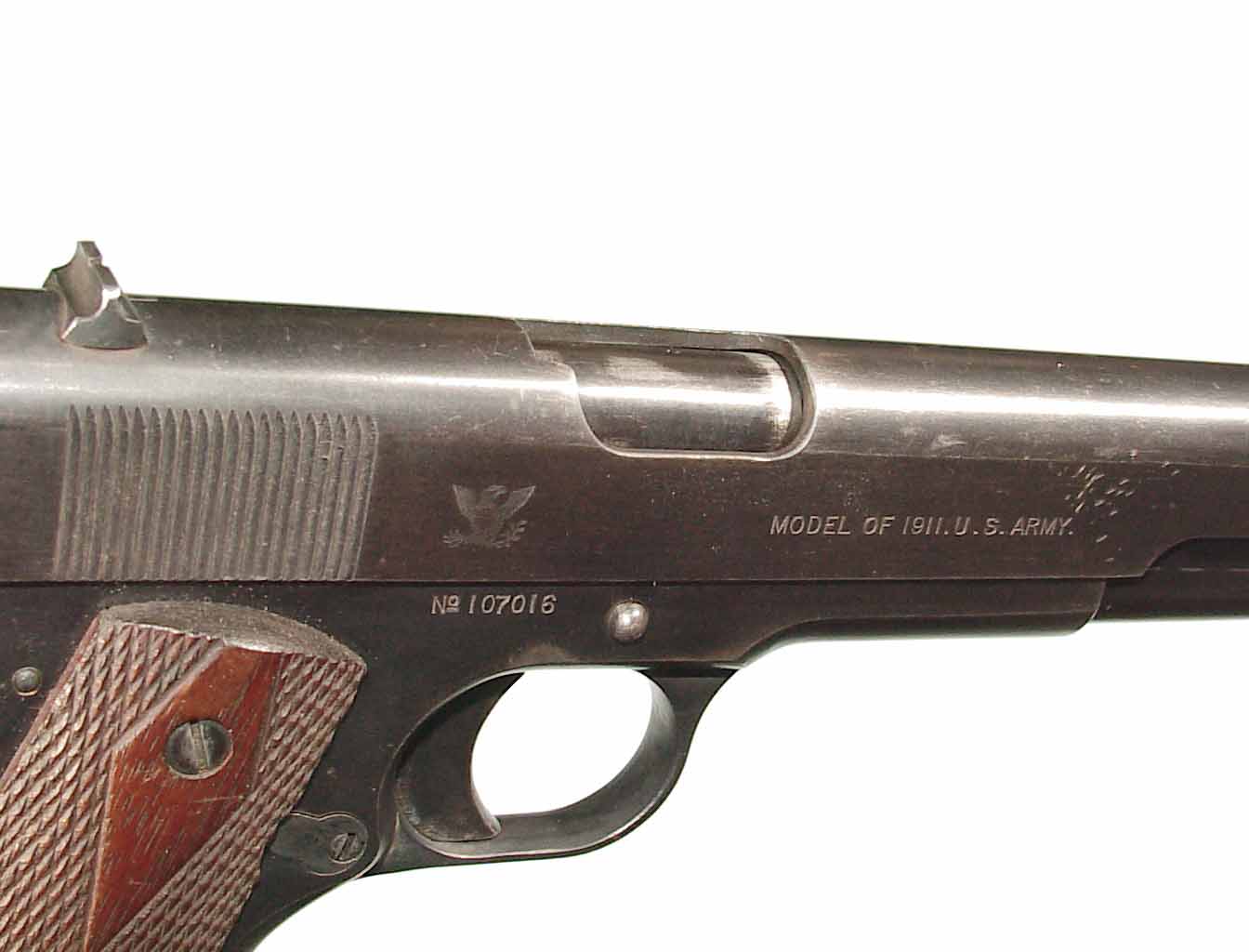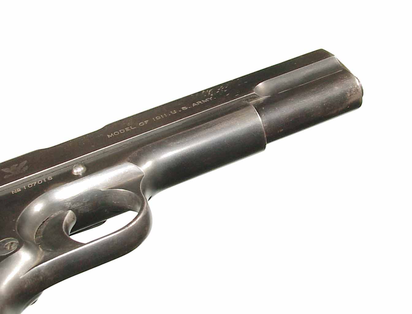 .45 acp caliber, 5″ barrel, finished blue overall with arsenal original checkered wooden grips. The left of the slide shows “SPRINGFIELD ARMORY/ U.S.A.” and the bursting bomb at the rear. The left side and the receiver is stamped “UNITED STATES PROPERTY” along with the bursting bomb on the receiver. The right side of the slide has the standing Eagle. Correct two tone magazine with crimped floorplate and lanyard ring. In excellent original condition retaining most of the blue, nice grips and mint bore. Mechanical functioning is perfect.